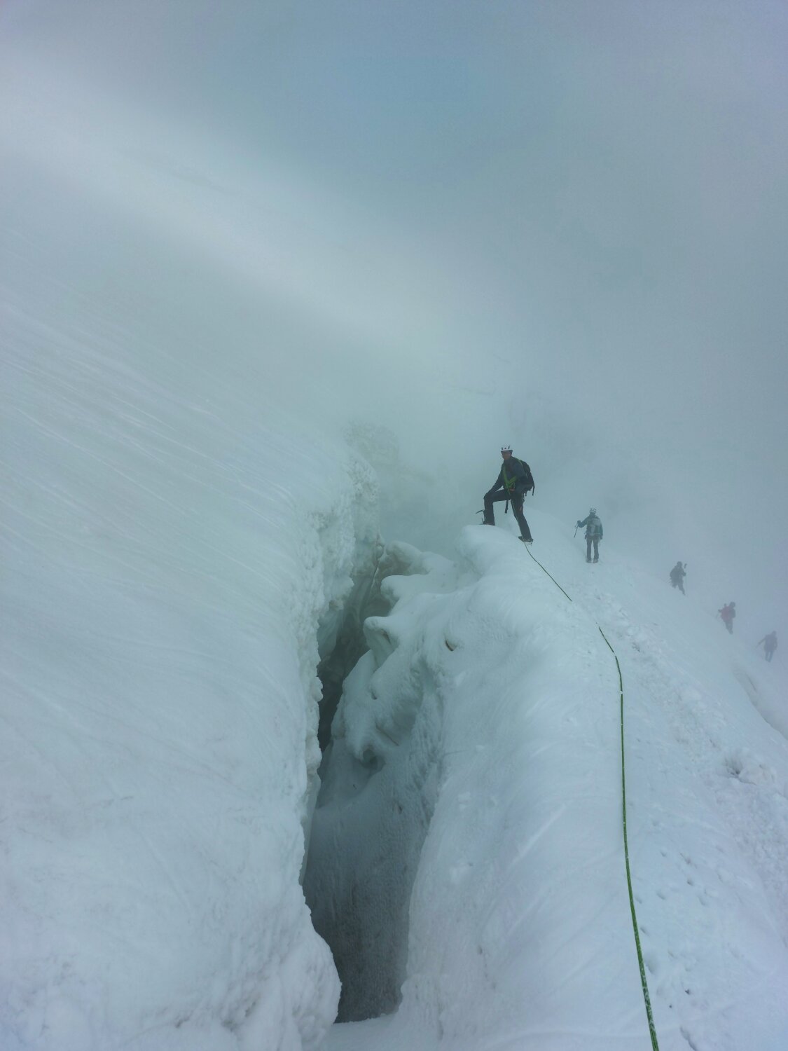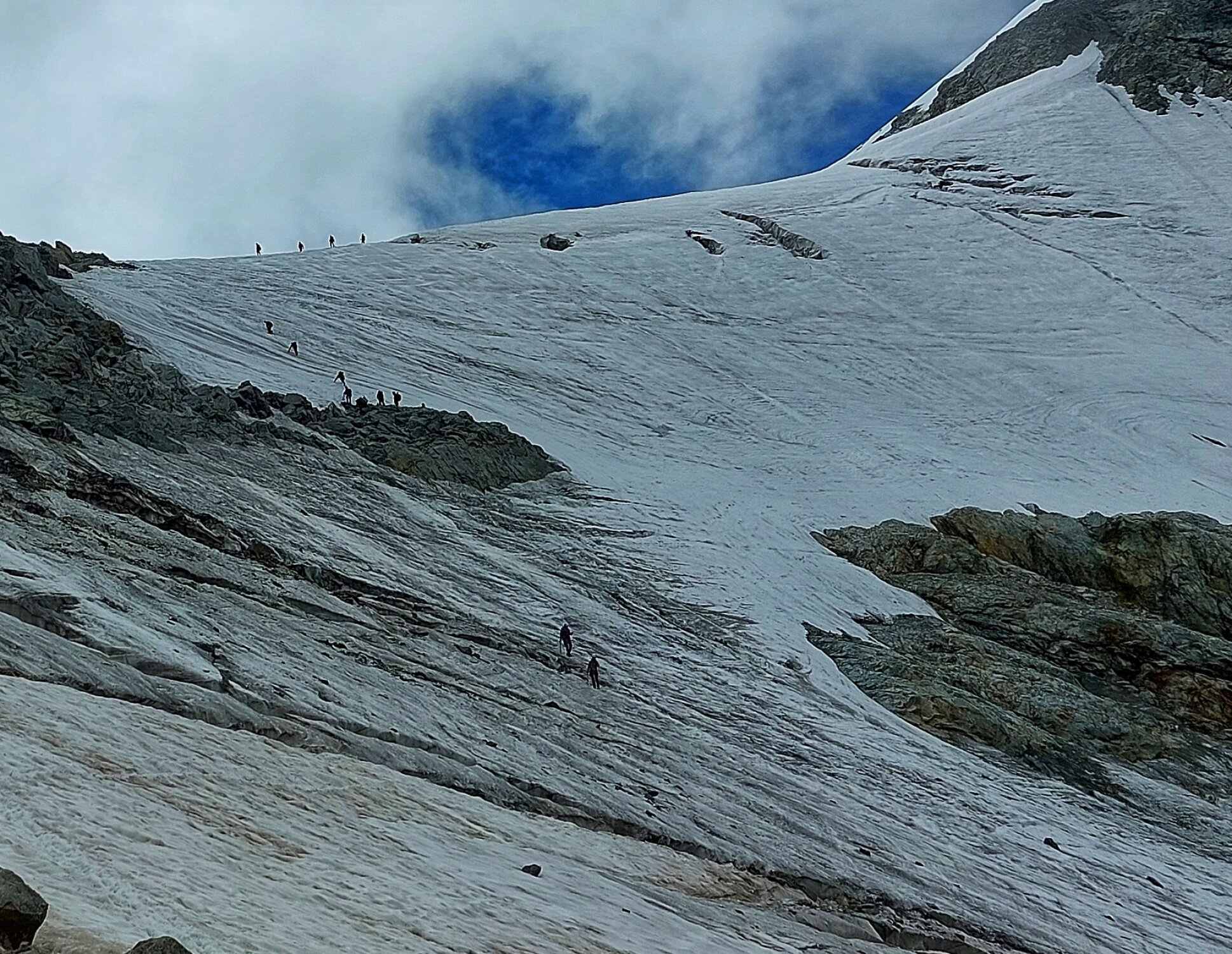 Sehr gute Verhältnisse am Spraunzagrat, Fels trocken und schneefrei. Im Abstieg über den Gletscher (Südost) bis 3430 Meter guter Trittschnee, auch wenn die Spur etwas mehlig war. Spalten können gut überquert werden. Tschiervagletscher (Nord) unterhalb 3400 blank, oben im Steilhang mit einigen ins Eis gebohrten Stangen versehen, Abstieg mit Steigeisen jedoch problemlos, einige haben zusätzlich geschraubt. Abstieg über Tschiervahütte.