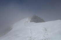 SE-Sporn hat im Geröllbereich gute Trittspuren, sonst ausreichend gute Borhaken und spassige Kletterei, wenn auch etwas kurz im Verhältniss zum Schuttweg. Ab Ausstieg Galengrat ca. 5 cm Neuschnee auf weichem, angetauten Eis, die Steigeisen halten gut, die Schrauben blieben im Rucksack. Am Gipfel etwas trauriger Anblick, die typische Wächte am Gipfel ist in der Höhe seit meinem letzten Besuch 2021 um 10m geschrumpft.