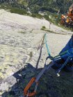 Ein relativ wichtiger BH an einer der wenigen etwas schwierigeren Stellen, oberhalb einer schrägen Rinne, ist aktuell allerdings kaum noch nutzbar, ein sehr dünner Karabiner oder eine dünne Prusikschlinge oder Bandschlinge sind dort nötig.
