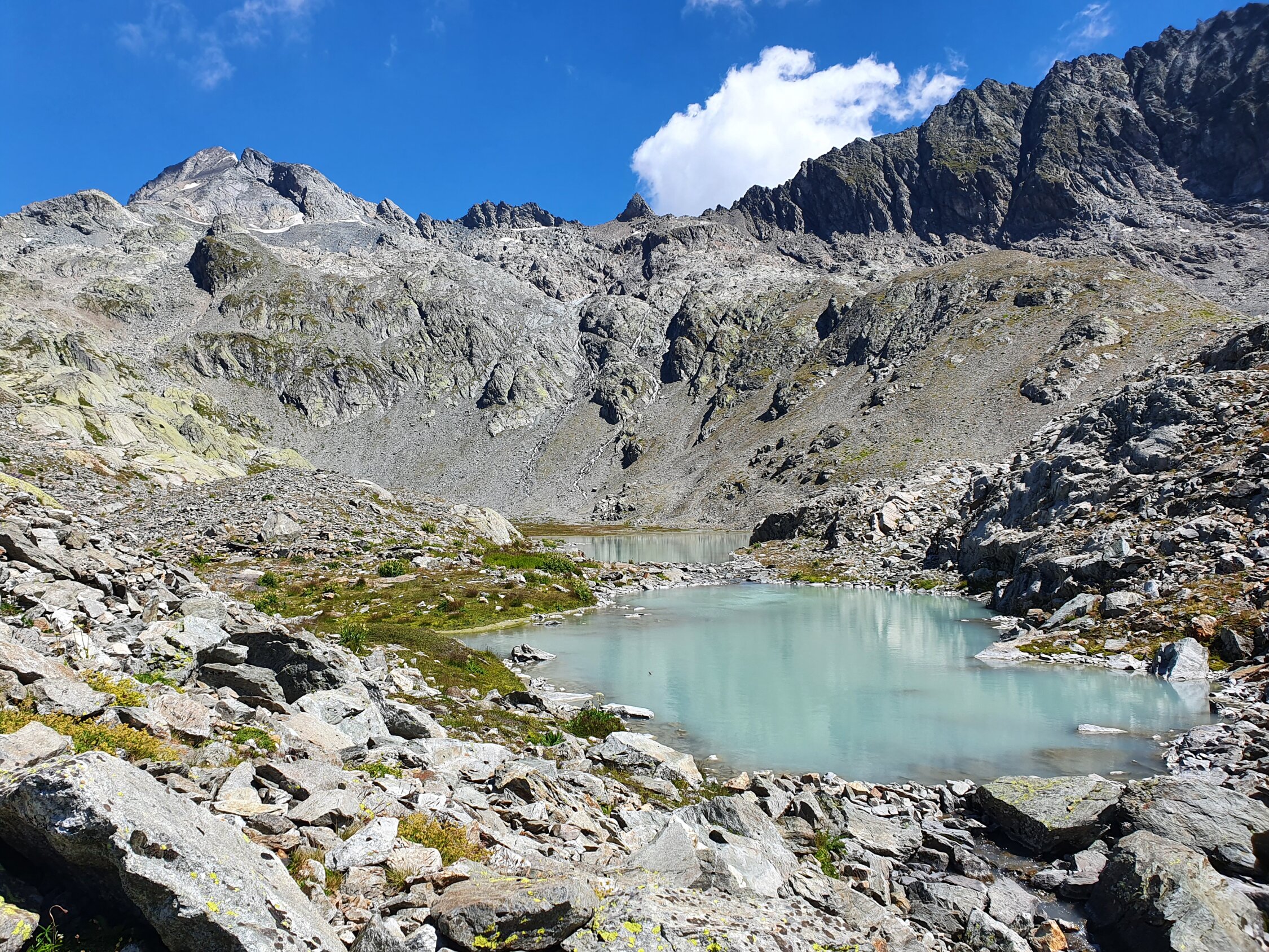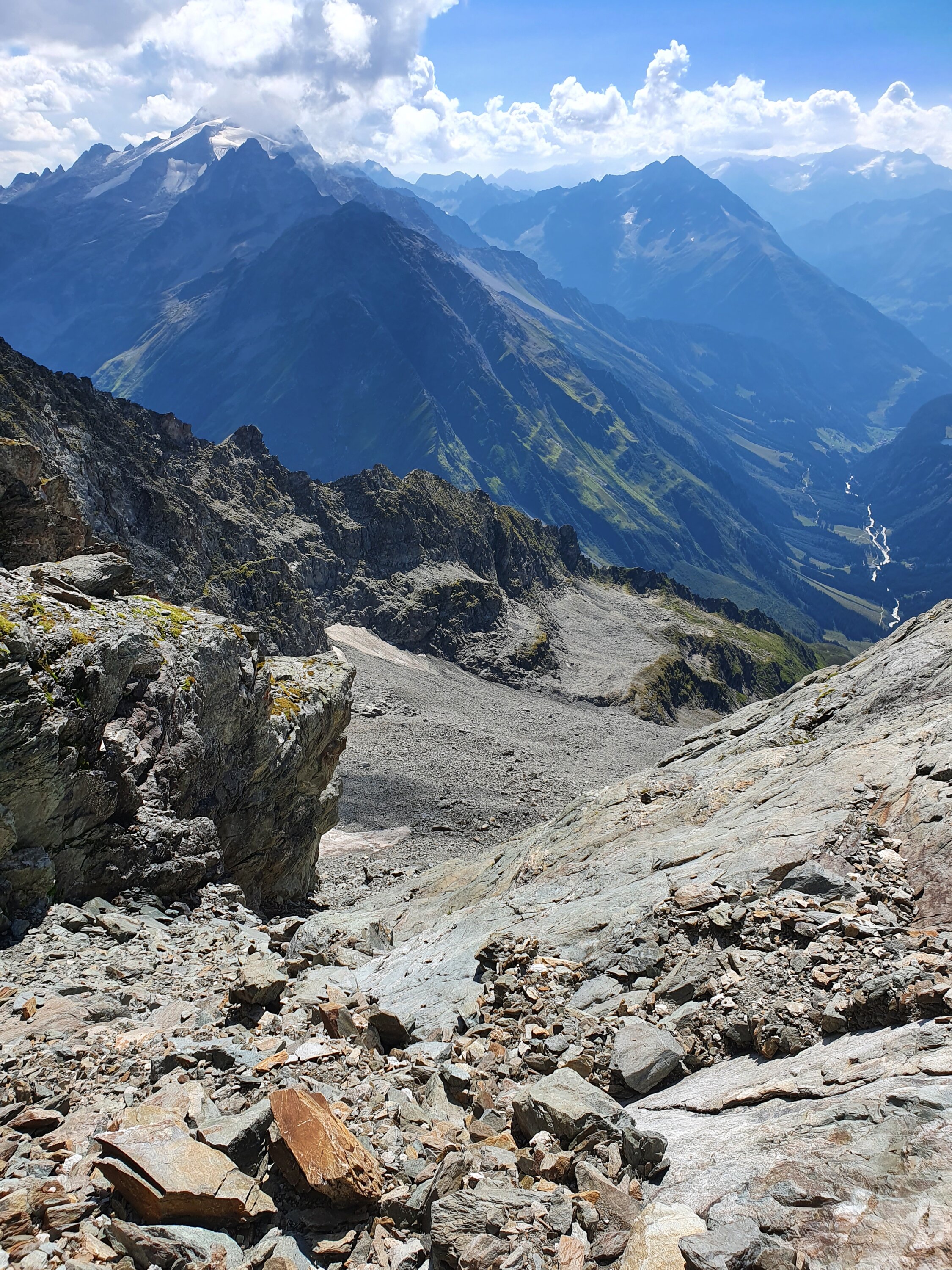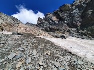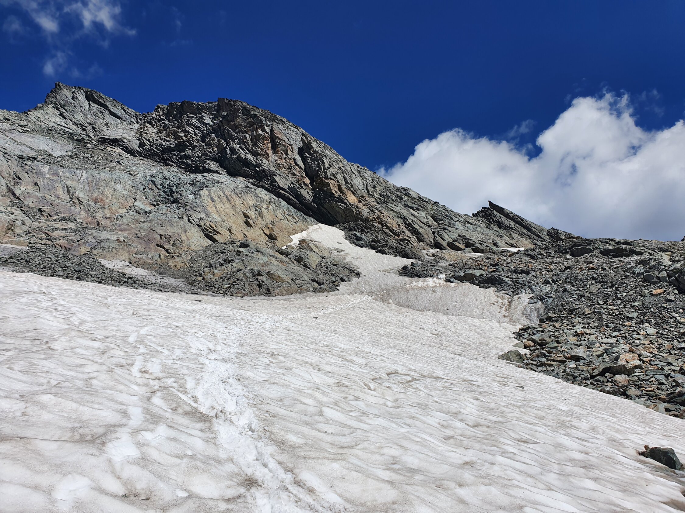 Hinab ging es via Westflanke, der Weg hinab beginnt ziemlich bald auf dem Grat und ist klar erkennbar. Da liegt viel loses Geröll und Gestein, aber die grossen Steine halten trotzdem gut. Hier eher rechts den Aufstiegspfeilen folgen. Ich bin eher in der mitte des Couloirs hinab gegangen und es ging auch gut. Also am Schluss muss man so oder so durch das Couloir durch. Auch hier sind die plattigen Steine eher zu meiden. Ich habe nichts gesehen oder gehört, aber hier entsteht sicher eine gewisse Steinschlaggefahr. Das Couloir kann man aktuell nur über einen ziemlich steilen Schneefeld verlassen (nur 10 Meter breit). Bei warmen Temperaturen ist es ohne Steigeisen und Pickel problemlos möglich, mit Stöcken gut machbar; zum Glück auch, denn ich hatte nur diese dabei. Der Weg ist bei der Westflanke leichter erkennbar als beim Aufstieg im Südgrat. Ab Düssinollen hat es sogar einen ziemlich guten Wanderweg, der bis zur blauen Route, die schnell wieder Hinterbalm erreicht. Ab da wieder hinab zum Blindensee und rennend in 1.15 Std pünktlich zum letzten Bus um 18:57 in Golzern Talstation angekommen.