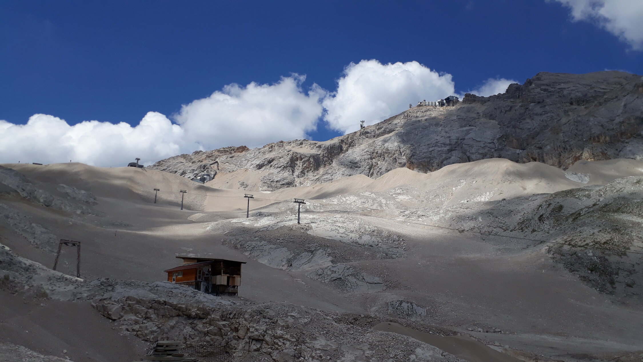 Nach der Abseile auf`s Platt muss man sich noch fast 100 Hm durch die Hinterlassenschaften des verschwundenen Ferners (mit den Hinterlassenschaften von mind. 60 Jahren Alpinskilauf) bis zur obersten Piste quälen. Und auch auf dieser läuft es sich nicht grad wie in der Fußgängerzone.
