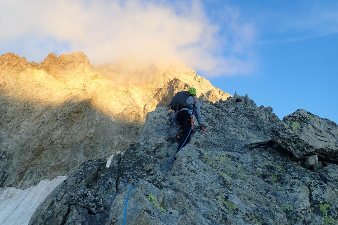 Wir sind ab dem steileren Gratteil in Kletterfinken geklettert und waren in der Schlüsselstelle sehr froh darüber. Ansonsten das Meiste am gestreckten Seil.