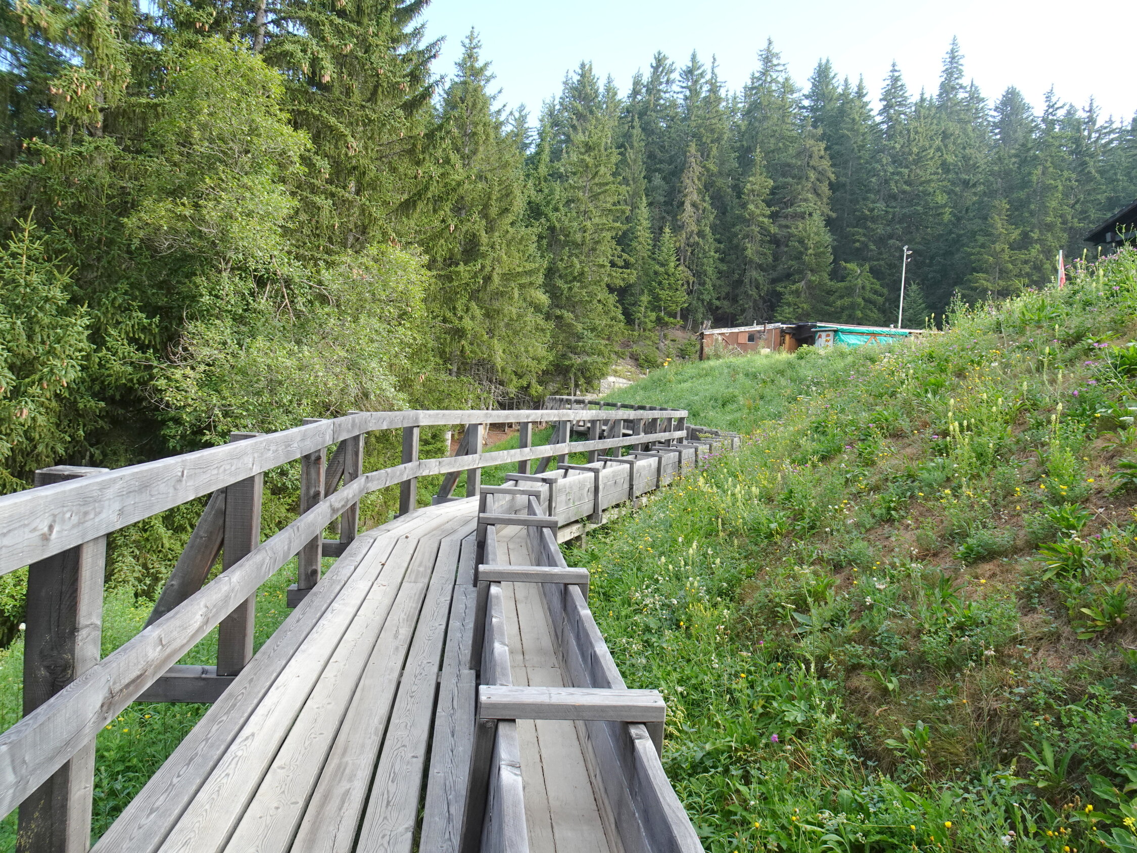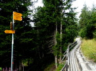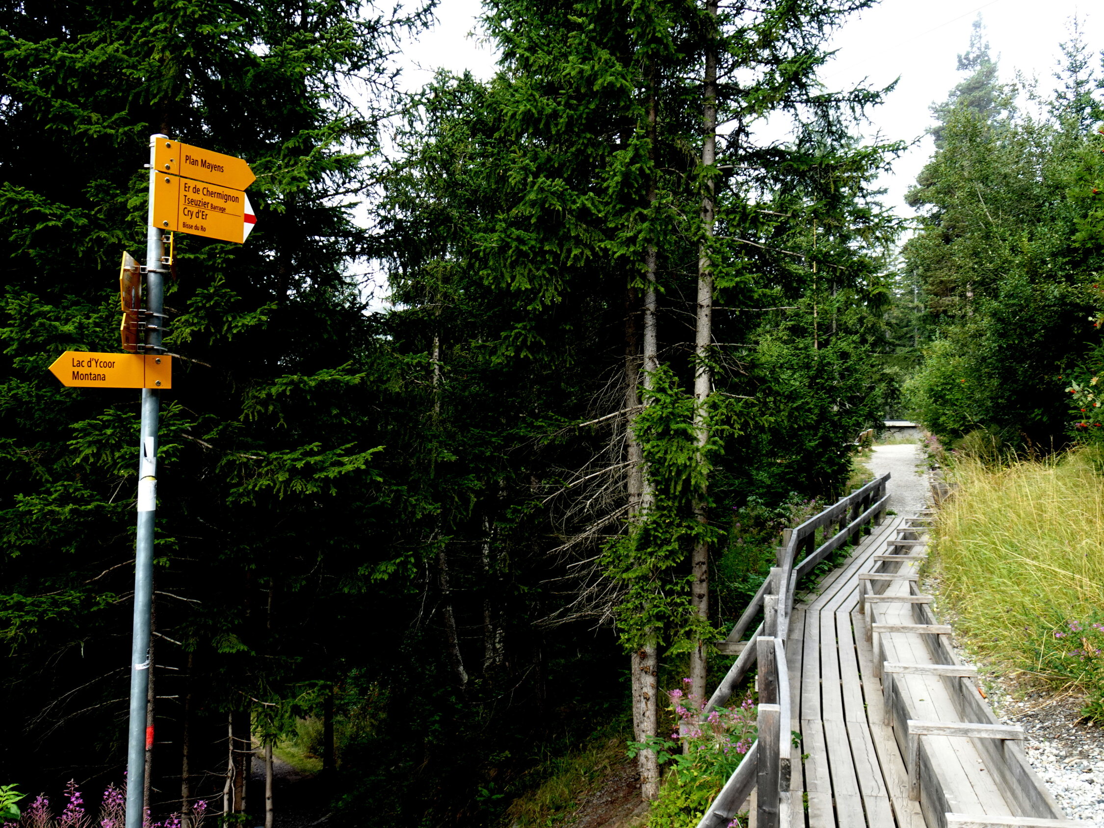 Hier: geradeauf Richtung Lens (Chemin des Alpages sehr schön) oder hinunter Richtung Talgrund der Lienne und Grand Bisse de Lens. Am Anfang ein Warnschild das man gut lesen sollte. Vorsicht: Dieser Verbindungsstück zum Grand Bisse de Lens hinunter hat es in sich: es wird plötzlich steiler, rutschiger und führt mitten durchs hohe Gras: also nur mit gutem Gleichgewicht und Schwindelfreiheit allein ist es nicht gemacht. Erreicht man die Schöpfe der Grand Bisse im Talgrund, wird es einfacher, man kann gut wandern bis Icogne, was eine ganze Weile braucht. Diese Wanderpartie wird durch vielen exponierten, aber gut gesicherten Stellen interessant gemacht. In Icogne kann man den Wegweisern folgen und wird so nach Lens hinaufgeführt.