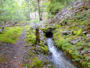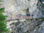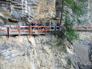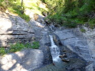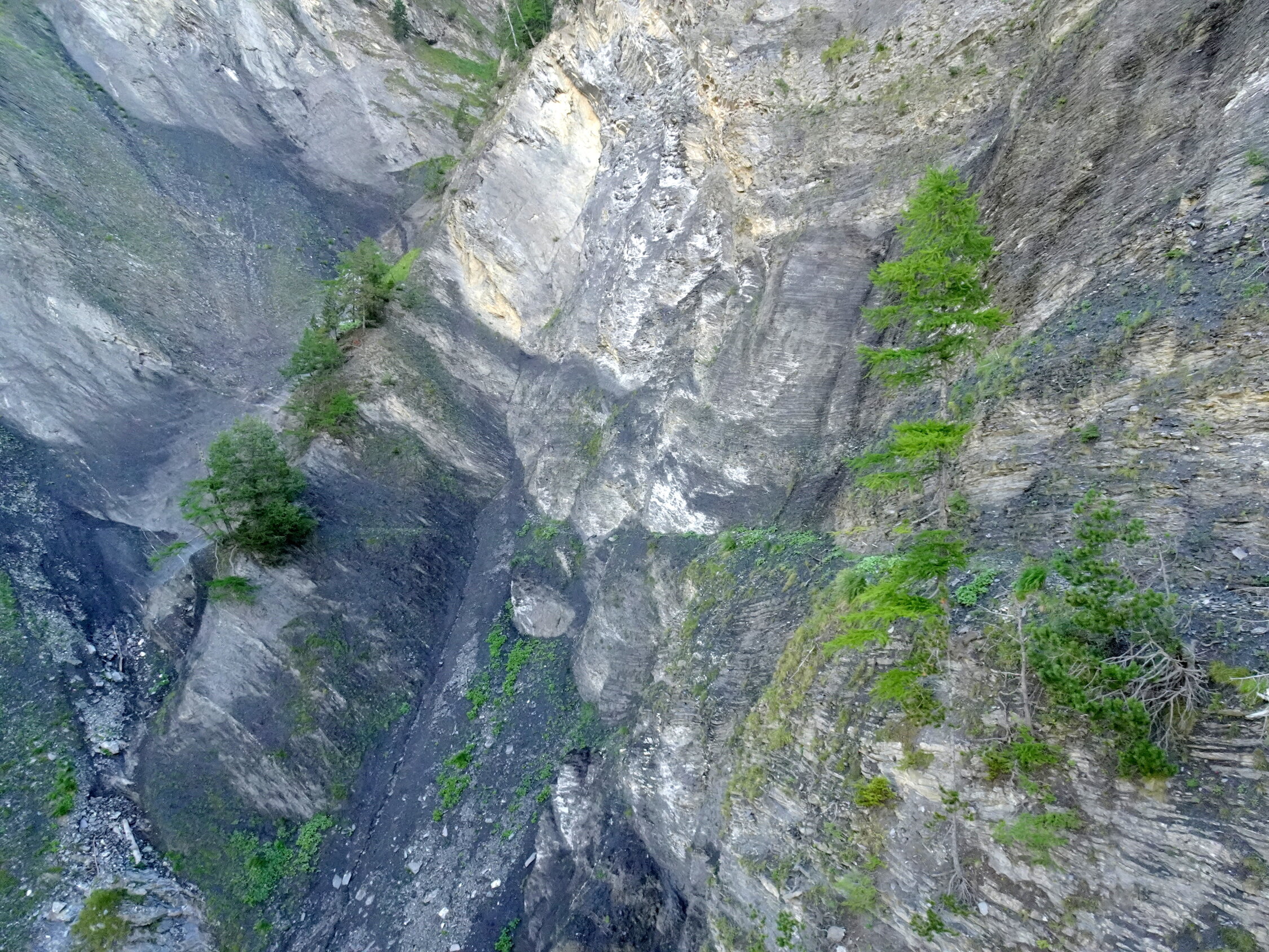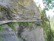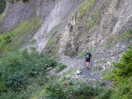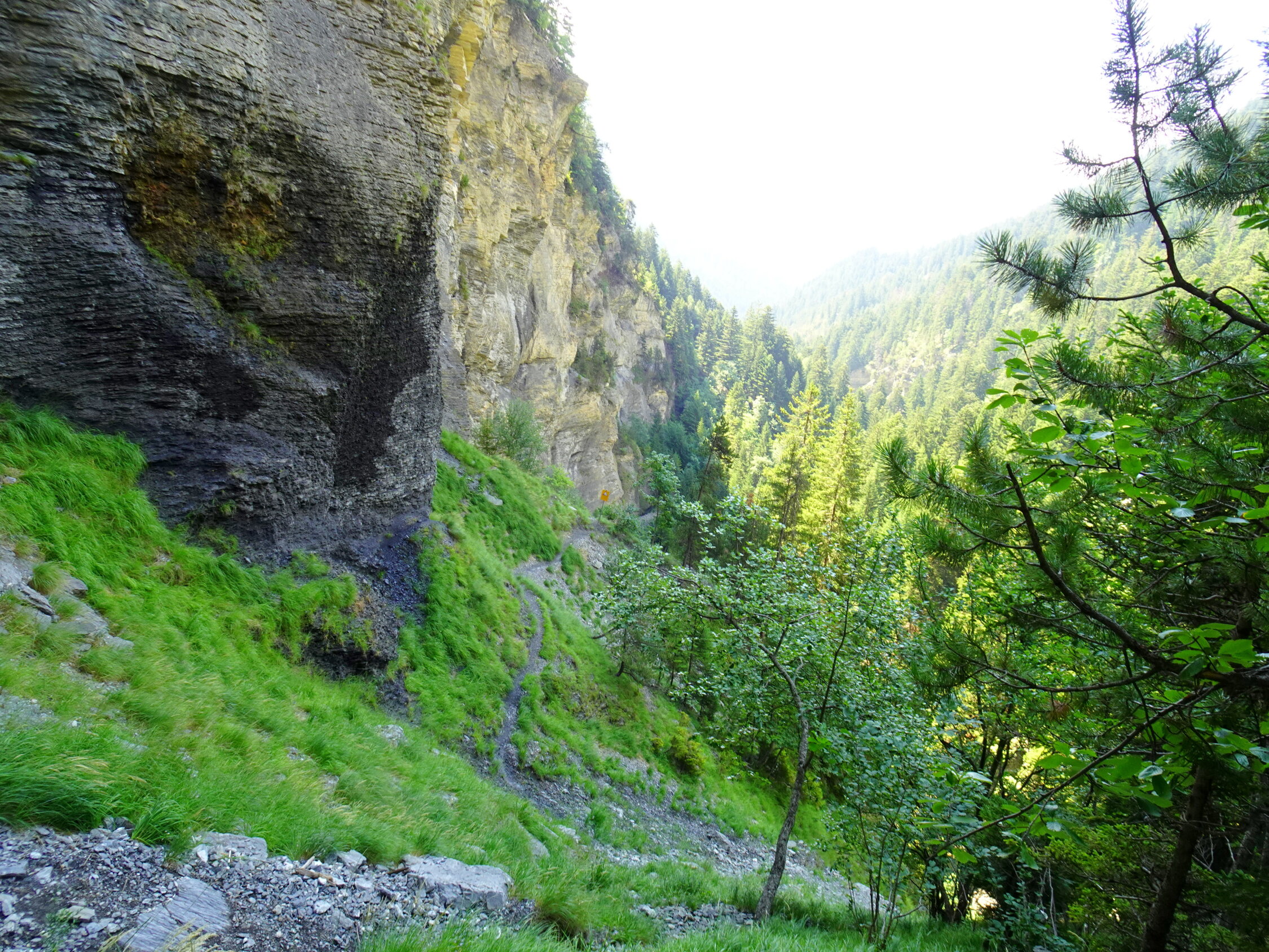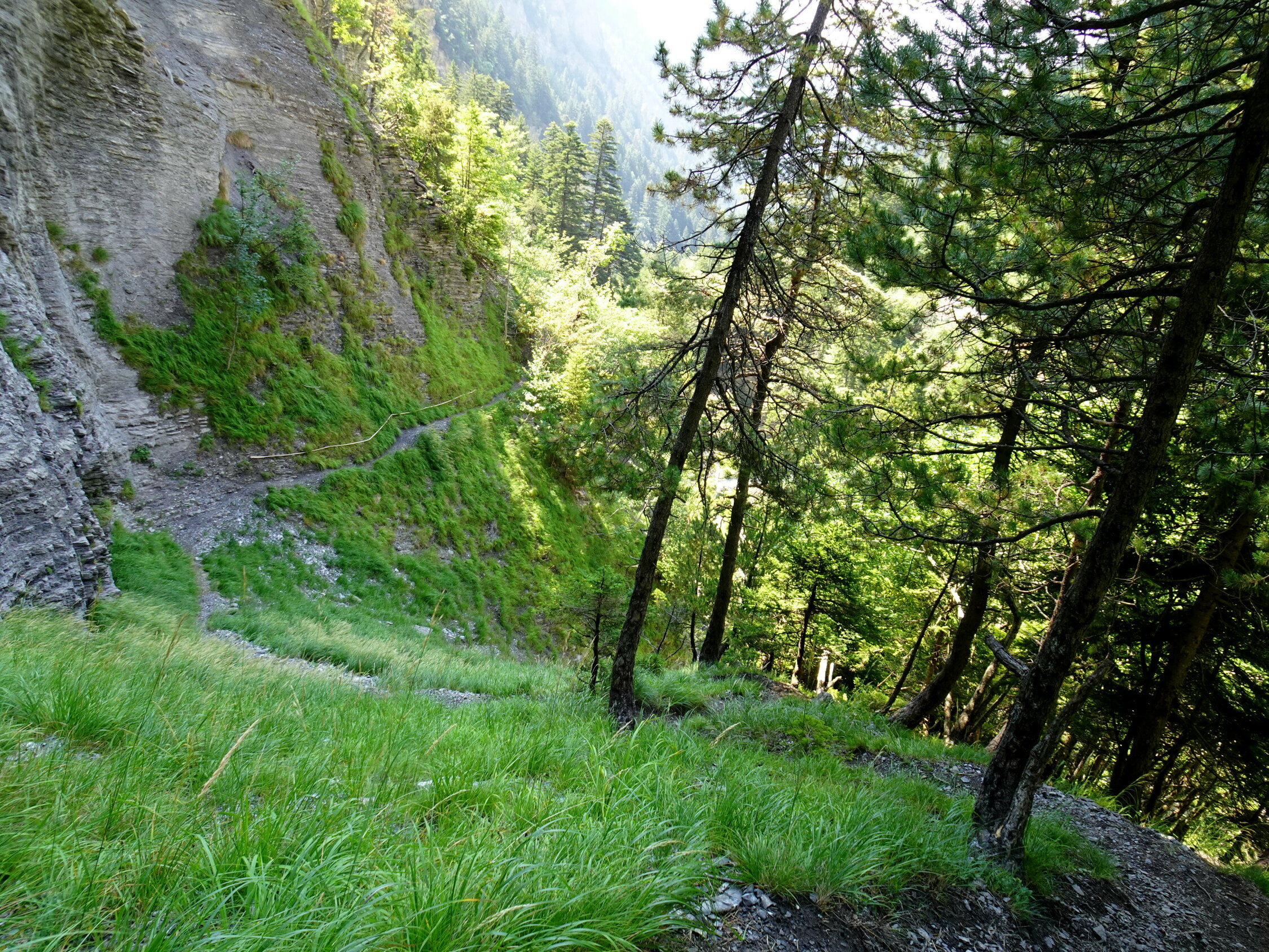 Trockenes Wetter kann den schattigen Steilwegen nur gut tun. Solche Abstiege ohne Tritten, feucht und splittrig gleichen stückweise wie Rutschbanen. Was auch nicht schaden würde, wäre ein Kletterhelm.Ich war wieder mal froh und wurde beneidet. Es hat sich wieder bewahrheitet, dass ein Helm viel stärker ist als der eigener Schädel. Auch beim Bisse du Ro muss man sich manchmal bücken.