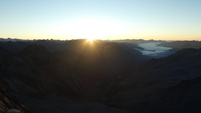 Krügergrat von der Barmerspitze kommend schneefrei und trocken. Wie solls anders sein, bei den Temperaturen. Hochgallrinne sowie gesamte Nordwand komplett schnee- und eisfrei. Der Berg ist kaum wieder zu erkennen. Abstieg durch die Hochgallrinne nicht mehr möglich. Sie ist bis auf den Grund ausgeapert und führt Wasser und Steine, dh. Steinschlag. Wenn dann hält man sich links der Rinne entlang einer extrem brüchigen Rippe abwärts, die zum Schluss immer steiler wird und fast abbricht. Diese wird entweder über schwindligen Abseilstand verlassen oder man verlässt die Rippe im untersten Teil der Hochgallrinne, was aber ebenfalls bei solchen Verhältnissen nicht zu empfehlen ist. Besser Abstieg zur Kasseler Hütte wählen und eine Ueberschreitung draus machen, wenn man auf der sicheren Seite sein will.