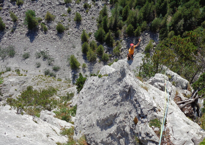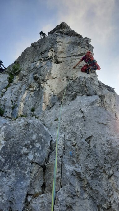Die Route ist tatsächlich durchgehend gut. Jeder Meter interessant (komplexe Leistenkombinationen) und guter bis extrem guter Fels. Tip-top Absicherung. Die letzte SL ist eine Orgie. Die 2. SL hat eine klare Crux vor dem Stand. Bei der 3. SL ist ein klarer Quergang (2 m nach L) drin, auch wenn das von den Bh her nicht so klar ist. Anfangs tief halten. Start ist, wo mal ein silbriger BH (die andern sind golden) leicht nach L versetzt ist.