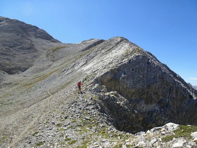 Übergang zur Felsberger Calanda vom Sattel direkt an der Kante, sehr lohnend, oben ein paar Schrofen. Die Spur verläuft teils links unterhalb im Kar durch Geröll. Gipfelaufstieg dann über die Querung der Felsstufe auf den Calandaboden. Hat uns heute mehr zugesagt als der brüchige NW-Grat.