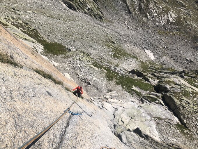 Die Route ist insgesamt gut abgesichert, allerdings Achtung: In der eindrücklichen 6. SL (6b) stecken die Bolts just an der steilsten Stelle dann nicht mehr so dicht, hier muss zwingend selber nachgelegt werden (Cams 0.5 x 2, 0.75, 1). Geht allerdings sehr gut.
