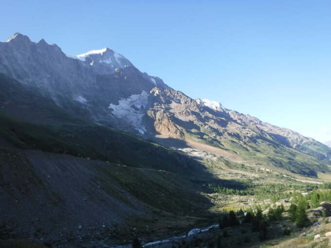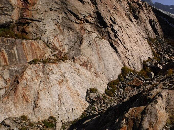 Auf dem schrägen Grasabsatz nach dem Felsdach im Klettersteig sah ich links von der Löffel-Griffe-Reihe über schräge braune Gneisplatten Kletterversuchen von einem Murmeltier zu. Unbemerkt näherte ich mich ihm etwas. Doch das Kerlchen kam nicht weit hinauf. Die Felsplatte war zu steil und zu glatt. So rutschte das Tierchen bäuchlings rückwärts alle viere von sich gestreckt die Platte langsam wieder hinunter. Dabei gaben seine ausgestreckten Krallen kratzende Geräusche ab auf dem glatten Gneis. Dann versuchte es gleiches noch einmal. Und noch einmal. Das sah so komisch aus, dass ich lachen mußte. Da bemerkte es mich und verkrümelte sich ganz schnell in Richtung Grasabsatz hinunter.