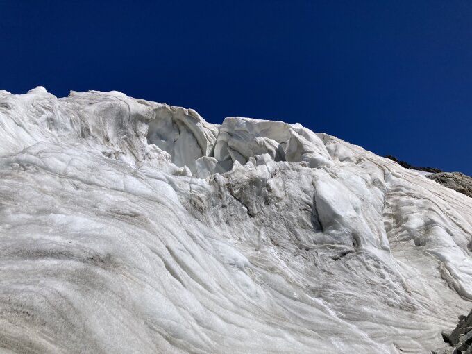 Felsen zum Klettern sind alle trocken und schön zu gehen. Gletscher blank und alle Spalten gut sichtbar.