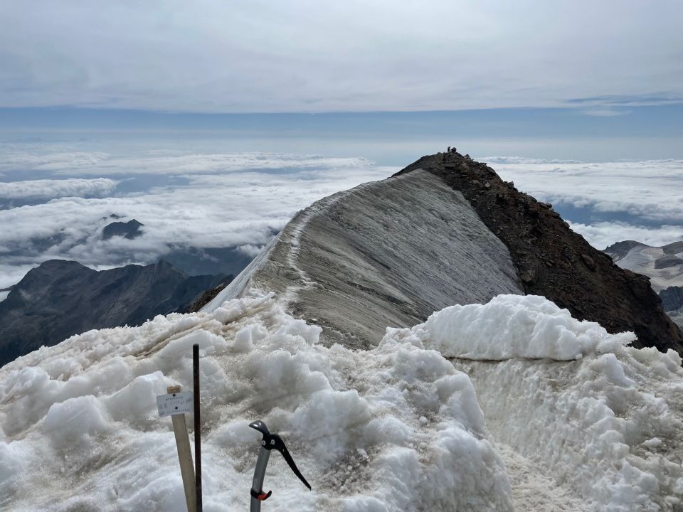 Um 6.00 habe ich mein Biwak am Rottalsee verlassen. Ich habe eine Tourengruppe von vier vorhin gesehen, die den Biwakplatz passiert. Der grat war in ausgezeichnet Zustand, völlig trocknen mit viele Griffe und qualität Fels. Schönen klettern! Nach 3:20 Std. habe ich den Firn kurz unterhalb punkt 3815 erricht. Am Bergshrund auf circa 3800 m auf abstieg vom Rottalhorn muss man steiles Eis ein paar meter hinunterklettern. Danach nahm ich der weg um die nächste spalte herum in richtung Grat. Die Querung zum Weissmies-Nordgrat hat wirklich gut Névé, so dass man schnell auf 3880 m in richtung NE queren kann. Es gibt zwei grosse Spalten zu überqueren. Es braucht vorsichtig Routenplanung und ein wenig Vertrauen! Trotzdem sind die Schneebrücken noch solide. Ich habe auf 3920 m den Nordgratweg verbunden. Folgen Sie dieser circa 20 m nach oben, dann über den breiten Gipfel. Für mich, dauert es 4:30 Std. von Rottalsee nach Gipfel. Beim Absteig muss man den ganzen SSE-grat, weil es riesige Geröllfälle links Firn gibt. Gesamt eine wirklich toll Aussicht und lustige Tour mit viel Abwechslung! Mein ersten Verhältniseintrag und ich lerne noch Deutsch, also entschuldigung Sie für alle Fehler :)