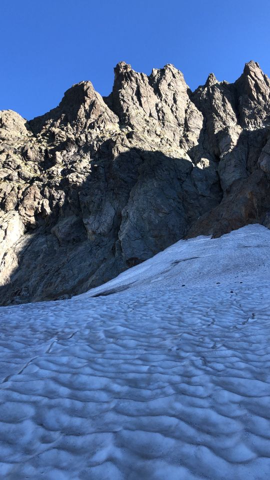 Schnee vor dem Einstieg noch hart am Morgen. Steigeisen notwendig.