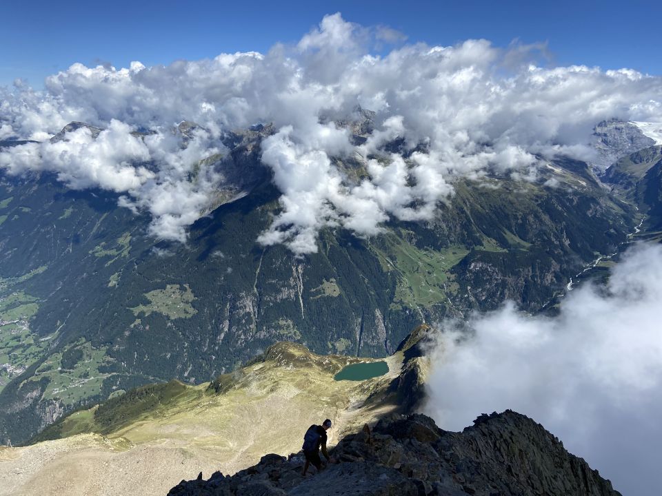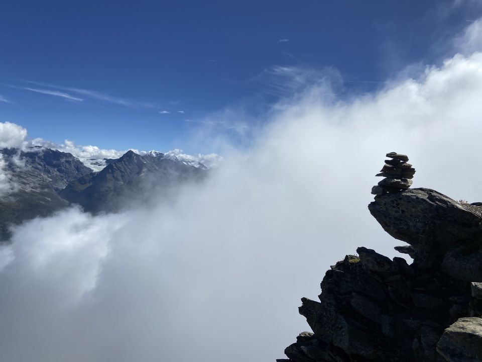 Auf dem Grat gilt: immer auf dem Grat bleiben, bis auf 2-3 Ausnahmen, wo man etwas in die Nordflanke ausweichen muss. Wenn es auf dem Grat zu schwierig wird, ist es ein Zeichen, dass man vom richtigen Pfad abgewichen ist.
