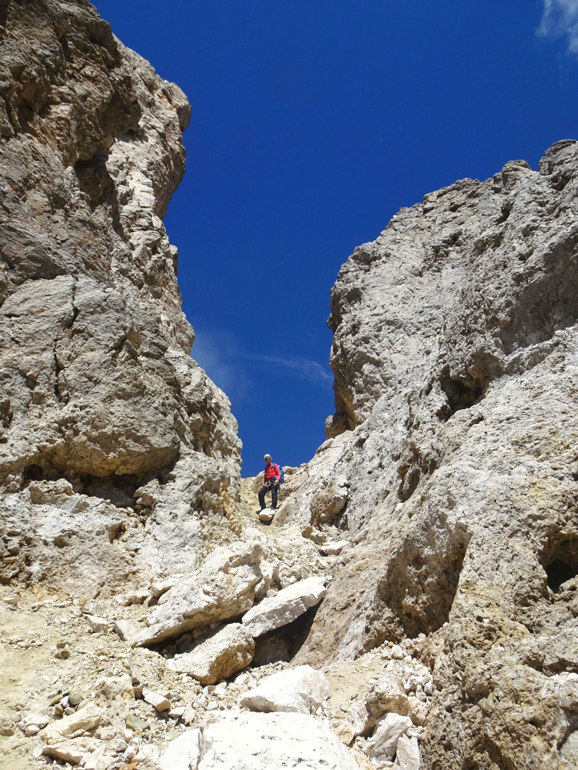 Das "Katzenloch" ist wirklich sehr klein (wenn jemand drinsteckt, ist es ausgefüllt), der Rucksack muss separat durchgeschoben werden. Alternativ kann es über eine ausgesetzte Felswand (III, Haken) umgangen werden.