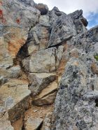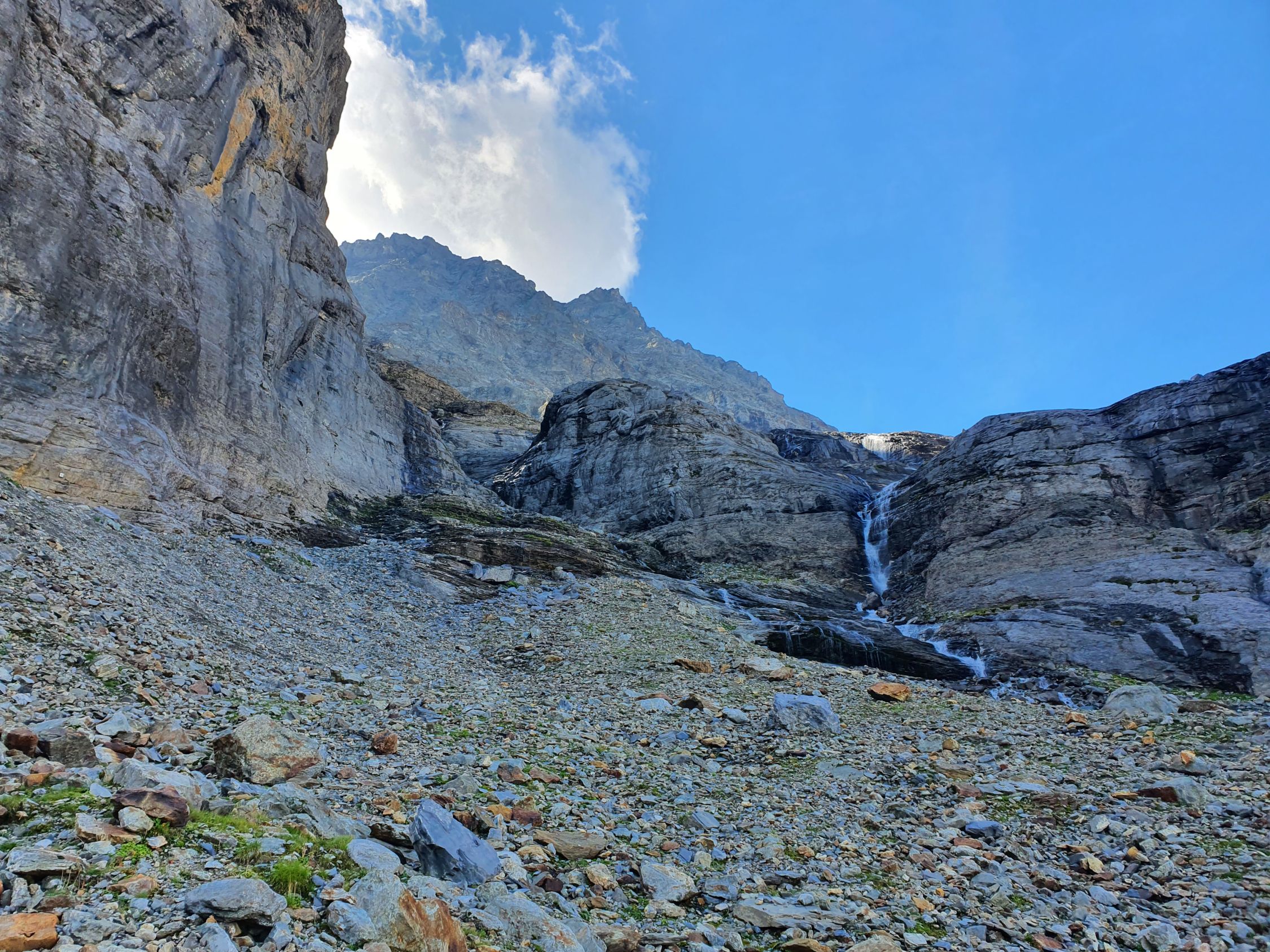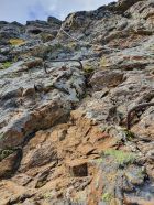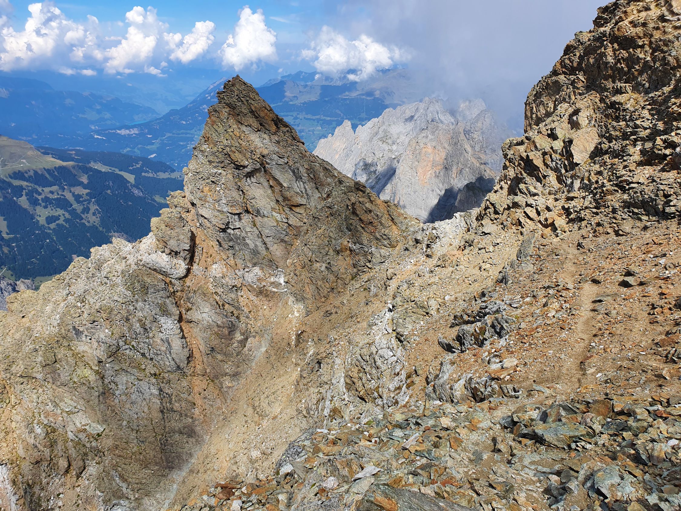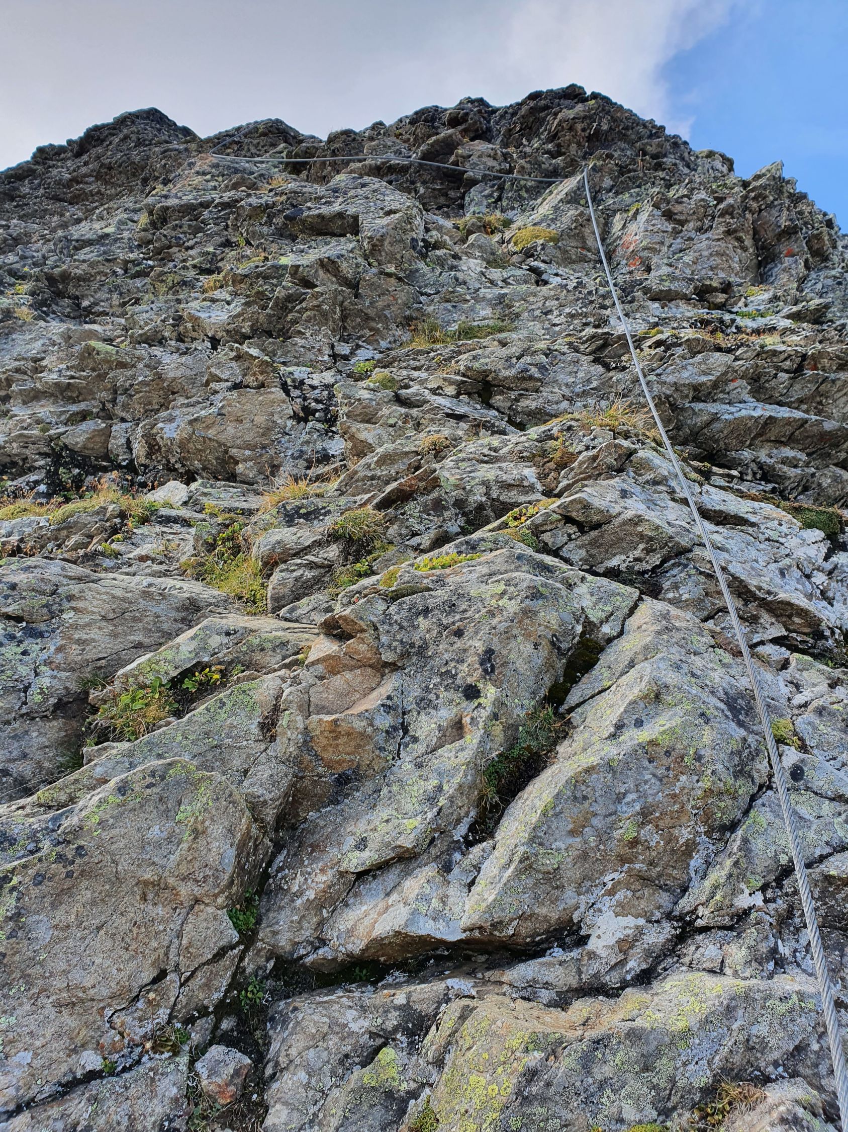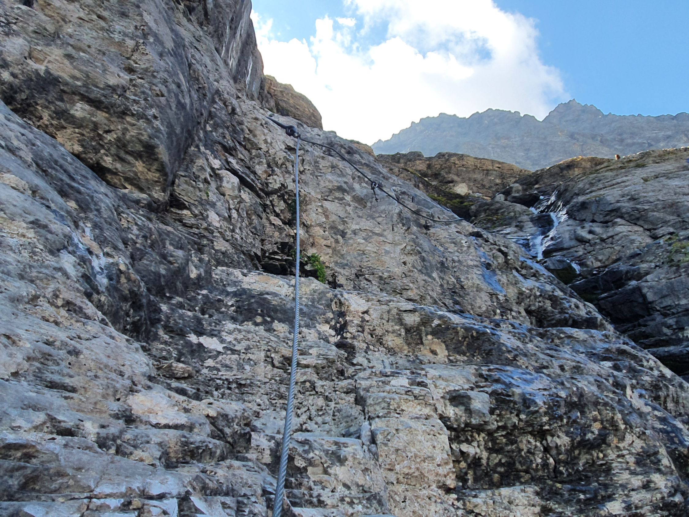 Um 09:00 bei Rosenlaui Gletscherschlucht gestart und um 12:00 bei der Dossenhütte angekommen. Da es über Nacht etwas geregnet hat und man bis kurz vor der Hütte im Schatten hoch läuft, waren die Felsen auch dementsprächend etwas nass. Doch dank den vielen Ketten, zwei Leitern und etliche Stahlseile kein Problem. Von der Hütte weg waren die Felsen, aufgrund der Sonneneinstrahlung am Morgen, bereits wieder trocken. Bis zum Sattel ist der Weg nicht mehr markiert (ausser 1-2 weisse Punkte), jedoch weiterhin gut mit Stahltritte, Stahlseile und Schrauben gesichert. Ab dem Sattel gibt es keine Sicherungen mehr. Es geht meist in leichter Kletterei (II) mit einer etwas schwierigeren Stelle (III) hoch zum Dossen Nordgipfel (P3139). Ich bin dann auf dem Grat ohne Schwierigkeiten weiter zum Dossen Hauptgipfel (P3144). Auf beiden Gipfeln hat es ein paar Biwak- oder Zeltplätze in den Steinen eingerichtet. Für den Abstieg bis zum Sattel war ich froh, dass es den Bänderweg (T5) gab. Ein Abstieg auf dem Dossengrat wäre meiner Meinung nach ohne Seil doch etwas riskant. Der Bänderweg ist sehr ausgesetzt, erfordert aber keine Kletterei mehr. Danach ging es mit Vorsicht via Dossenhütte wieder hinab nach Rosenlaui Gletscherschlucht.