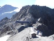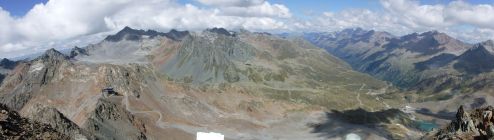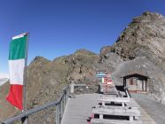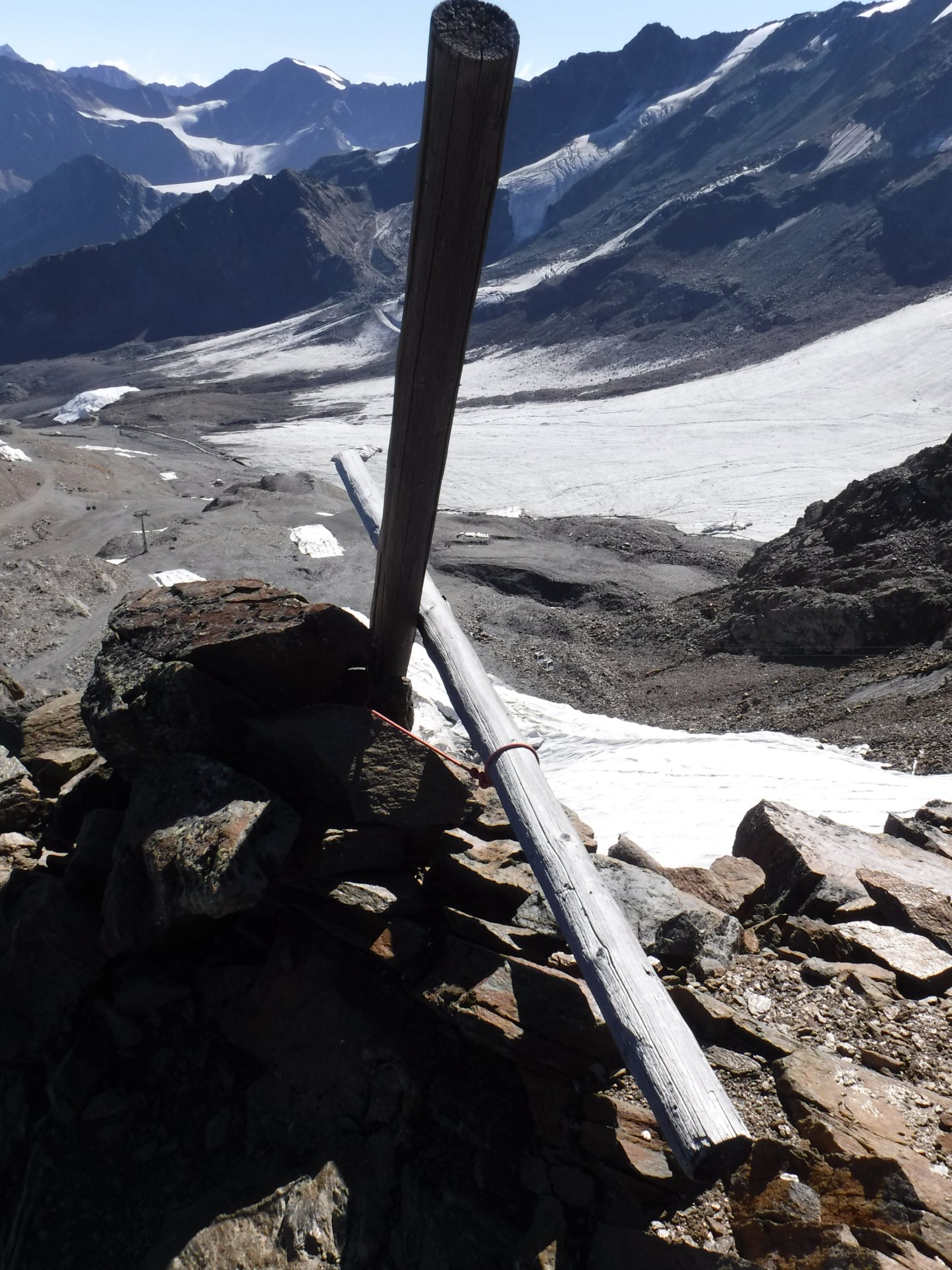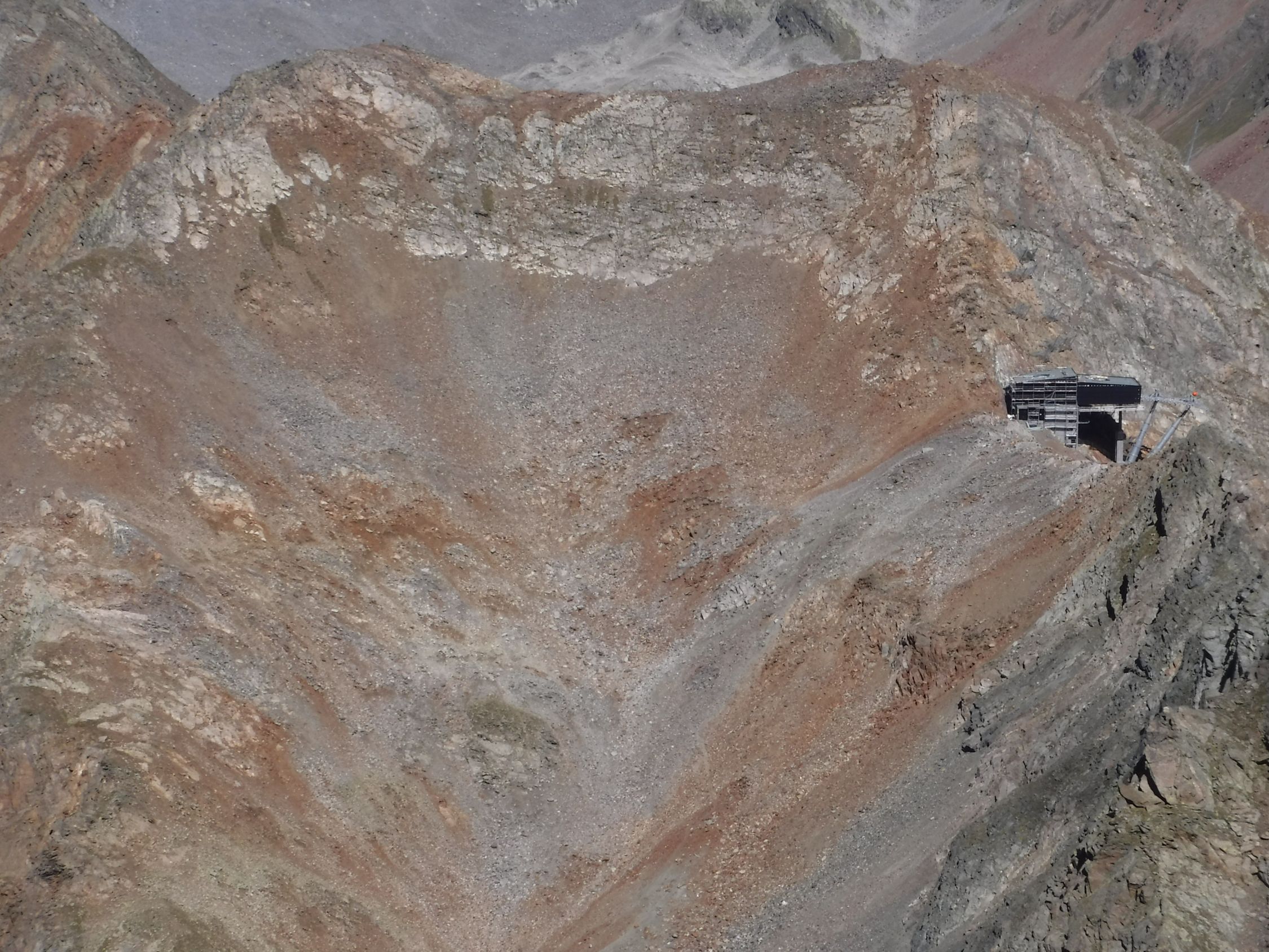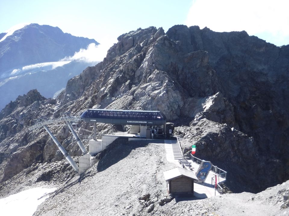 Die Karlesjochbahn ist im Sommer täglich von 10:00 bis 16:00 Uhr in Betrieb. Die Retourfahrt kostet € 23,00. Es wird keine Einzelfahrt angeboten (Stand: 2022). Ich fuhr mit der Kleinkabinenbahn zum Dreiländerblick hinauf. Ich wollte testen, ob der Klettersteig noch begehbar ist. Darum wählte ich die Laufrichtung von Süd nach Nord, so dass ich ggfs. umkehren und mit der Seilbahn wieder zurückfahren könnte. Die Laufrichtung ist auch deswegen zu empfehlen um im letzten Abschnitt, wo das Sicherungsseil herausgerissen ist, von oben die weglose Flanke auf südtiroler Seite zu überblicken und sich seinen Weg durch den Schutthang zum Wiesejaggljoch hin zu bahnen.