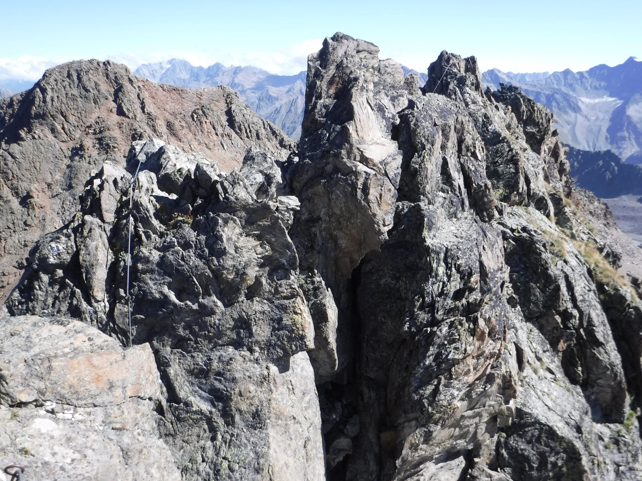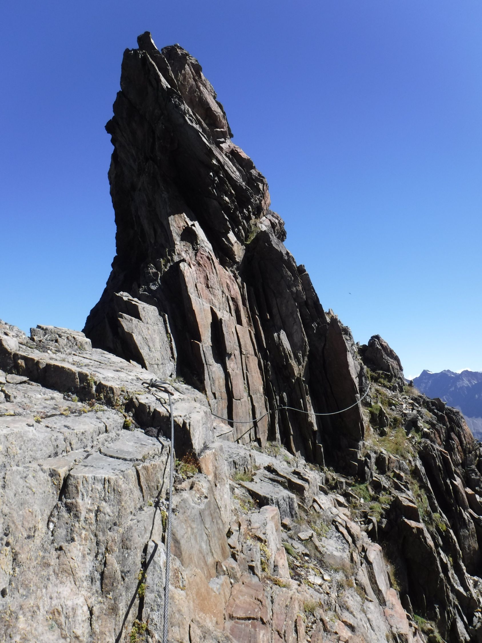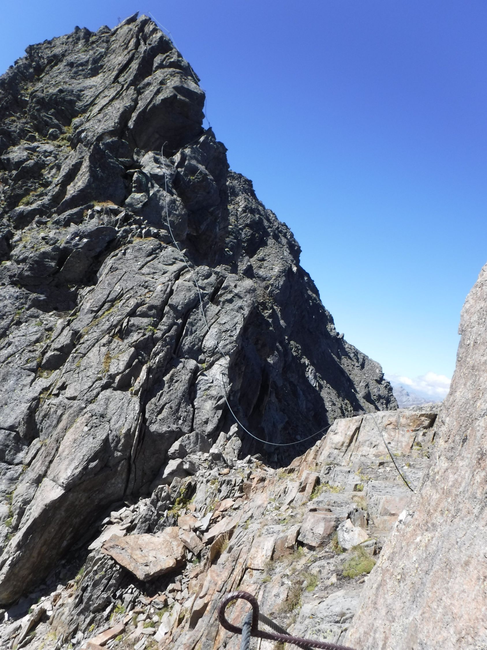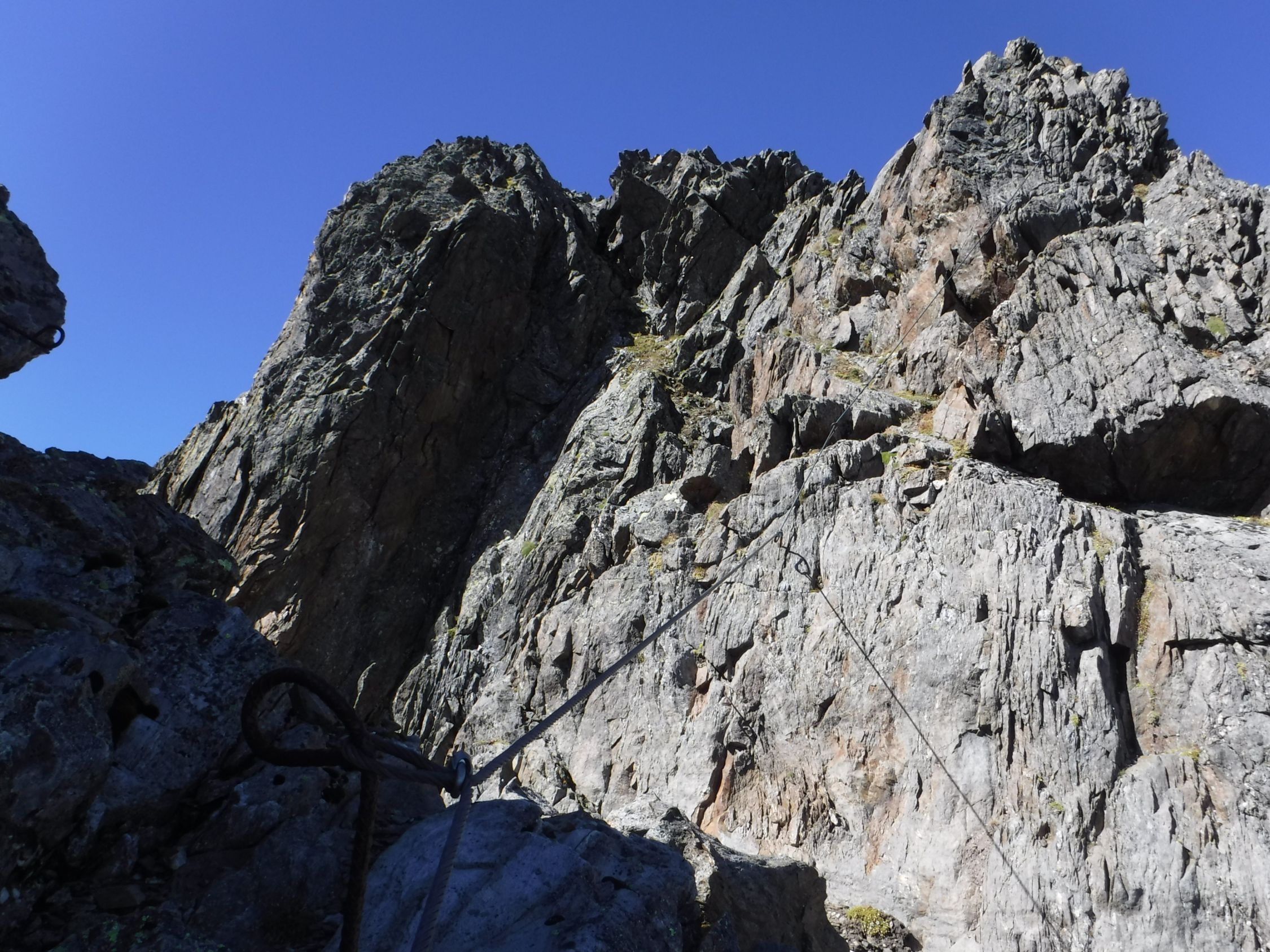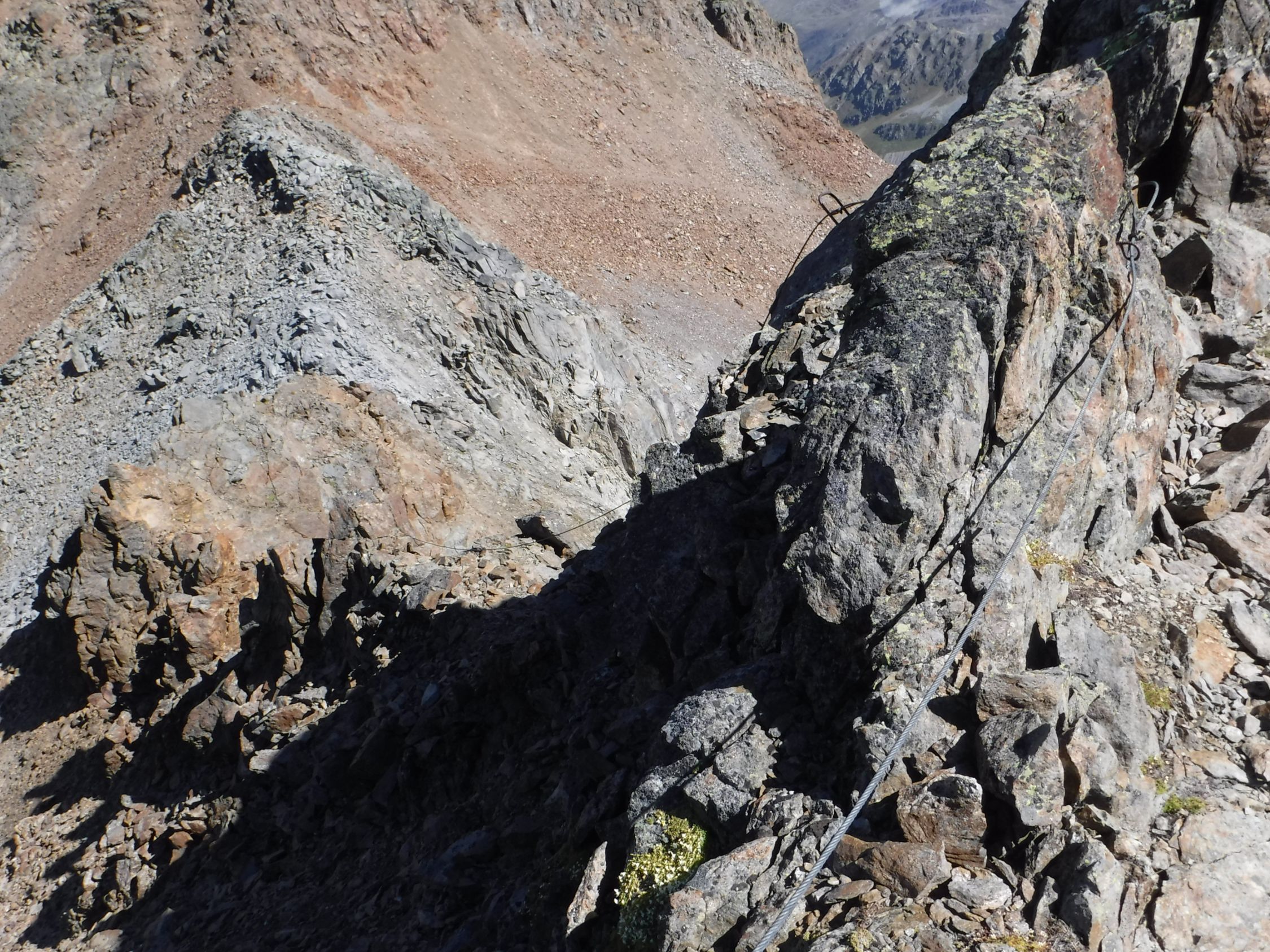 Tourenbeginn um 10:00 Uhr bei 6°C unter klarem Himmel bei leichter Bise. Der zum Teil exponiert gebaute Klettersteig wird seit Jahren nicht mehr gepflegt und auch nicht mehr angezeigt. In den älteren Karten Tabacco 43 und AV 30/2 ist er als Klettersteig eingezeichnet. Das 12 mm dicke Seil ist zwar noch relativ gut erhalten. Viele der 8 mm dünnen, biegsamen Ankerpunkte sind allerdings verbogen. Einige sind herausgerissen, teilweise mit Felsbrocken dran. Die werden noch vom Seil gehalten. Lediglich das nördliche Ende vom Felsgrat hinab ist das Seil abgerissen und liegt auf tiroler Seite. Hier weicht man auf südtiroler Seite aus und steigt durch sandiges Block- und Schuttgestein hinab zum Wiesejaggljoch. Als Klettersteig ist die aussichtsreiche Route nicht mehr zu empfehlen, als Kletterroute jedoch schon, wenn man für eigene Sicherung sorgt.