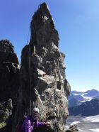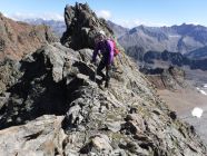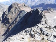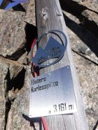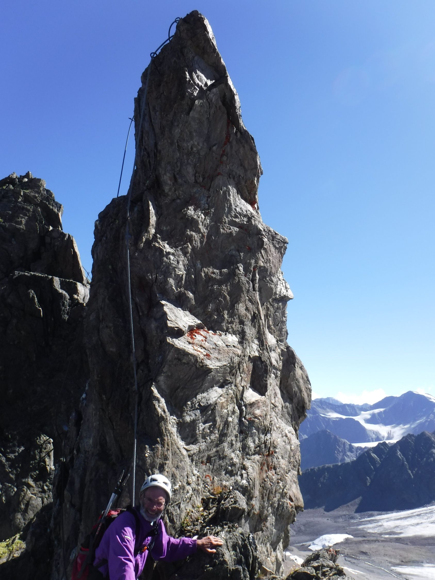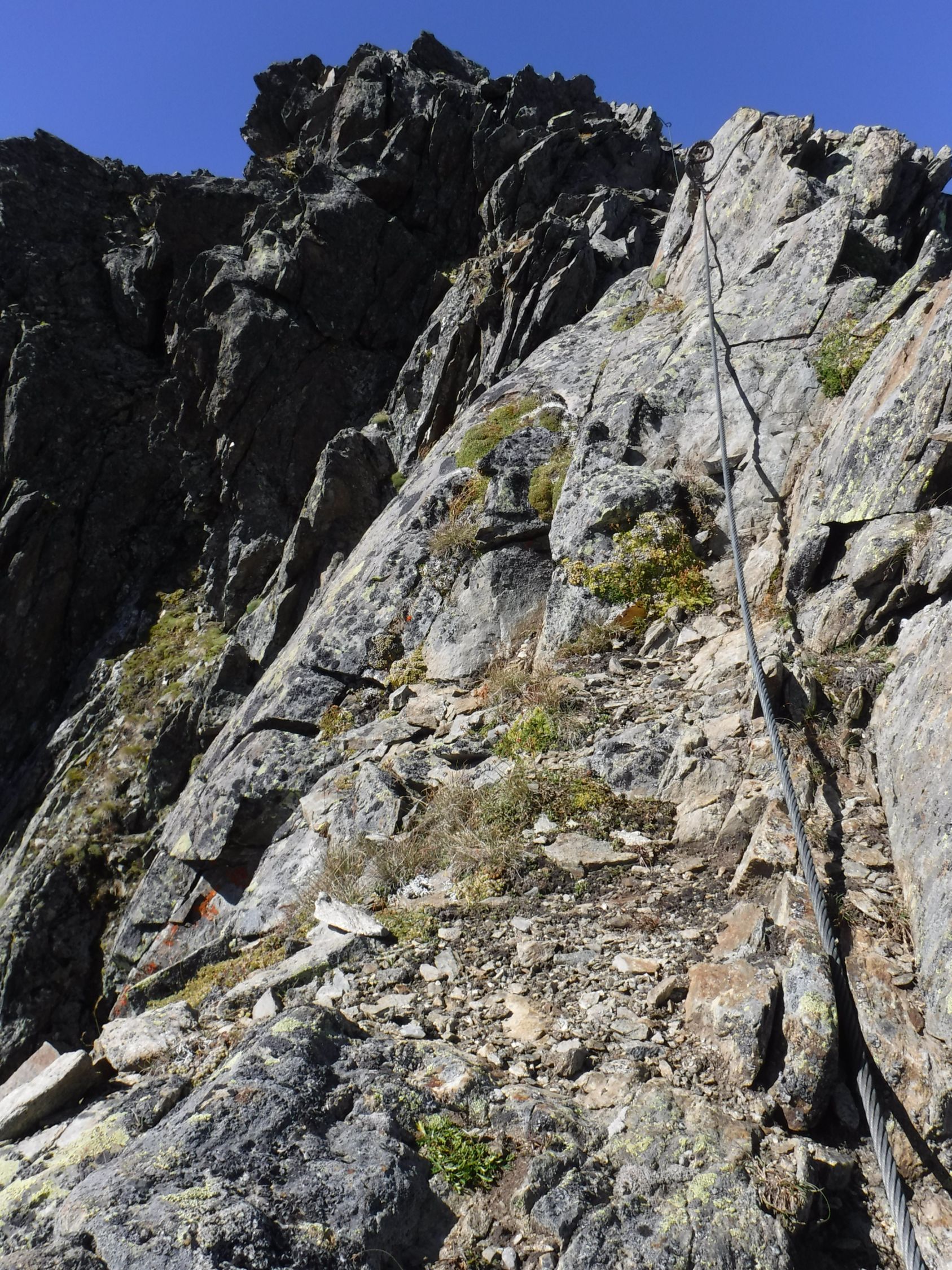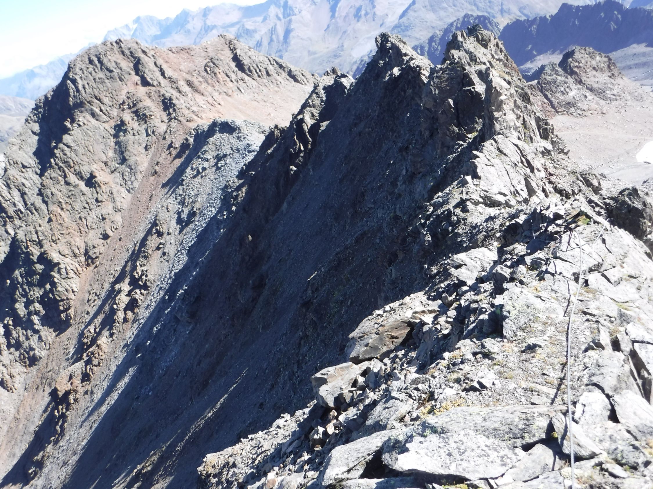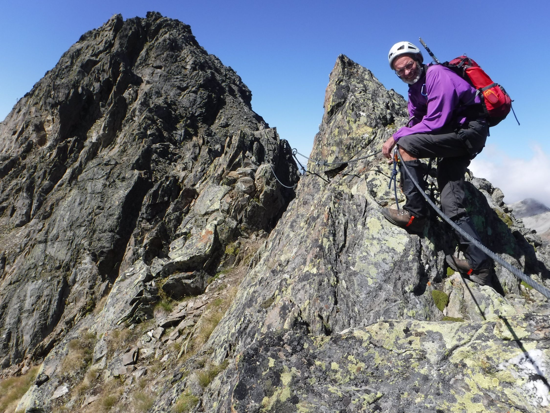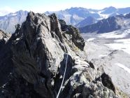 Tourenbeginn um 10:00 Uhr bei 6°C unter klarem Himmel bei leichter Bise. Der zum Teil exponiert gebaute Klettersteig wird seit Jahren nicht mehr gepflegt und auch nicht mehr angezeigt. In den älteren Karten Tabacco 43 und AV 30/2 ist er als Klettersteig eingezeichnet. Das 12 mm dicke Seil ist zwar noch relativ gut erhalten. Viele der 8 mm dünnen, biegsamen Ankerpunkte sind allerdings verbogen. Einige sind herausgerissen, teilweise mit Felsbrocken dran. Die werden noch vom Seil gehalten. Lediglich das nördliche Ende vom Felsgrat hinab ist das Seil abgerissen und liegt auf tiroler Seite. Hier weicht man auf südtiroler Seite aus und steigt durch sandiges Block- und Schuttgestein hinab zum Wiesejaggljoch. Als Klettersteig ist die aussichtsreiche Route nicht mehr zu empfehlen, als Kletterroute jedoch schon, wenn man für eigene Sicherung sorgt.