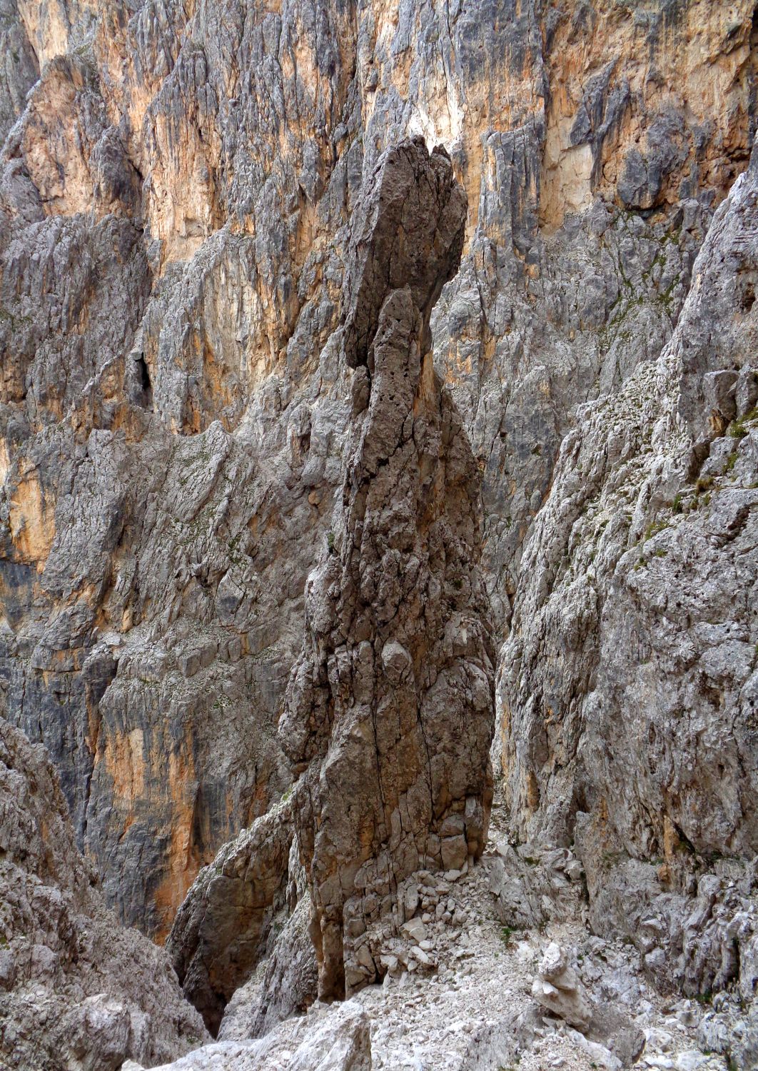 Abstieg: gut mit gebohrten Ringen eingerichtet. Dazwischen muss man aber doch ganz schön in der brüchigen Schlucht abklettern. Dafür kommt man dann doch nochmal an einer Sehenswürdigkeit vorbei, ein Felsturm, wie von Giacometti geformt... Und ein bischen muss man schon auf die Steinmännchen schauen, da der weg einmal in eine Parallelrinne führt. Unten dann dafür echt schöner, weiss-gewaschener Stein bis zum Schluchtende.