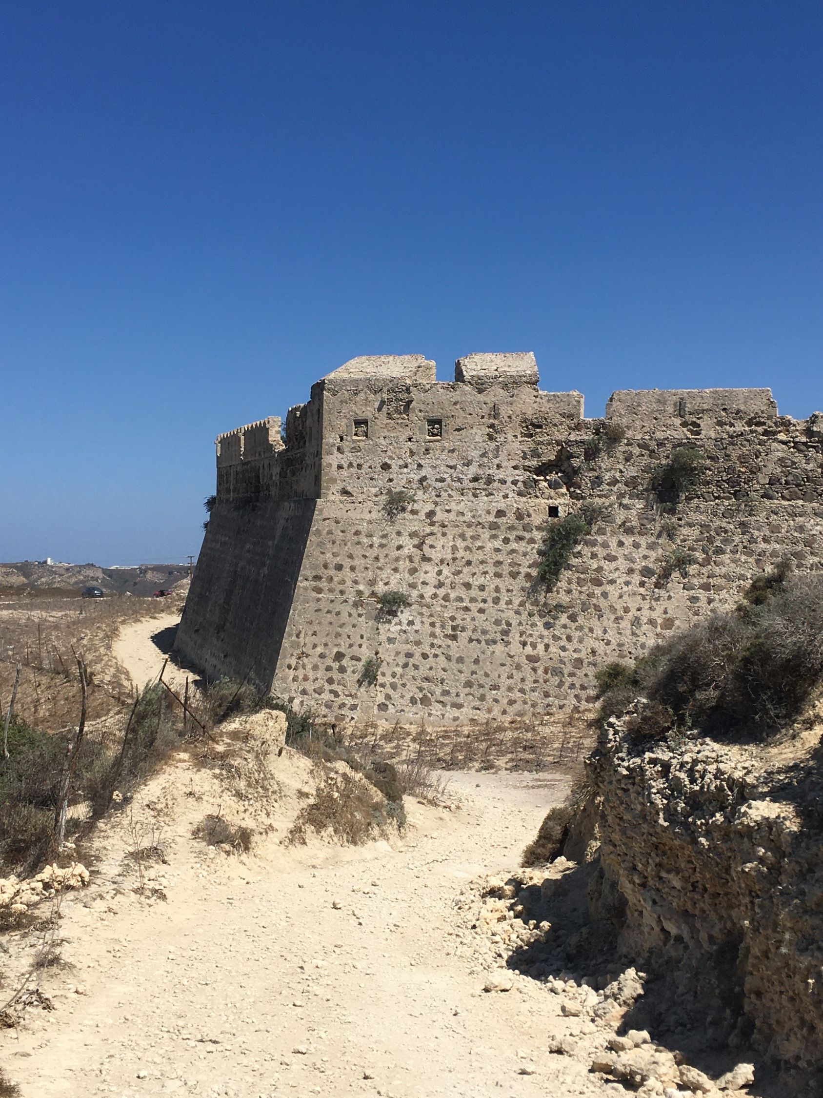 Start beim Restaurant Anemos in Kardamena, 31 Grad, sehr starker böiger Nordwestwind. Sehr schöner von der EU finanzierter mit Platten eingefasster Wanderweg in schöner Umgebung bis kurz vor dem Kastel. Tolle Aussicht nach Süden. Extrem unangenehmer Wind. Am Ende der Wanderung Mittag- oder Nachtessen im Anemos Fischlokal in Kardamena sehr empfehlenswert. Das Kastel kann von Norden auch mit dem Auto angefahren werden.