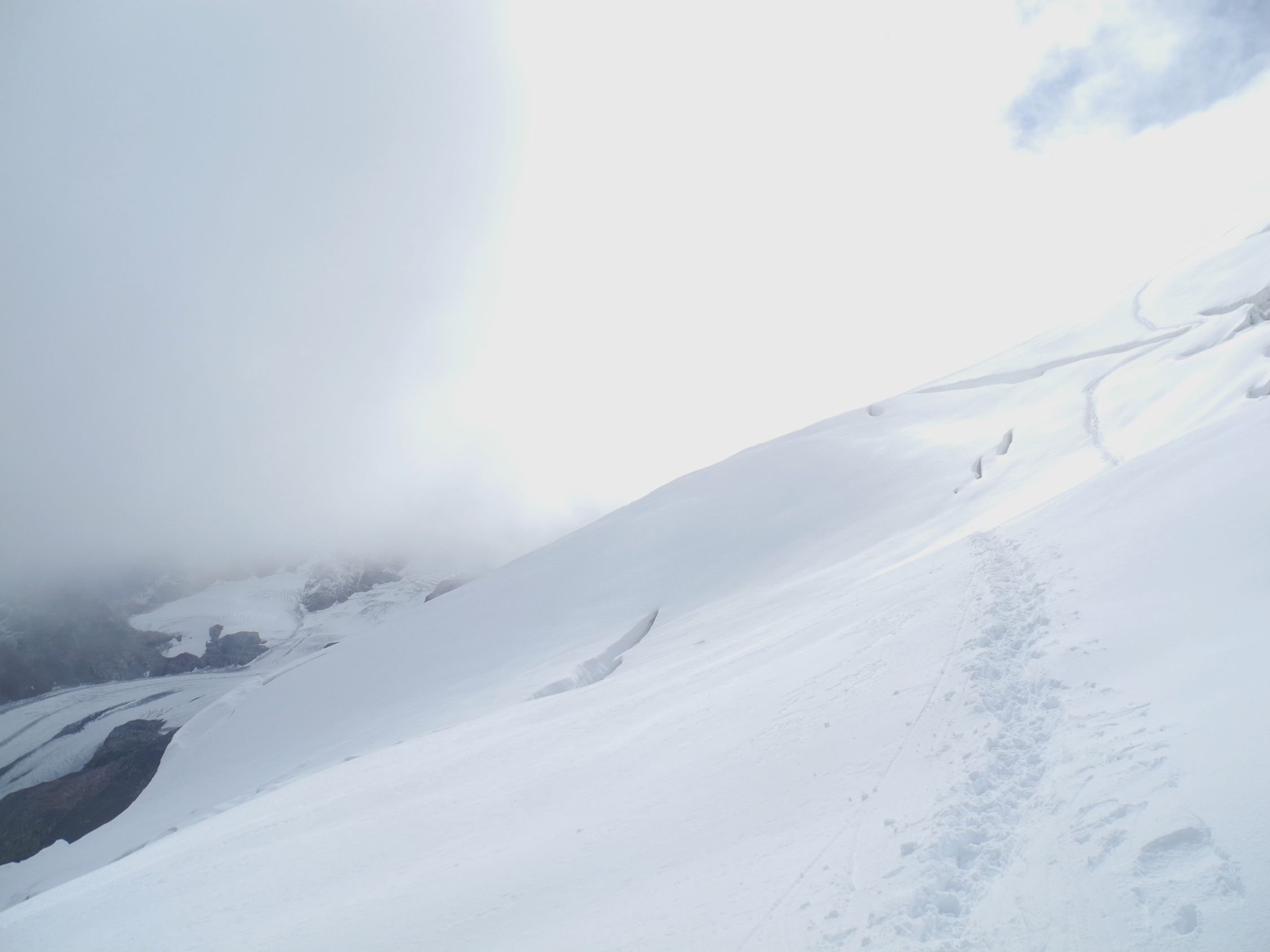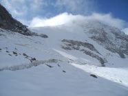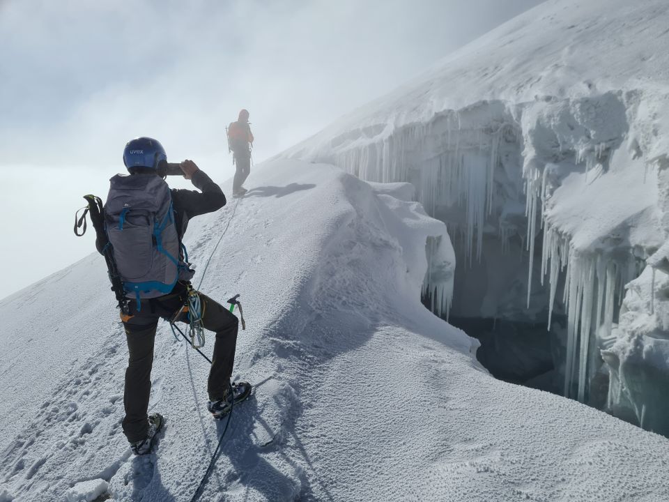 25 Meter-Abstieg auf Tschiervagletscher heikel (fast Blankeis und steil), Seilschaft abgelassen und Seilerster abgeklettert mit Zwischensicherungen. Anschliessend Aufstieg auf Gletscher angenehm (zw. 10 und 30 cm Neuschnee) und auch im steilen Gelände gut zu gehen.