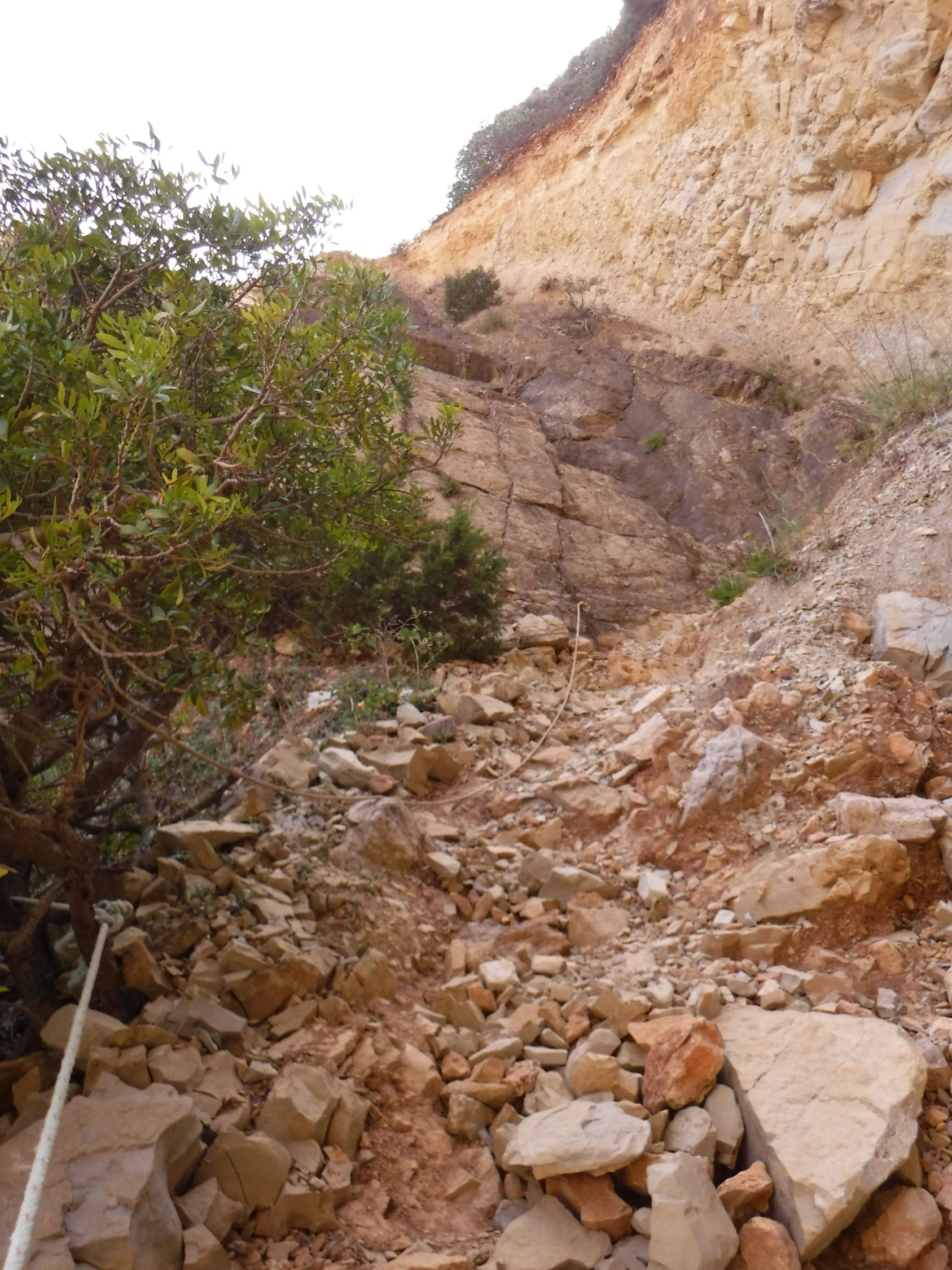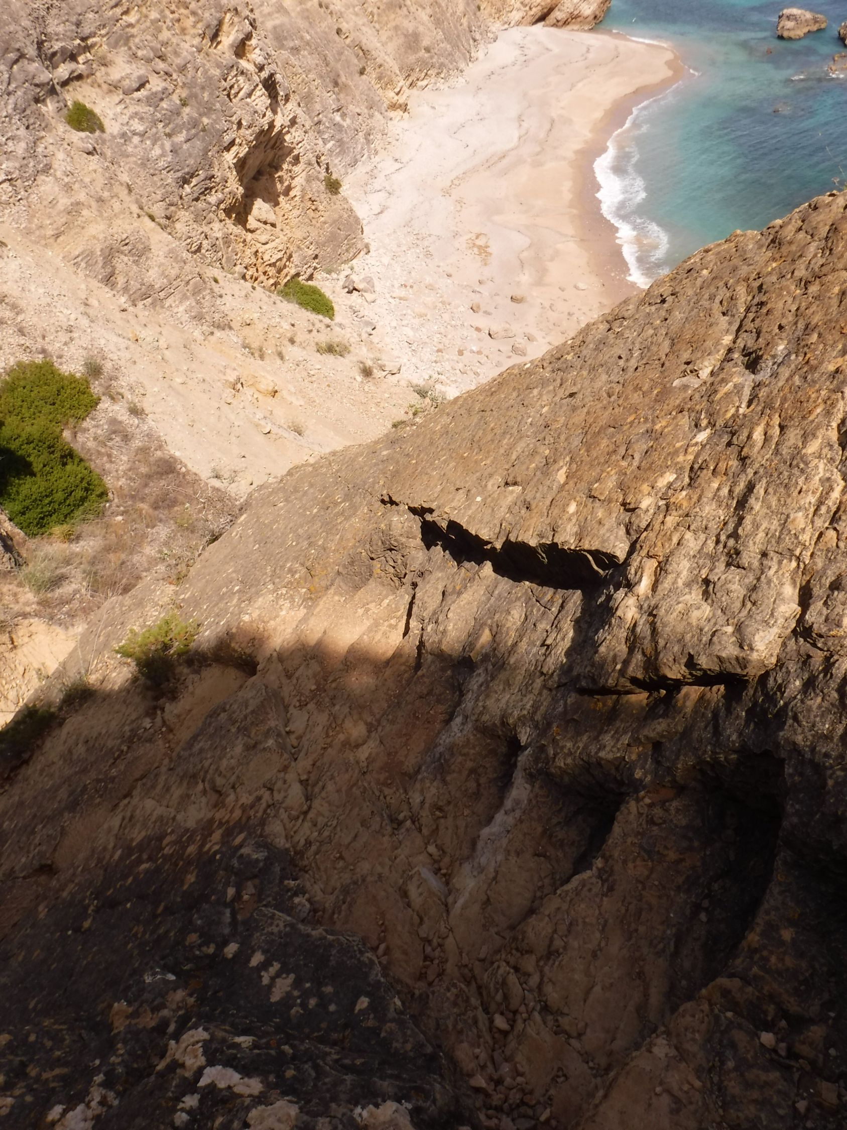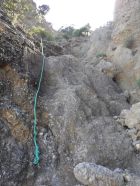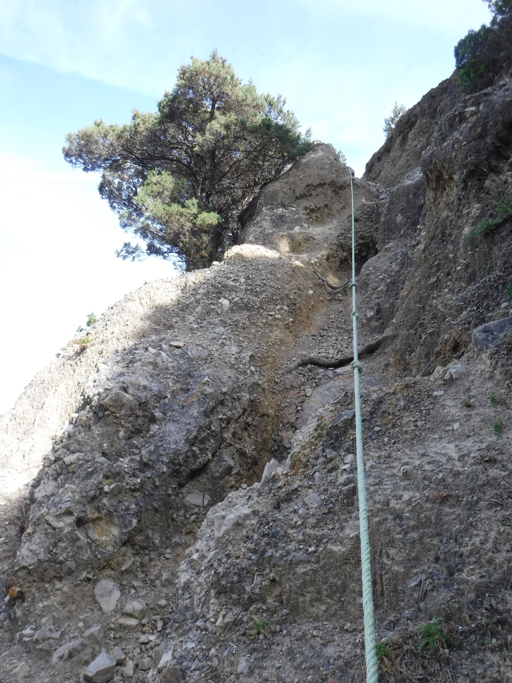 Ursprünglich suchte ich den Zustiegsweg zur Via Ferrata Pinheirinhos. Doch dies gelang mir nicht wie gedacht. Sondern ich fand nach vielem Suchen zwischen mehreren Pfaden auf der Schrattenkalkebene den Abstieg und das Textilseil hinab zur Höhle Cova das Ovelhas. Etwas darunter endet der Klettersteig, was ich zu dem Zeitpunkt nicht wußte.