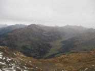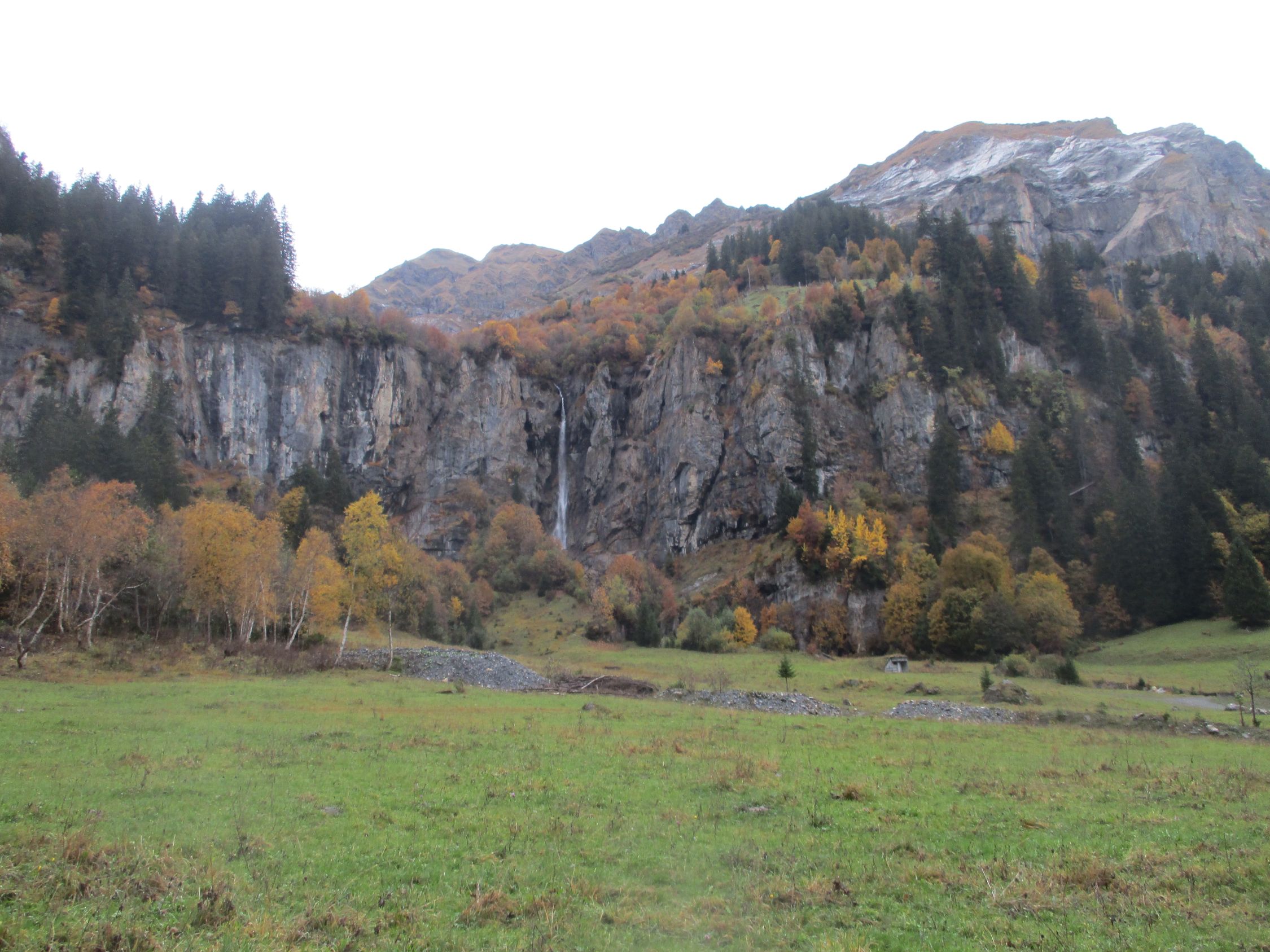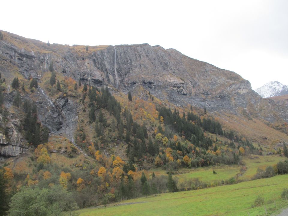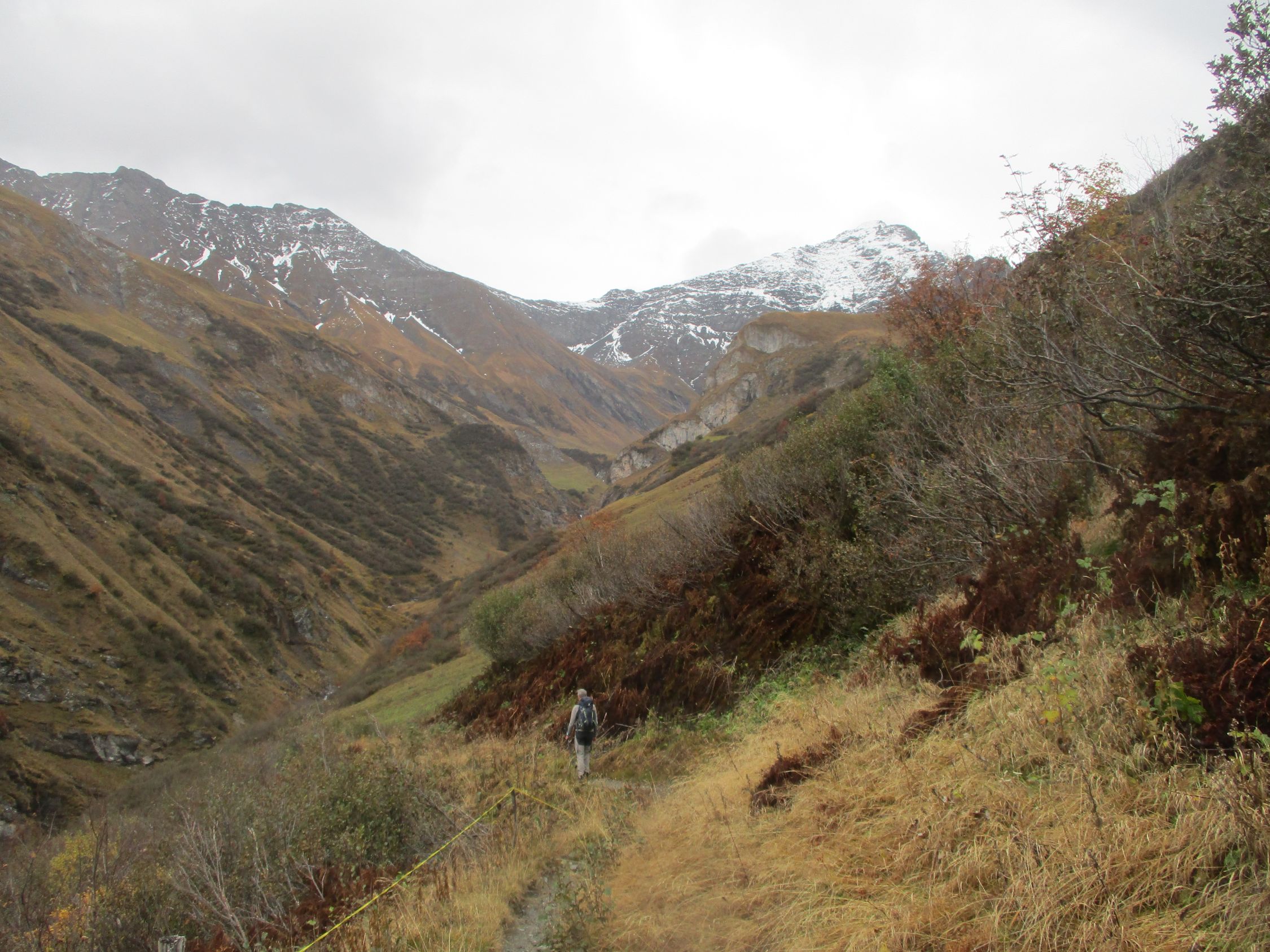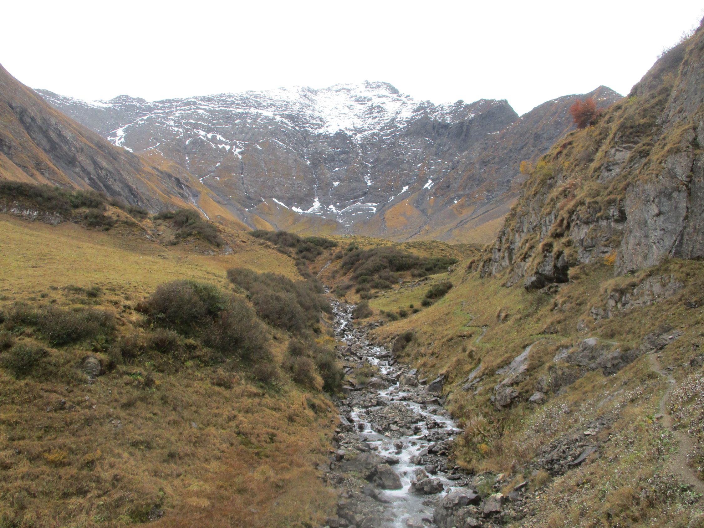 Vegetation in fantastischen Herbstfarben, höhere Gipfel im Umfeld oben schon weiß.