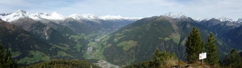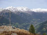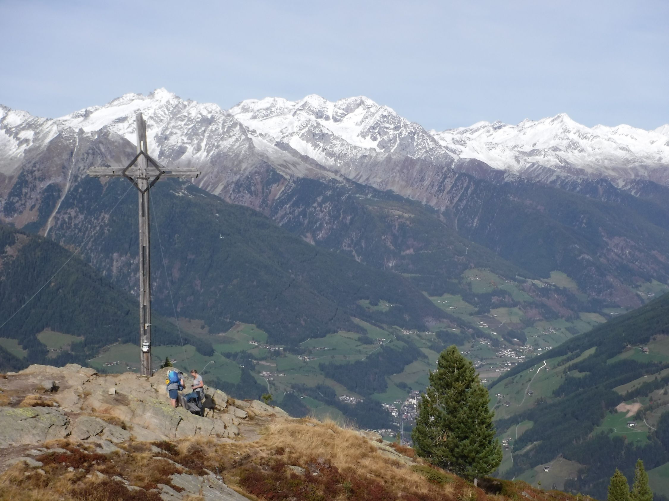 Panoramaberg mit Aussicht zum Hohen Weißzint, Hochferner rechts daneben, Gr. Mösler und Turnerkamp weiter rechts. Mehr nach rechts kommen die Hornspitzen in Sicht links vom Schwarzenstein im Norden. In östliche Richtung hinwendend sieht man die Wollbachspitze und Rauchkofel im Hinteren Ahrntal. Im Osten präsentieren sich Lenkstein weit hinten, Hochgall, Magerstein und Gr. Fensterlekofel (v.l.n.r.).