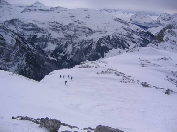 Die Unterlage ist gut. Wird noch besser wenn es Neuschnee gibt. Der Gratrücken ist stark abgeblasen aber man findet genügend Mulden zum Fahren.