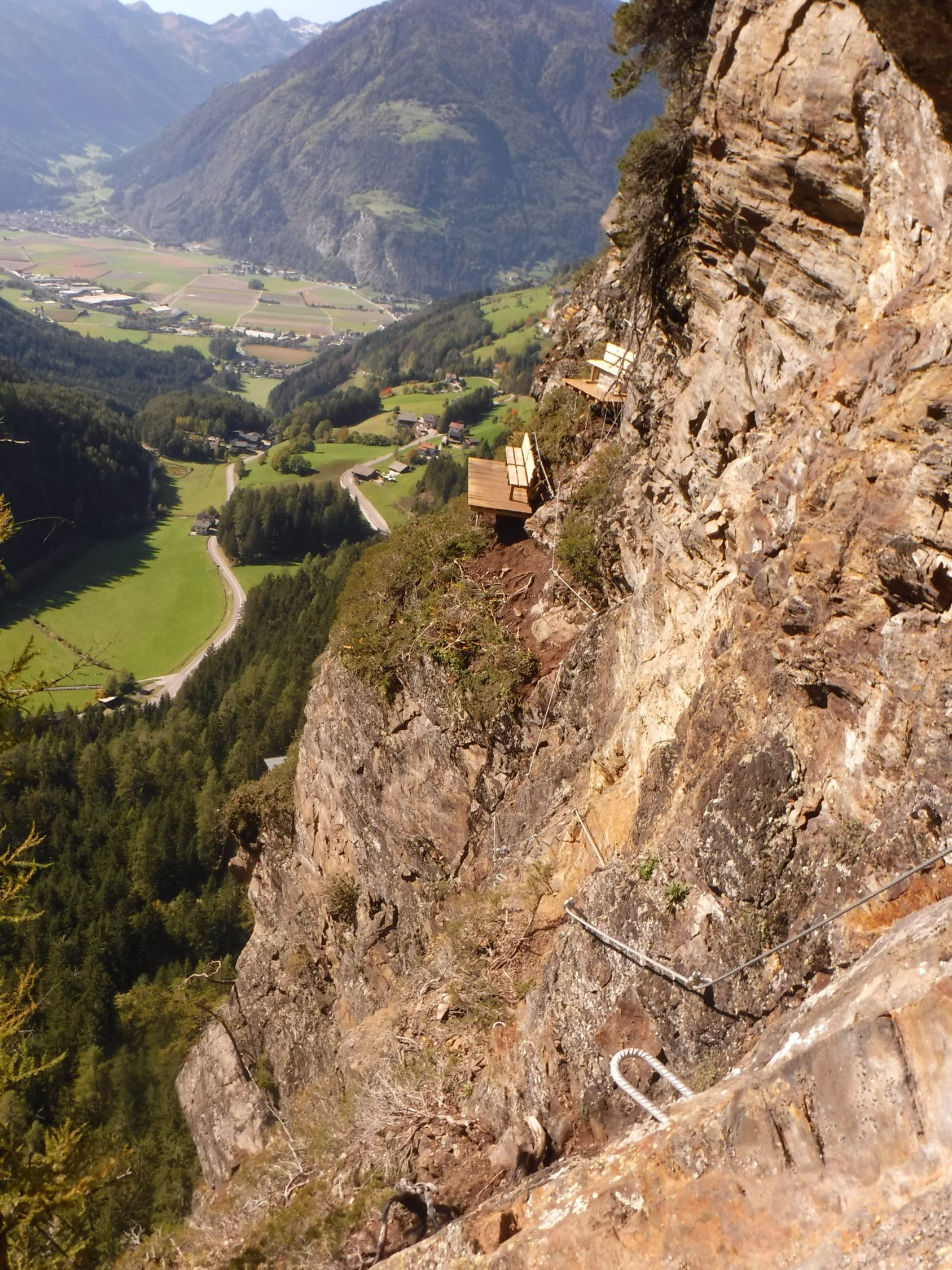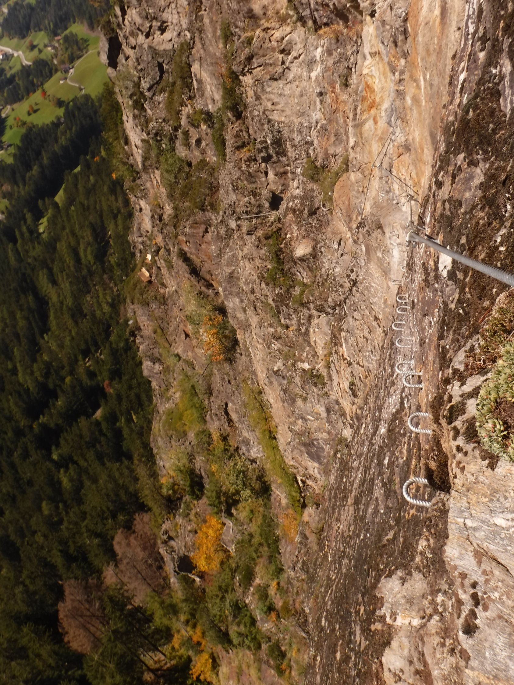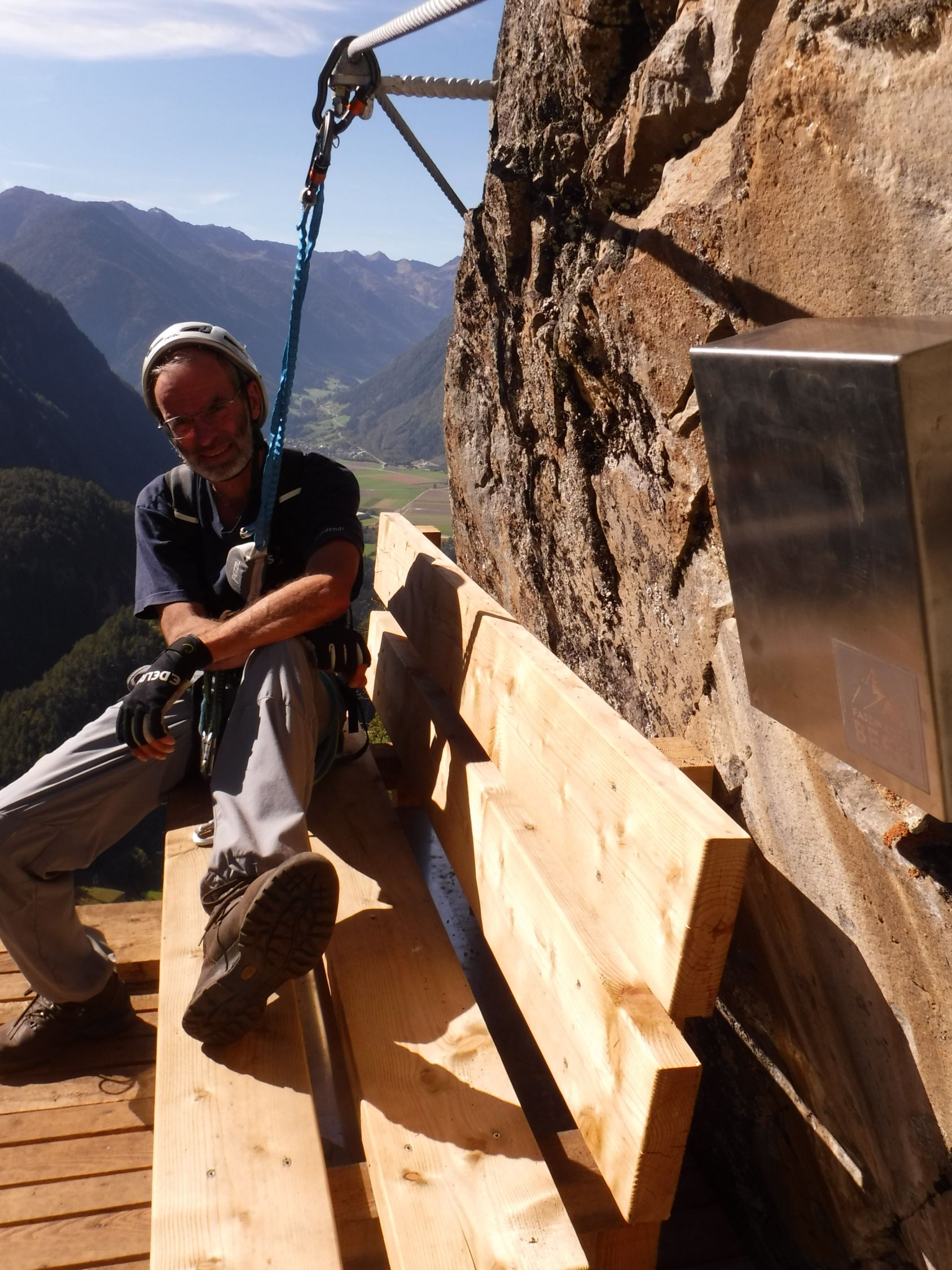 Das graue Steigbuch („Hans Kammerlander Extrem“) wurde am 3.10.2022 gelegt und es wurden die ersten 3 Seiten bereits beschrieben. Ohne Rastschlinge und Expresse hätte ich den Steig nicht geschafft, in einem Zuge durchzuklettern. Sondern ich legte viele Pausen ein gerade nach den Schlüsselstellen. Das (gesicherte) Aussichtsbankerl mit dem Steigbuch war das „Highlight der Erholung“ zwischendurch.
