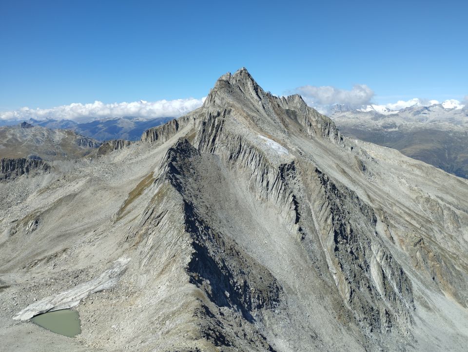 Überschreitung Pizzo Gallina und Mittaghorn über den Ostgrat mit vorherigem Abstecher zum Pizzo Nero. Alles trocken und schneefrei. Start kurz vor 11:00 am Nufenenpass. Pizzo Nero über Westgrat von der Gonerlilücke ohne Schwierigkeiten(T5, I - II). Der Ostgrat zum Pizzo Nero wird von der Gonerlilücke aus meist auf der rechten Seite der Gratkante (N) begangen. Ab und an trifft man auf Steinmänner, dennoch erklärt sich die optimale Wegfindung nicht von selbst. Der letzte Grataufschwung (Pt. 2844) vor der markanten Felstufe, wird ebenfalls rechterhand im Geröll umgangen. Dort hatte ich einen ersten Verhauer und die grossen Felsblöcke, die nur darauf warten, losgetreten zu werden, machten das Unterfangen nicht gerade angenehmer. Nach einigen Versuchen konnte ich die richtige Route jedoch ausfindig machen. Die folgende Felsstufe zum Gipfelaufschwung des Pizzo Gallina wird von links nach rechts erstiegen und ist überraschend gut gestuft. Im Anschluss umgeht man 2 Aufschwünge bevor man den Gipfel erreicht. Den ersten rechts, beim zweiten steigt man von links wieder auf die Gratkante hoch. Vorsicht: Direkt auf der Kante sind die Schwierigkeiten deutlich höher. Ist man auf der richtigen Fährte wird der 2. Schwierigkeitsgrad jedoch kaum überschritten. Unglaublich, was für skurrile Felsformationen hier vorzufinden sind. Viele bleiben besser unberührt, da sie definitiv keinen stabilen Eindruck hinterlassen.