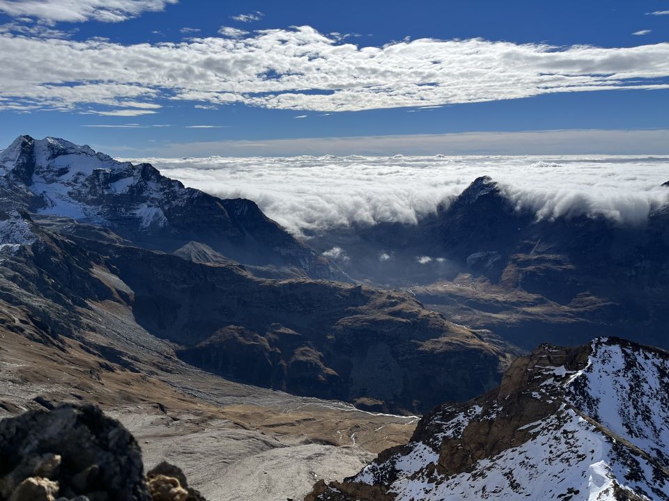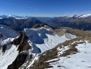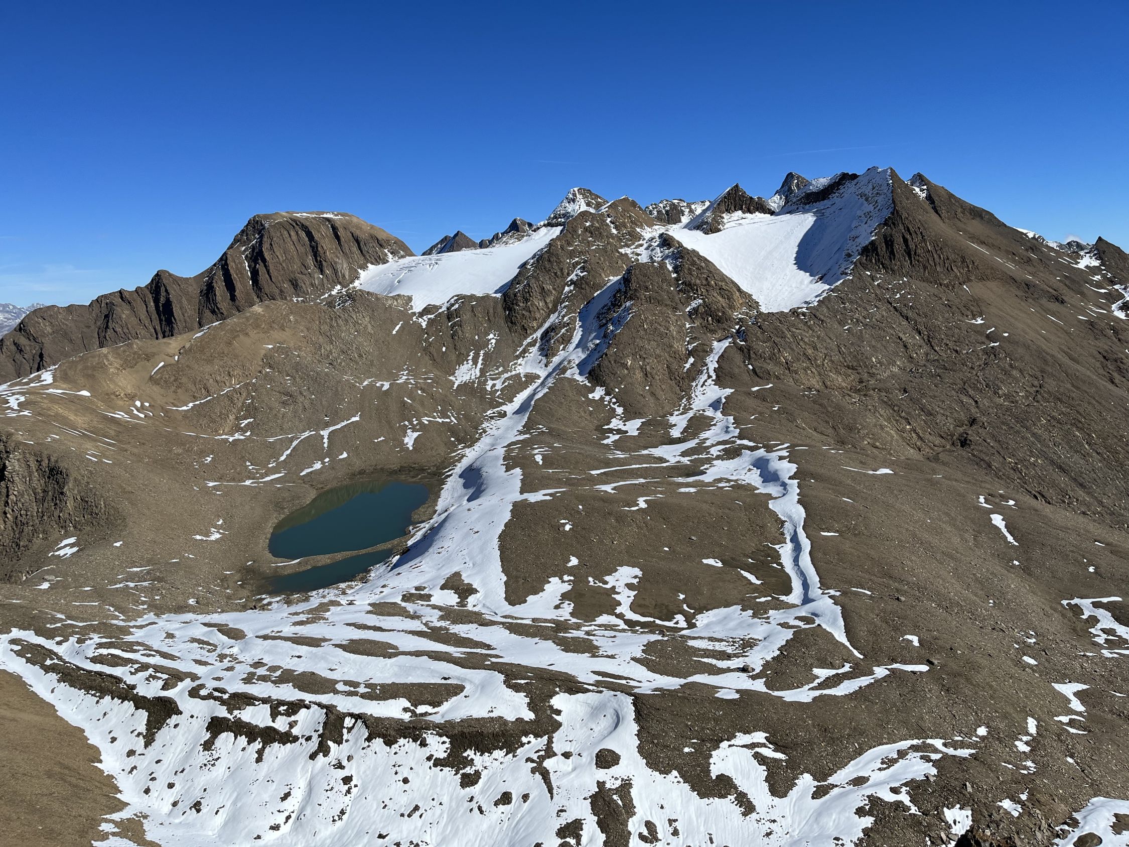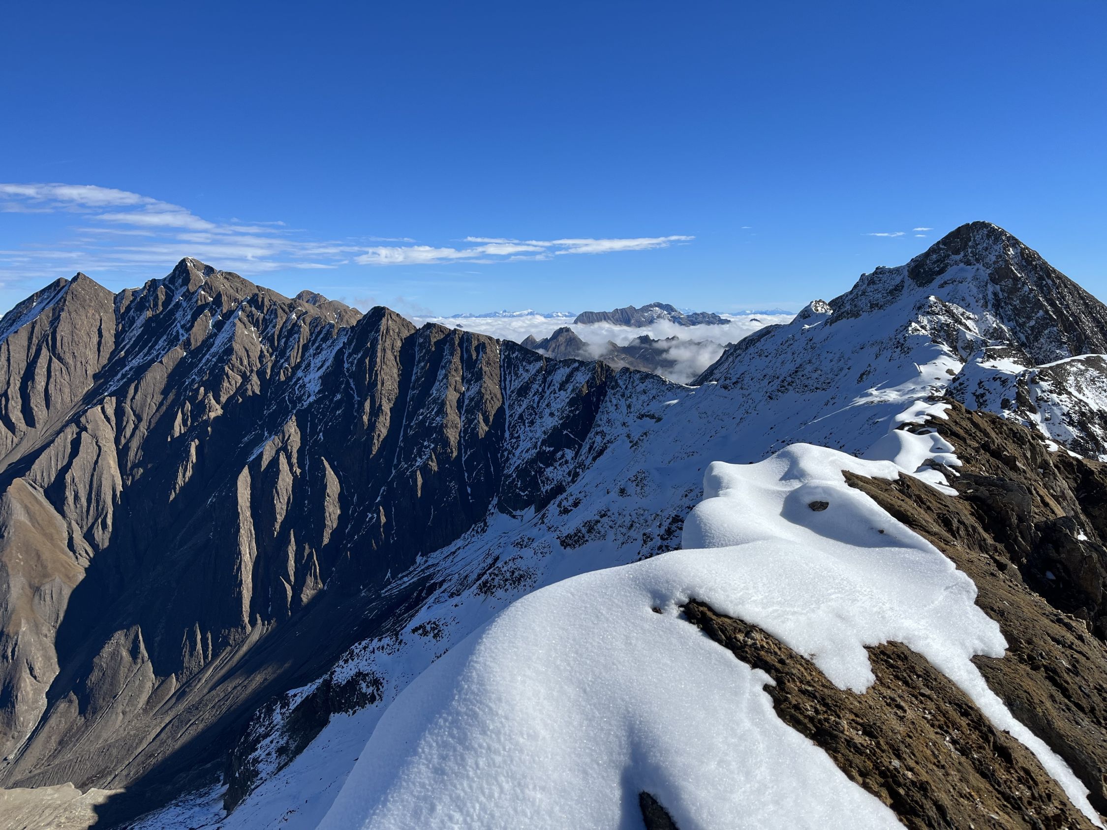 Schnee ab etwa 2900 m, besonders nordseitig auch tiefer. Sehr gut begehbar (Trittschnee)