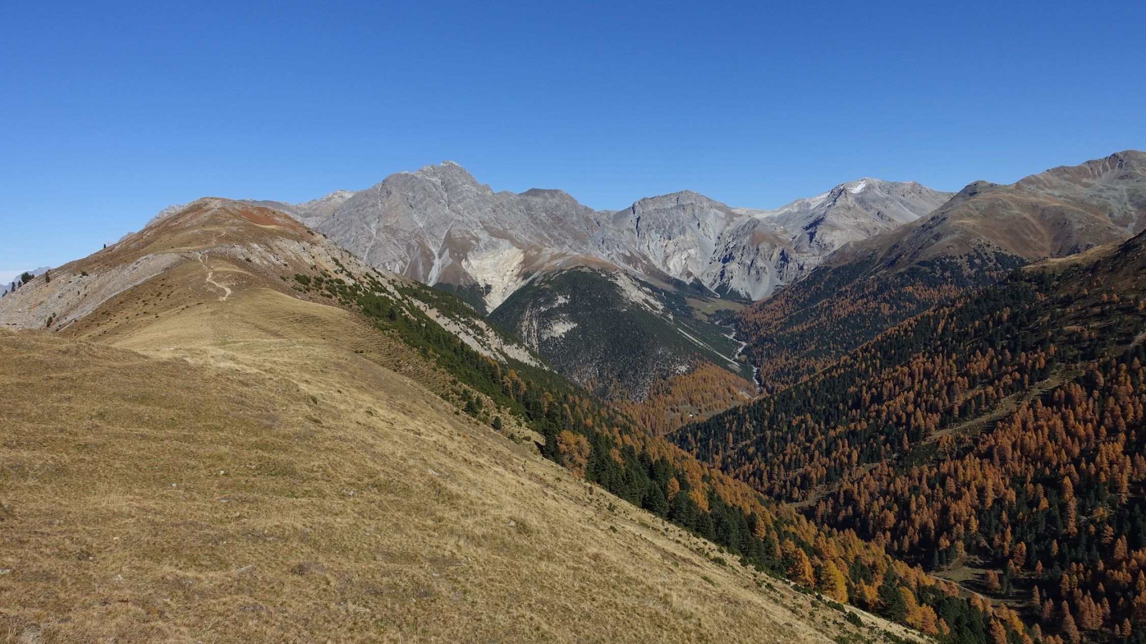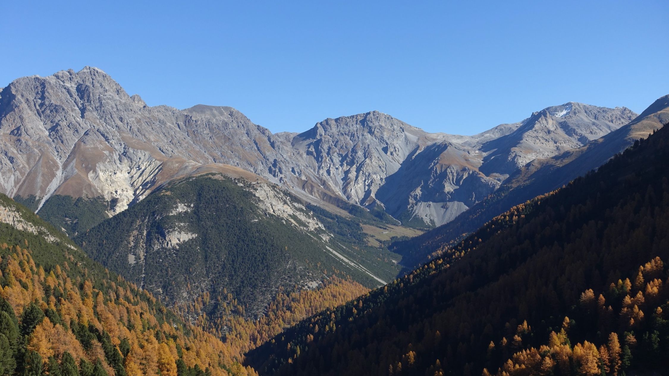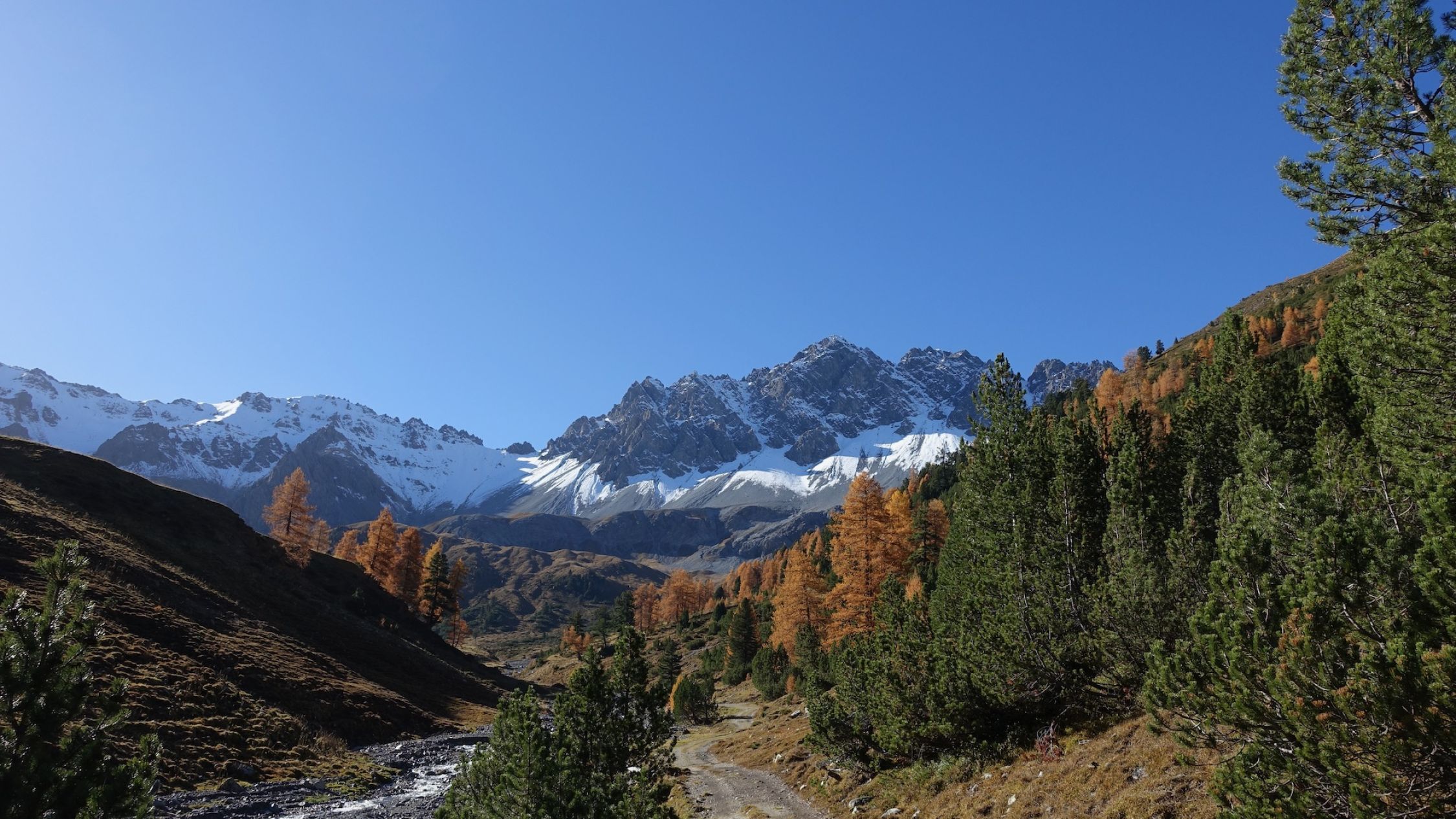 Perfekte Bedingungen: Recht warm, strahlender Sonnenschein und farbige Lärchen.