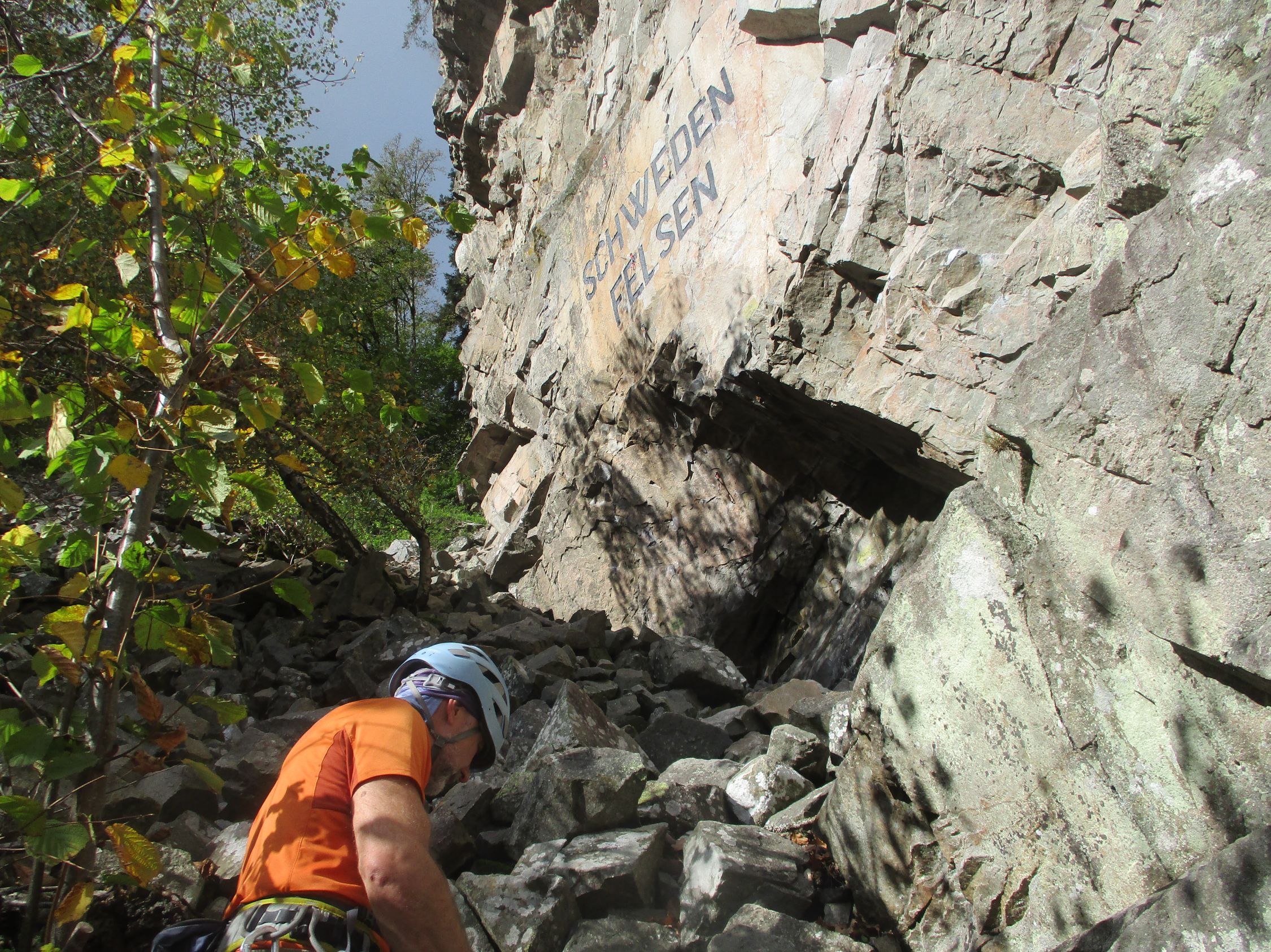 Der Schwedenfels mit seinem Überhang nach oben hinaus geht praktisch immer auch nach oder gar bei Regenwetter. Dort waren wir am Samstag, Die Routen dort sind allerdings fast alle schwer bis sehr schwer.