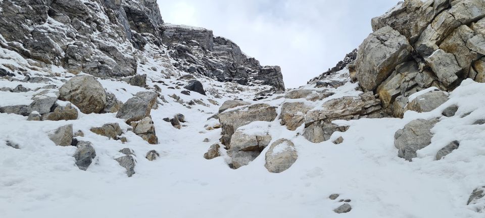 Die Sommer Begehung der Nordost Rinne wird zunehmend anspruchsvoller, da plattige Kletterstellen in teilweise brüchigem Fels vermehrt vorkommen. Ebenfalls ist der Steinschlag nicht zu unterschätzen.