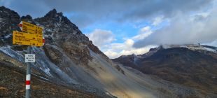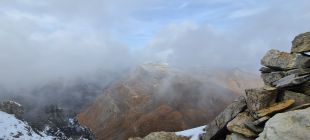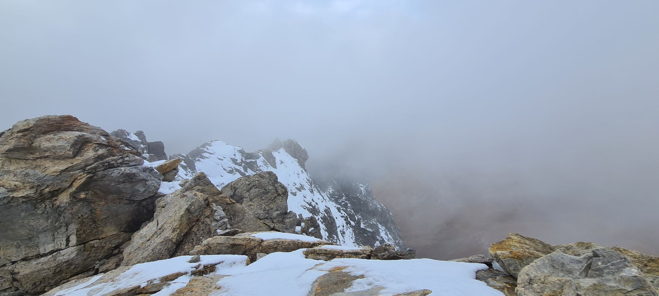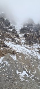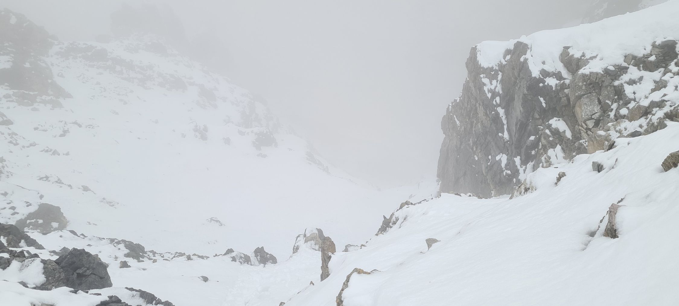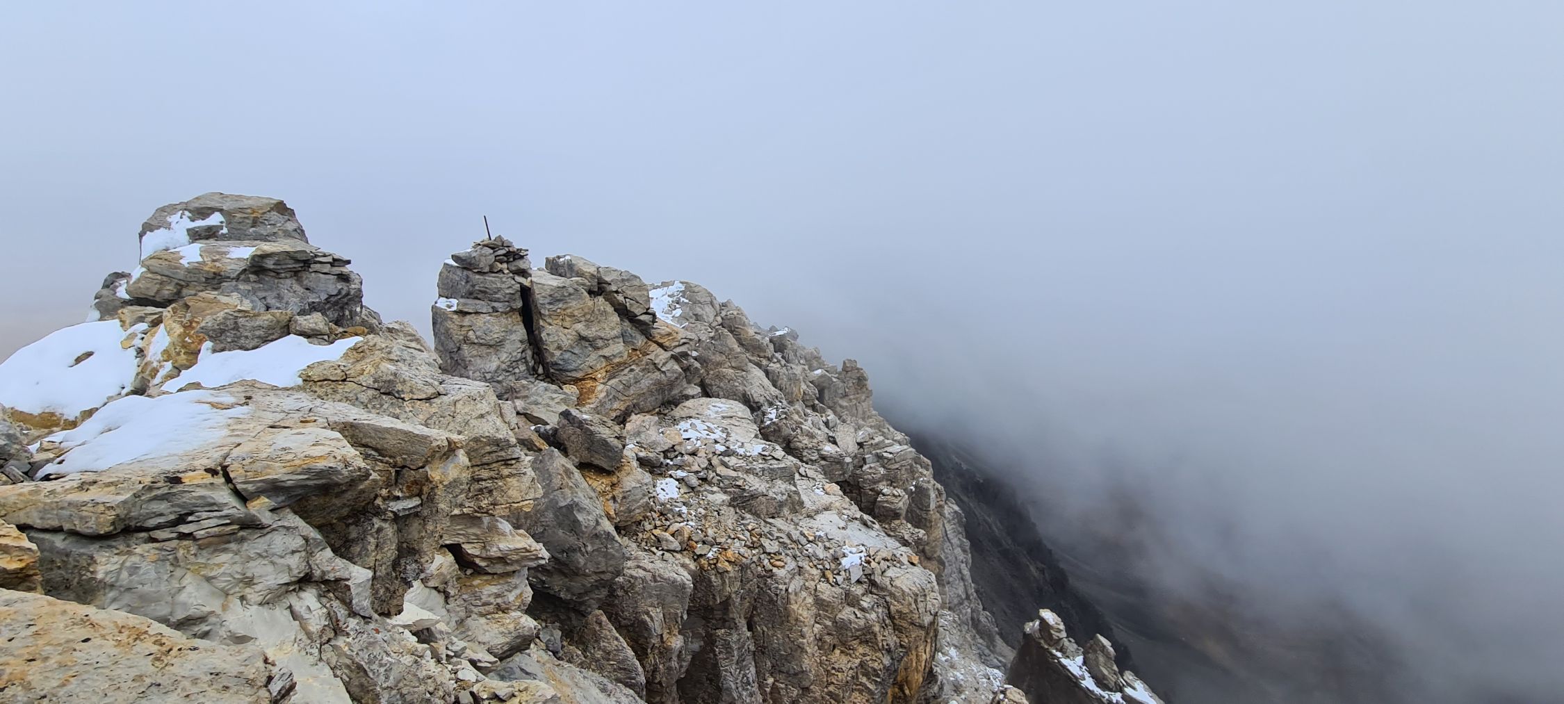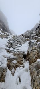 Heute war das Wetter eher abweisend. Starker Föhn und immer wieder leichter Niederschlag. Im Nordost Couloir kam dann noch starker Nebel dazu. Am Gipfelgrat blies dann ein richtiger Orkanwind.