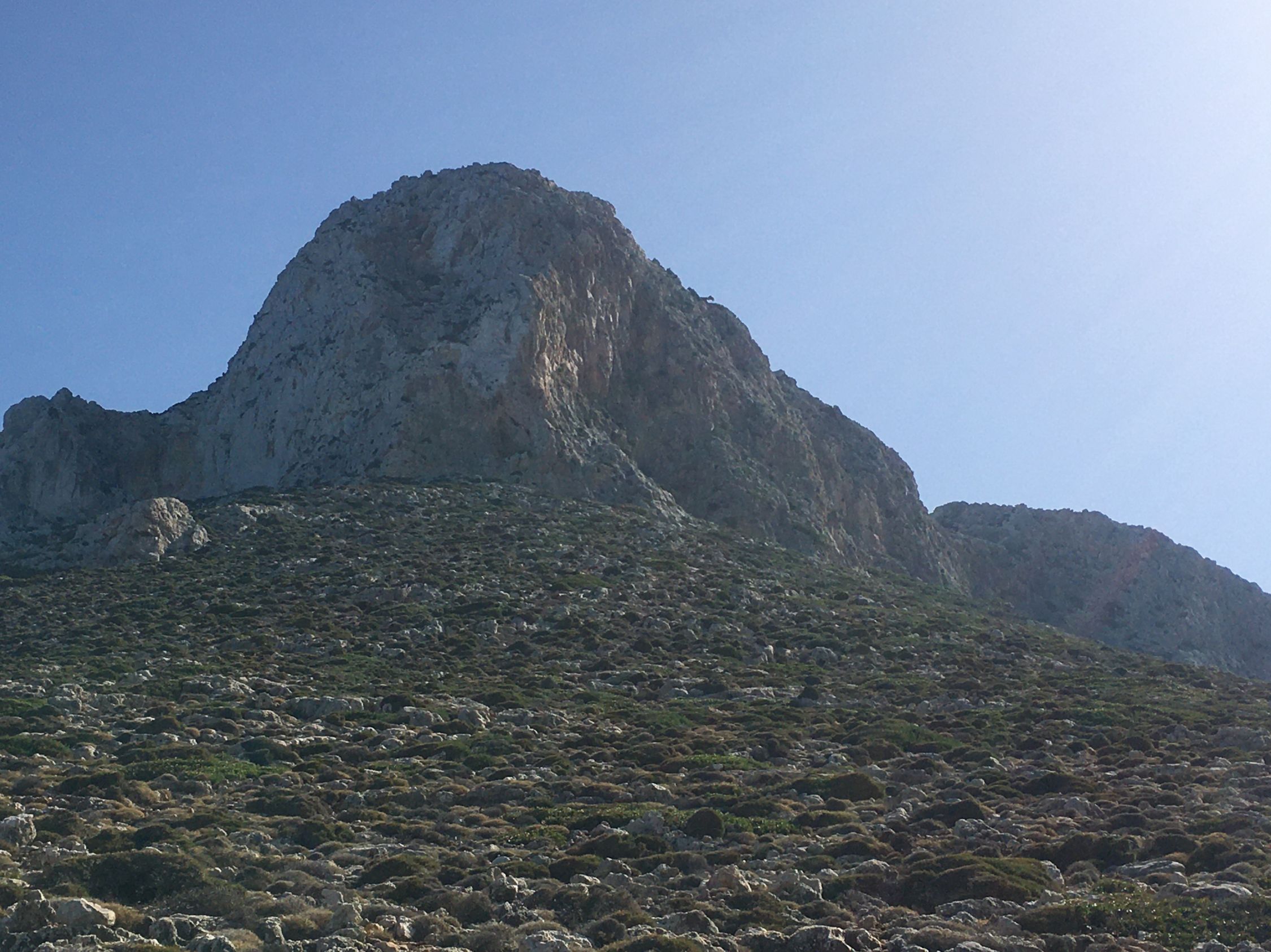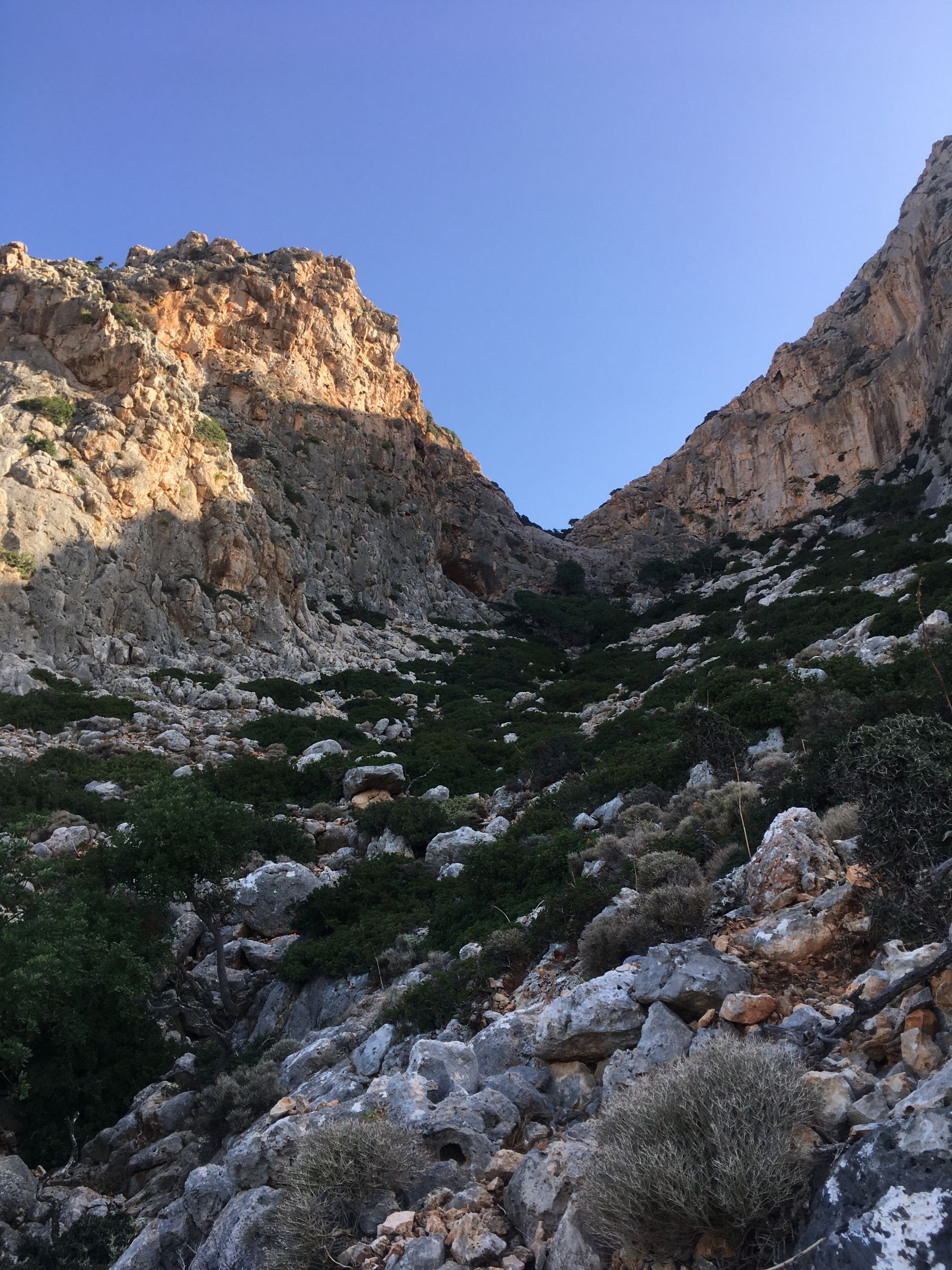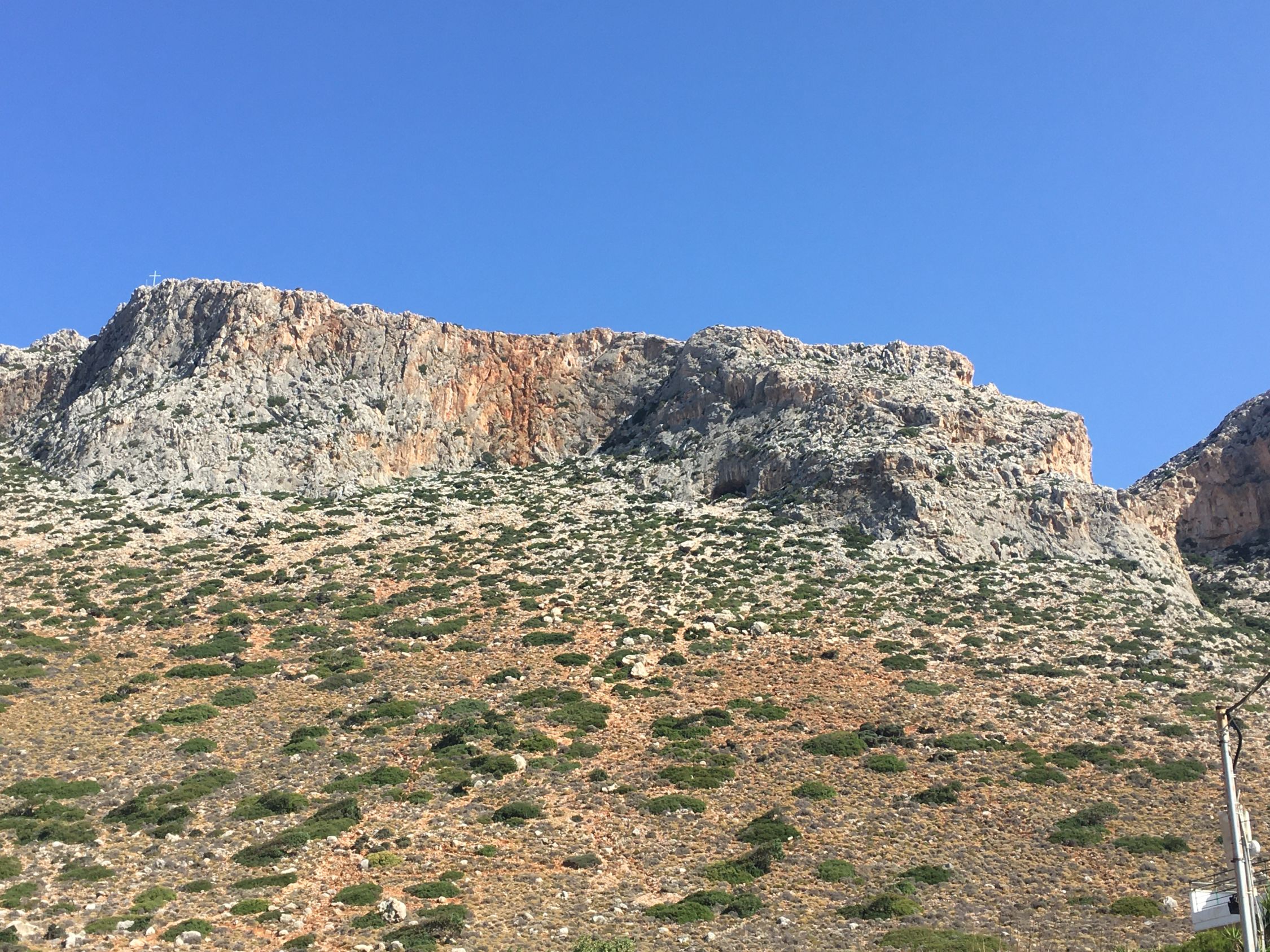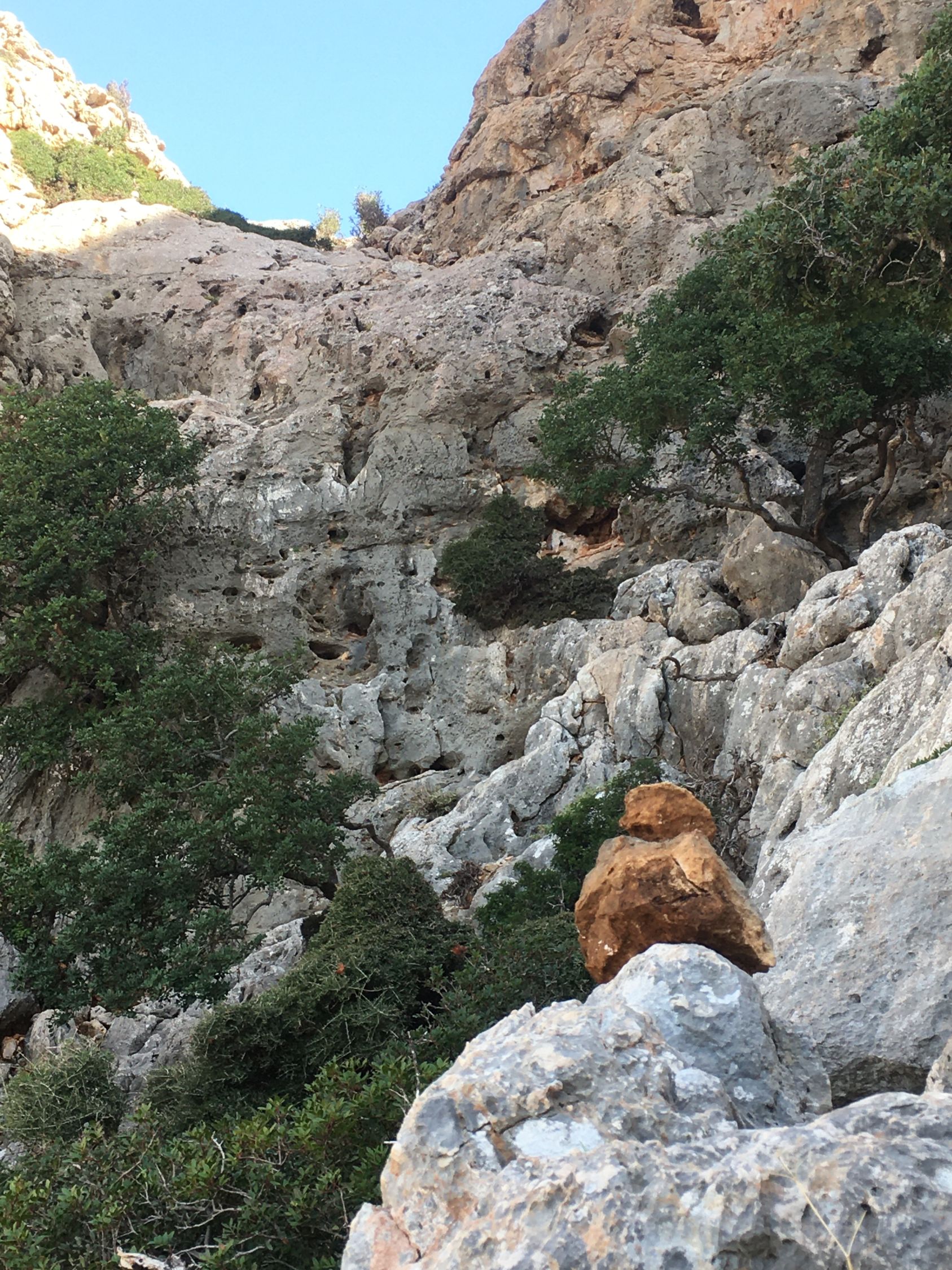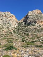 Start Stavros Beach 10 Uhr, windstill, 20 Grad. Im Einschnitt zuerst mässig steil und ab 100 m Schatten. Eine kleine Schildkröte scheint sich hier verirrt zu haben. Bis Schlüsselstelle steiler und Schwierigkeit T4. Beim Stahlseil am Ende des Einschnittes war für mich Schluss, hatte keinen Klettergurt im Rucksack. Schade, auch heute kein Gipfelerlebnis.
