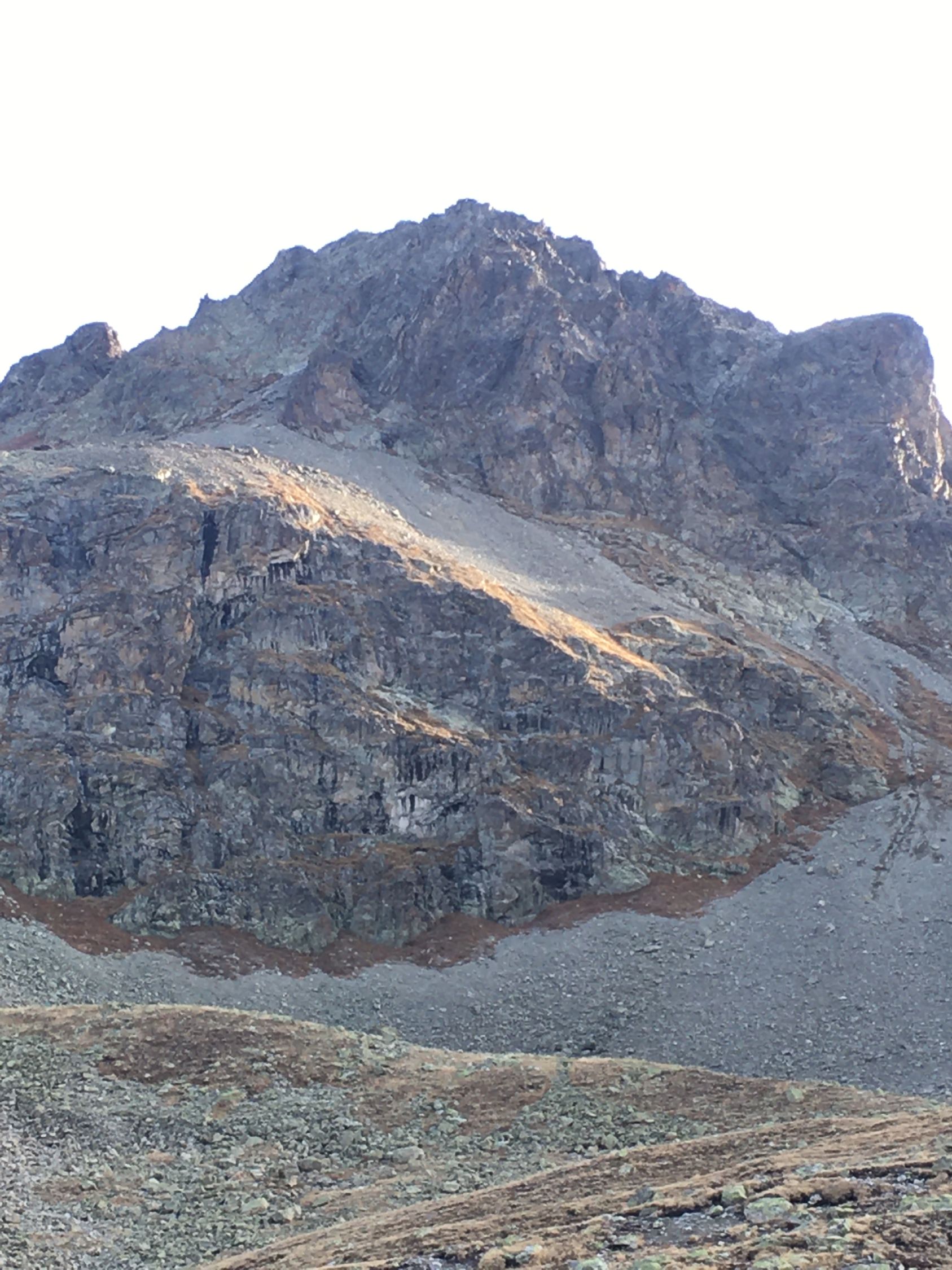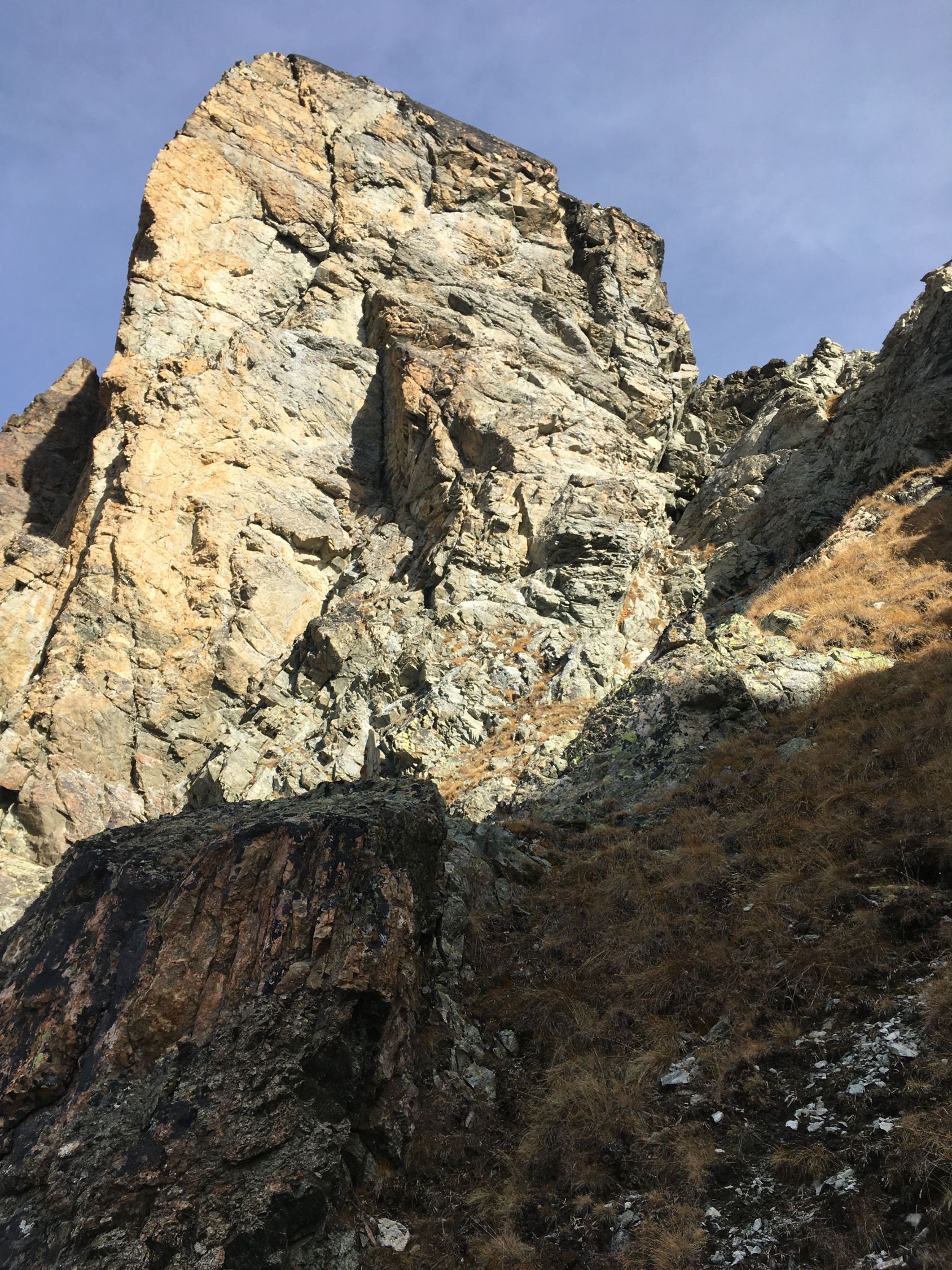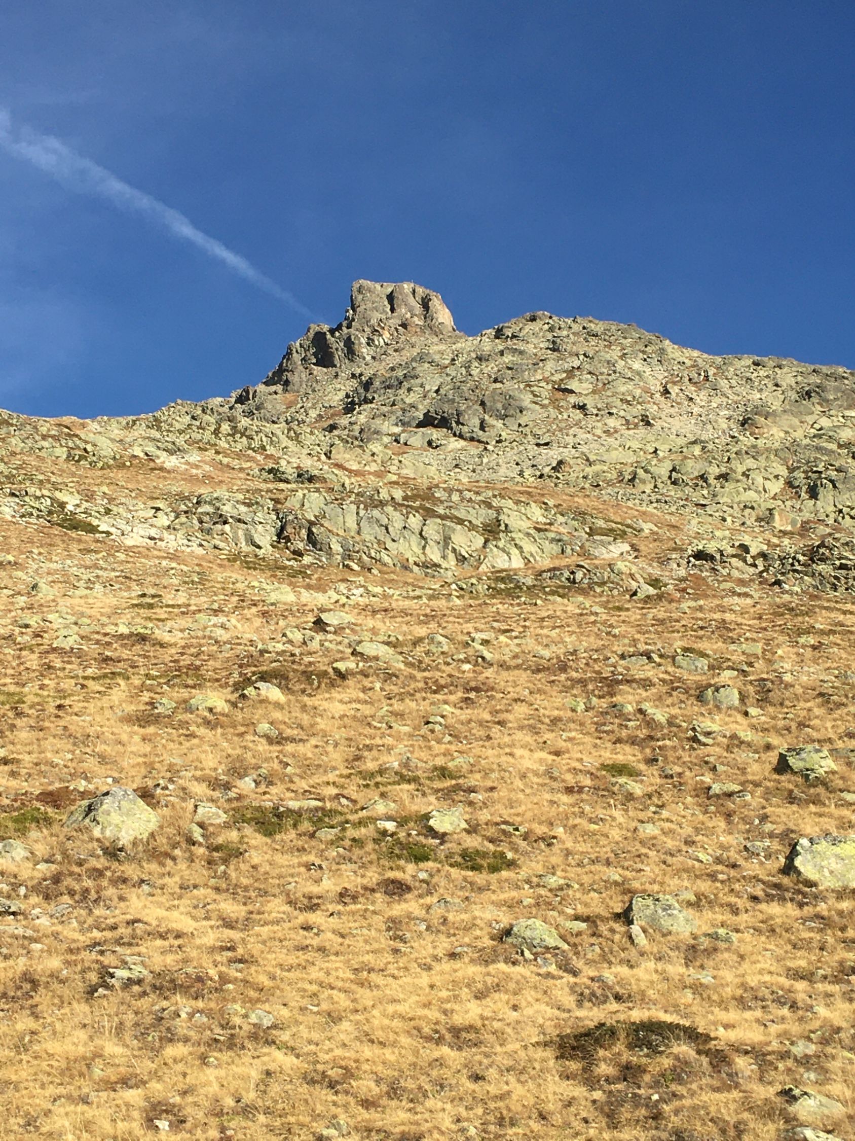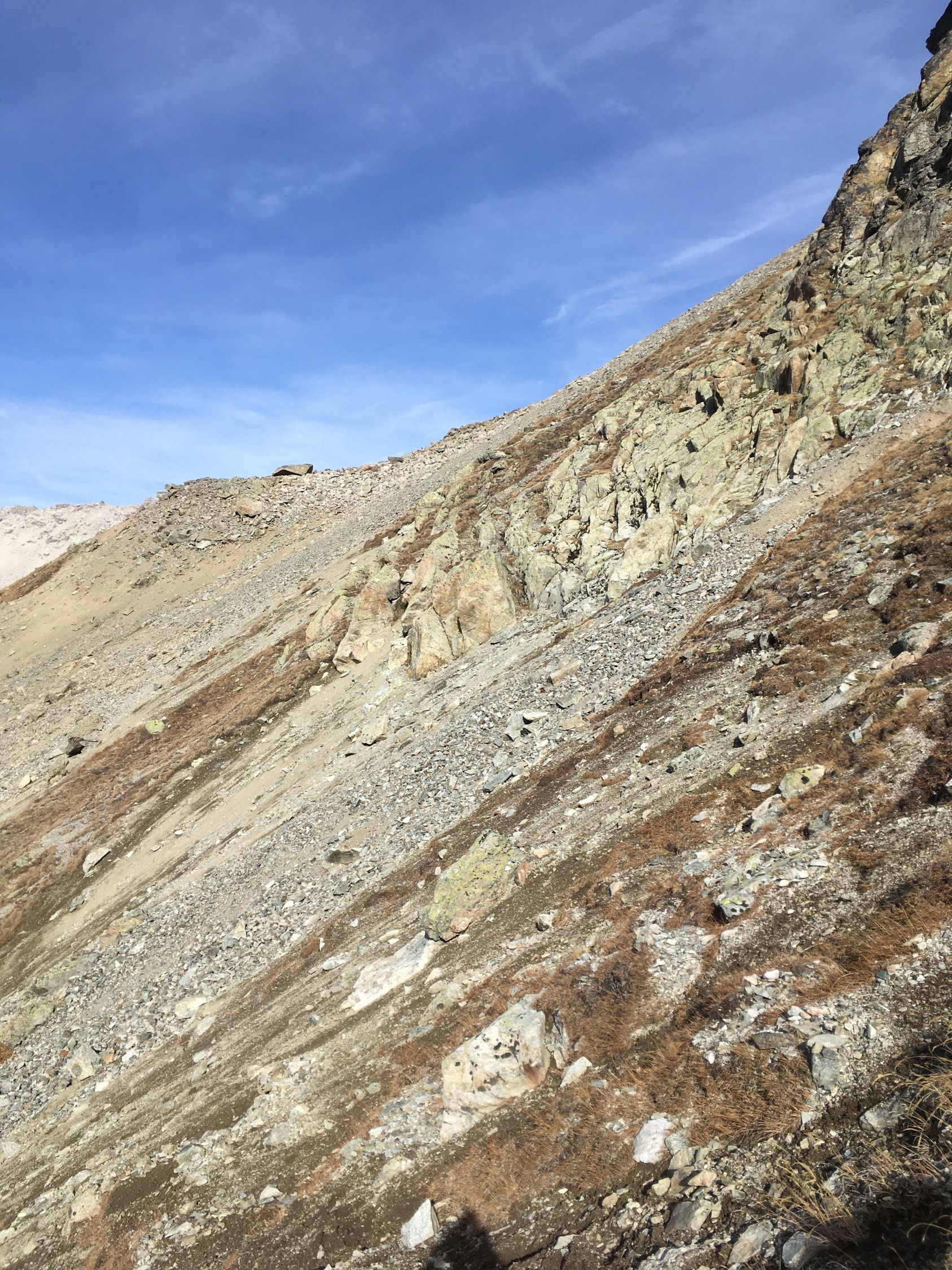 Start um 9 Uhr Parkplatz oberhalb La Veduta, 4 Grad, windstill. Ich wollte heute die neuerdings eingetragene Skitourenroute ausprobieren. Bin dann etwas mühsam unterhalb der Felsen unterhalb des Plateaus westlich des Südgipfels traversiert. Habe dann auch noch die Abzweigung nach links verpasst und merkte es erst als die Schwierigkeiten bald T6 erreichten. Schaute auf die Karte und musste wieder ein schönes Stück absteigen und dann die geröllige Traverse machen und kam dann endlich mühsam auf das Plateau. Ich kann diese Route auf keinen fall empfehlen, besser die beiden steilen Couloirs etwas weiter nördlich nehmen, ist einfacher. Im Winter ist diese Route nach meiner Einschätzung gefährlich, einfach zu steil. Auf dem Plateau weiter und die Südflanke rechts ausgesetzt umgangen und auf Geröll unschwierig zum Gipfel. Für den Abstieg bin ich dann direkt die Südflanke runter und das erste Couloir war ganz ordentlich. Nun weiter etwa wie Aufstieg. Um die Felswand unterhalb des Plateaus viel loses Geröll!
