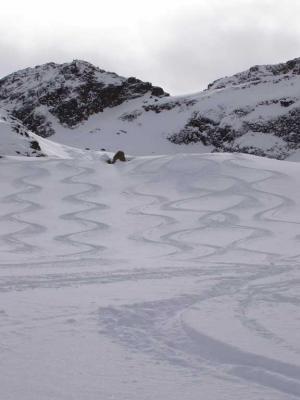 Abfahrt: Vom Gipfel bis ca. 2200 schönste noch wenig verfahrene Pulverhänge, dann zunehmend fauler Schnee.