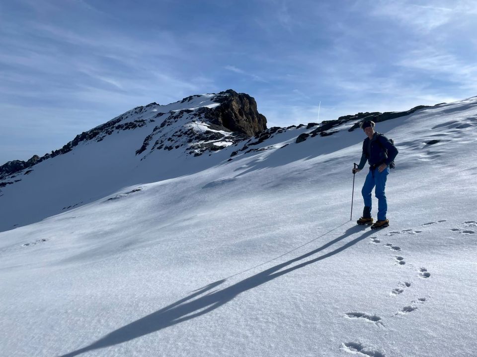 Bis zur Kette auf rund 2750m mehrheitlich schneefrei und super zu laufen. Ab dort zunehmend schneebedeckt. Ab dem Joch mit Steigeisen auf hartem Schnee zum Gipfel.