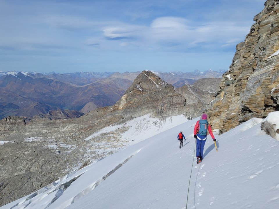 Abstieg über Normalroute geht gut bei hartem Schnee. Bergschrund kann einfach überwunden werden.