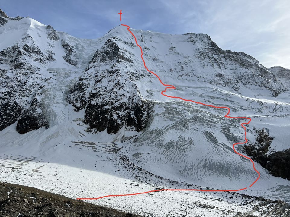 Anspruchsvoller Zustieg zur Wand. Am besten am Vortag mit dem Fernglas von der Hütte aus schauen. Unseren Routenverlauf habe ich eingezeichnet (s. Bild). Unter dem 10m hohen senkrechten Bergschrund konnten wir rechts über einen Eisklemmblock gerade noch spektakulär rüber. Alternativ ganz links probieren. Unten leider inzwischen zunächst felsiges Gelände. Danach guter Trittfirn. Nachdem Eis drunter war sind wir mit Rücklaufsperren rauf. Den senkrechten Eiswulst am Ausstieg sind wir links umgangen (blank um die 65 Grad). Abstieg zur Hollandiahütte hat auch noch einige große Spalten, die wir in der Dämmerung gerade noch gut sehen und umgehen konnten.