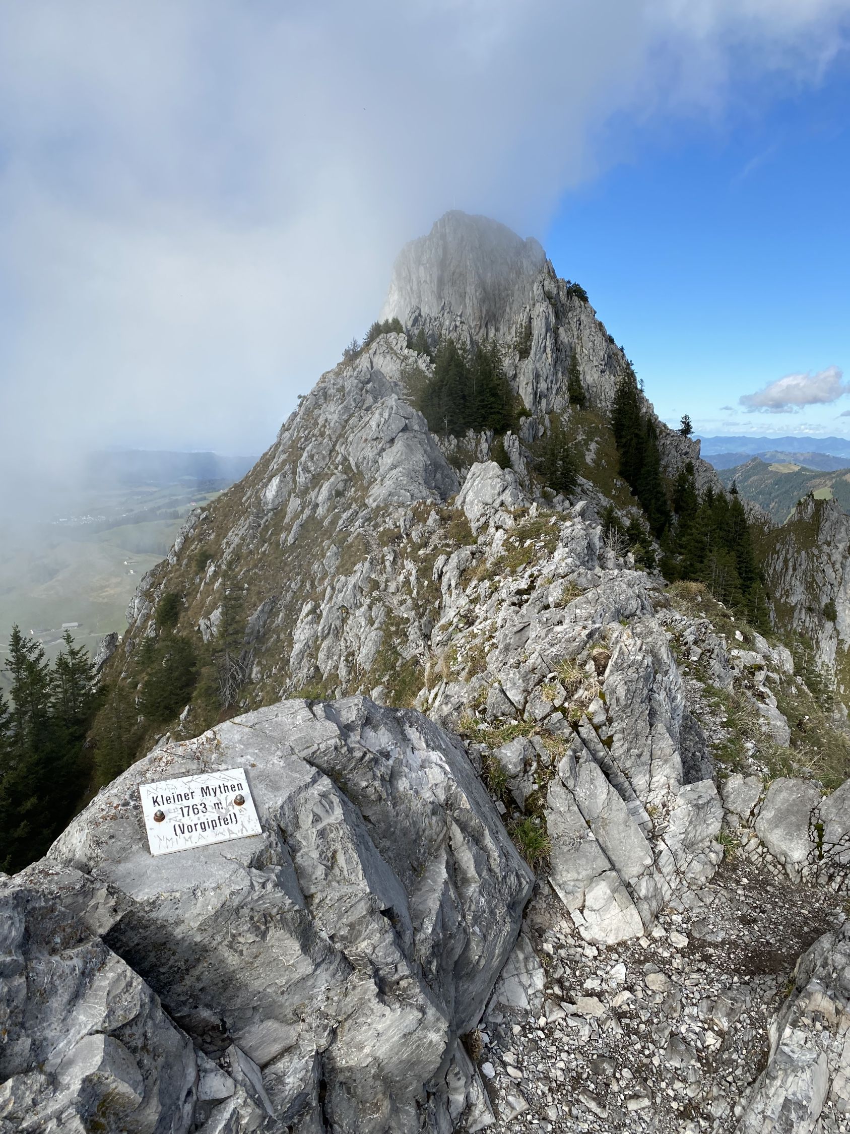 Abstieg zum Griggeli und direkt weiter zum Kleinen Mythen. Auf mehr oder weniger trockenen Wegen, das letzte Stück über wegloses Gelände, aber diesen Weg kenne ich schon in- und auswendig. Um 15:15 kam ich auf dem Grossen Mythen an, auf dem es sogar noch 2-3 andere Wanderer gab.