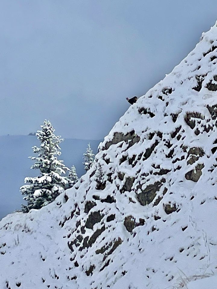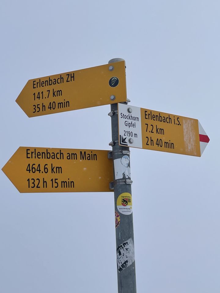 Some rain and snow early then cloudy skies. Start from Erlenbach Bahnhof route via Oberbärgli after Hinterstockesee then to the top. Trail markers snow covered after p. 1852. Many chances to see Gamsen higher up. Delicious Menu in the Panorama Restaurant.