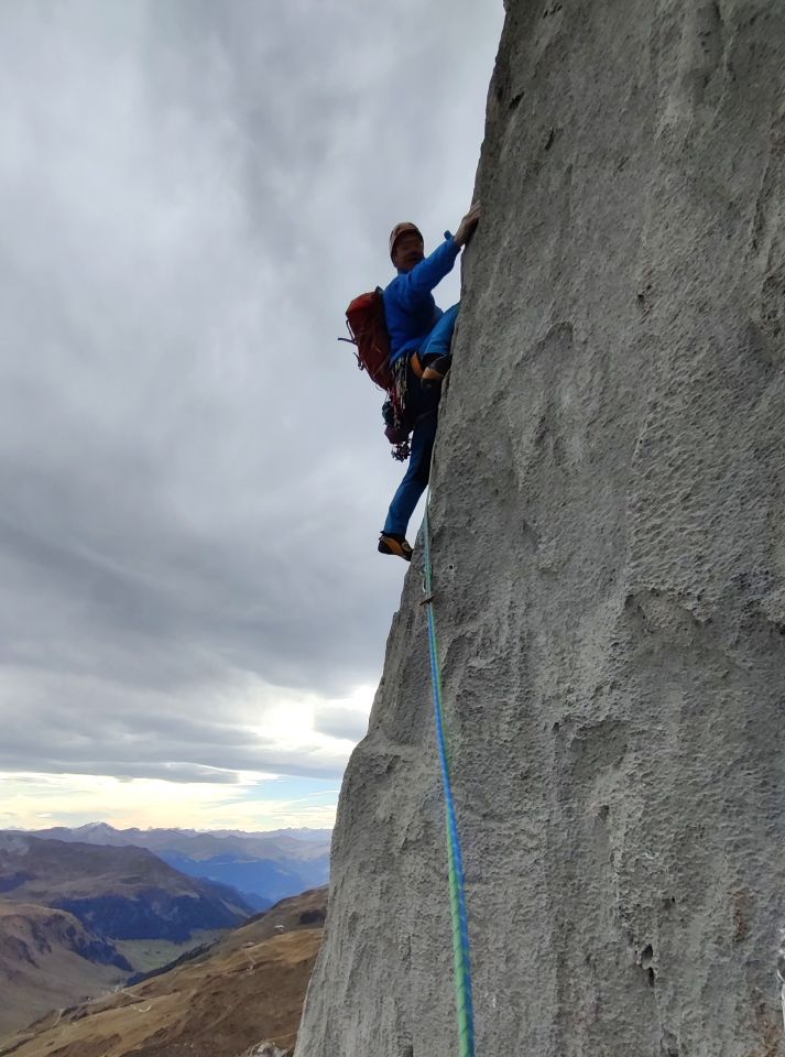 SL1/2: immer den Bh nach (ordentlich gesichert für die Gegend). SL3: Start schon mal richtig was zum klettern, danach über etwas dreckigen Fels (Wasserrinne) immer schon schräg nach links auch wenn man die Bh wegen Drecküberzug nicht blinken sieht. SL4: ein echtes Prachtstück – durchweg gut und interessant (7-). SL5 aufs Grasband und dort hoch zur Höhle (dort Rialto angeschrieben.). SL6: schräg nach R den rissen entlang, dann immer nach oben, egal wo. Nach 45 m kommt das Band mit Stand. SL7 ähnlich. SL8: eher R halten, Richtung kante (brauner Fels, und dort Steilaufschwung. SL9. Vom Stand am Grasband (kette ist neben weißem großen Fleck) den Bh entlang hoch. SL10: kurz (30 m) und leicht; über Rampe nach L zu Stand an Kante. SL11: über die platten nach L hoch zum Überhang. Dort mit Power hoch (7; Crux an Dachkante) und dann leicht die platten weiter zu Stand (ca. 35 m). SL12: Nochmal ein Goldstück. Fels noch besser, Einstieg recht bouldrig, ca, 40 m lang, 7-. SL13: schöner Ausklang, sehr fotogen.