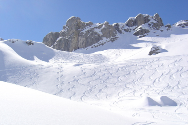 Super Schneeverhältnisse, in den schattigen Mulden noch Pulver vom Feinsten.Ab etwa 1700m recht guter Sulzschnee.