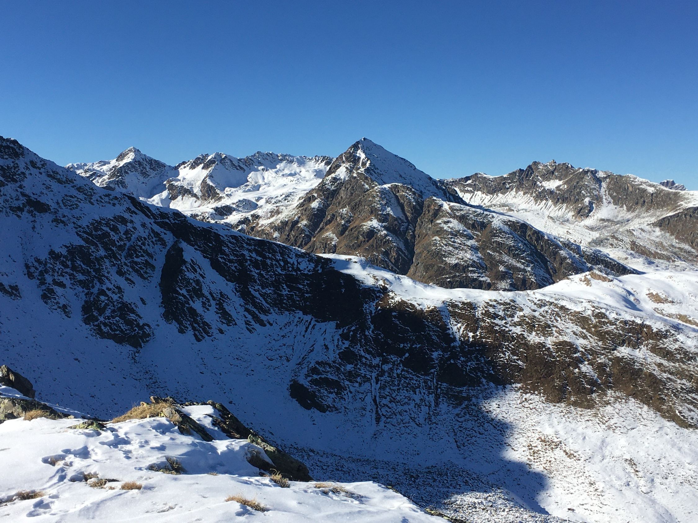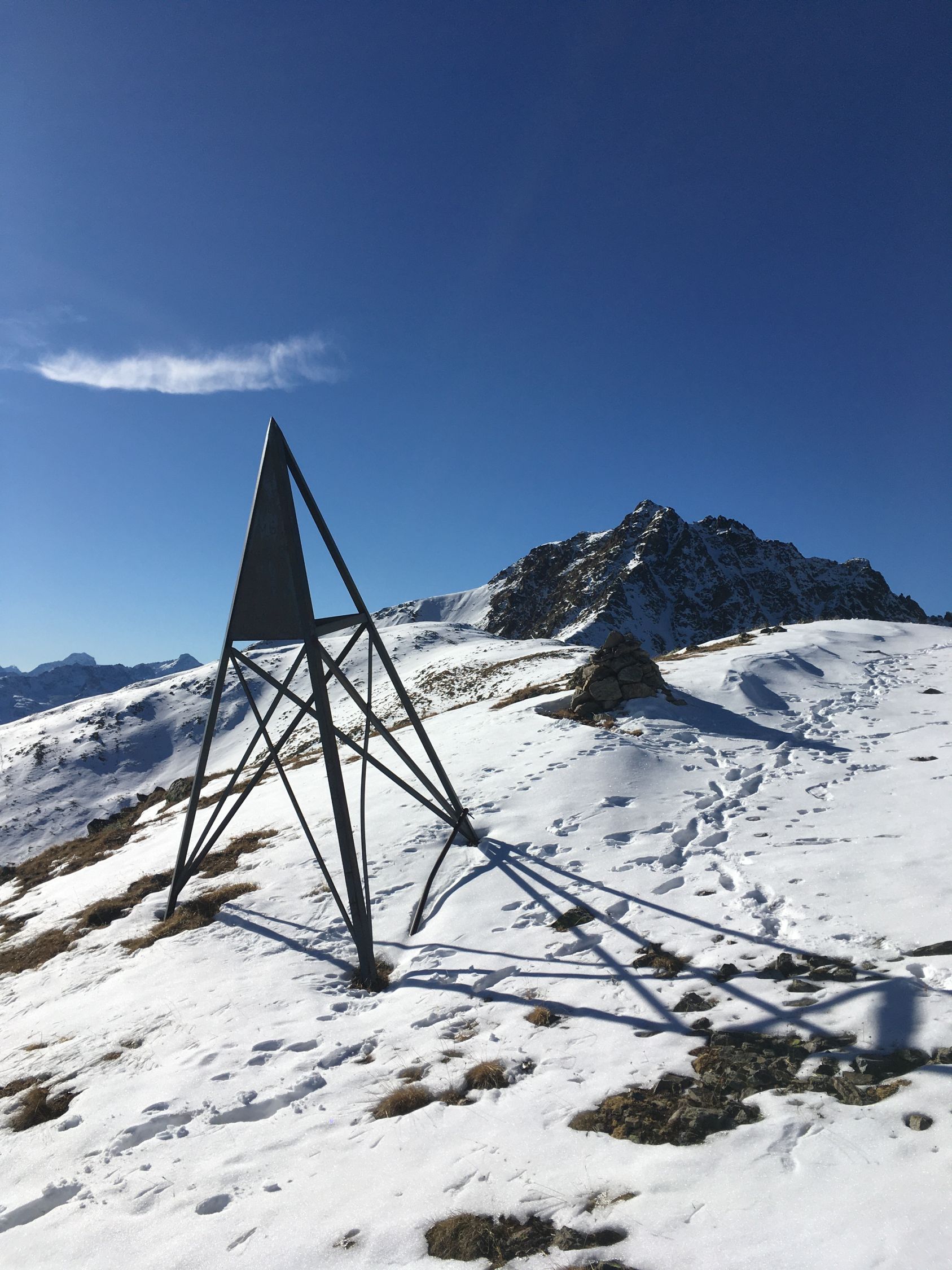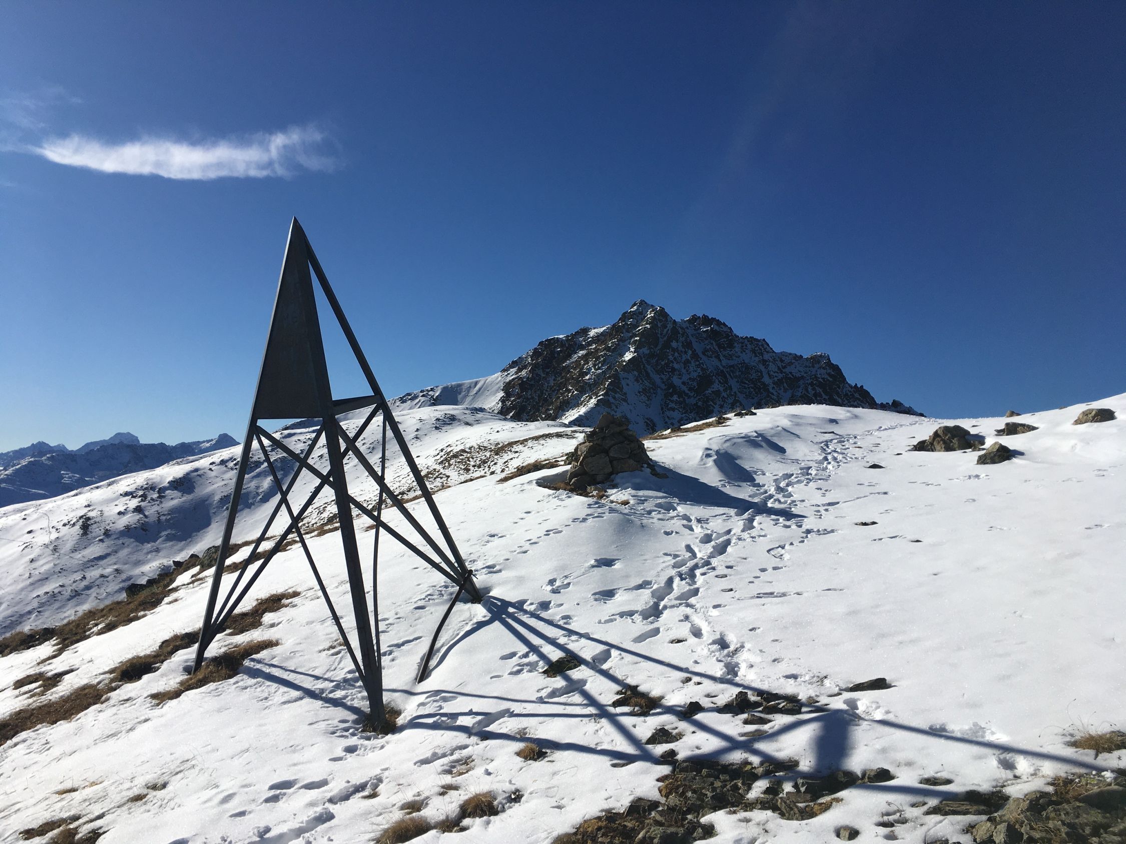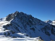 Start 8.45 Uhr Parkplatz Baubaracken Rocca Hotz zwischen Zuoz und S-chanf, minus 2 Grad, windstill. Ab 9 Uhr Sonne, Pause bei Alp Griatschouls, ein Raum im Alpgebäude ist das ganze Jahr geöffnet. Jetzt auf Alpsträsschen bis Ostrücken und dann weglos Richtung Gipfel. Ab Höhe 2550 m etwas Schnee und ab Höhe 2600 m ca, 20 cm Schnee, aber problemlos bis Gipfel. Auf dem schönen Aussichtsgipfel sehr kalt und windig. Abstieg wie Aufstieg.