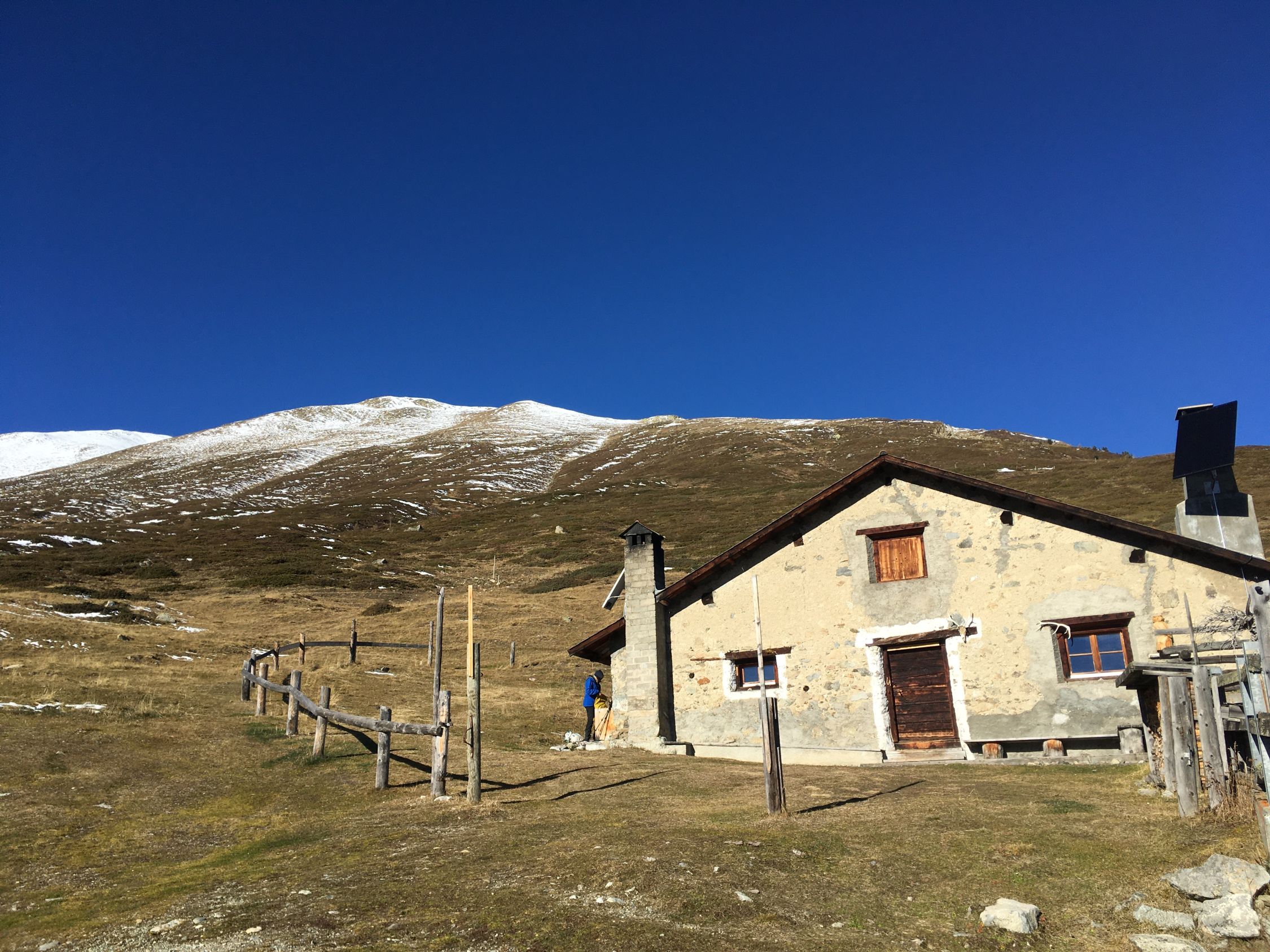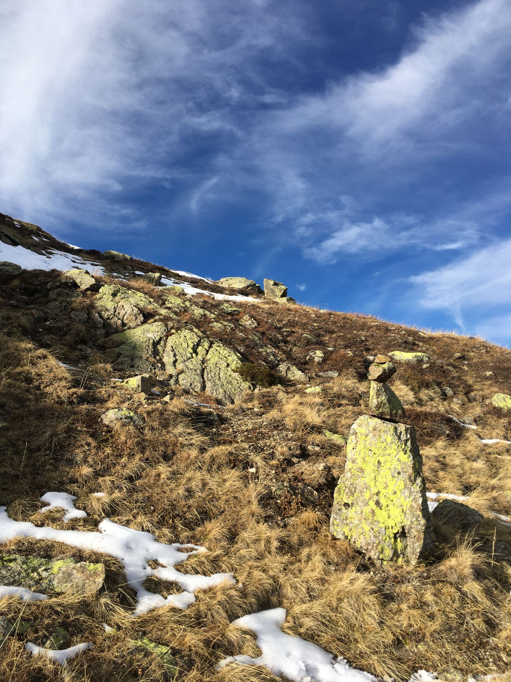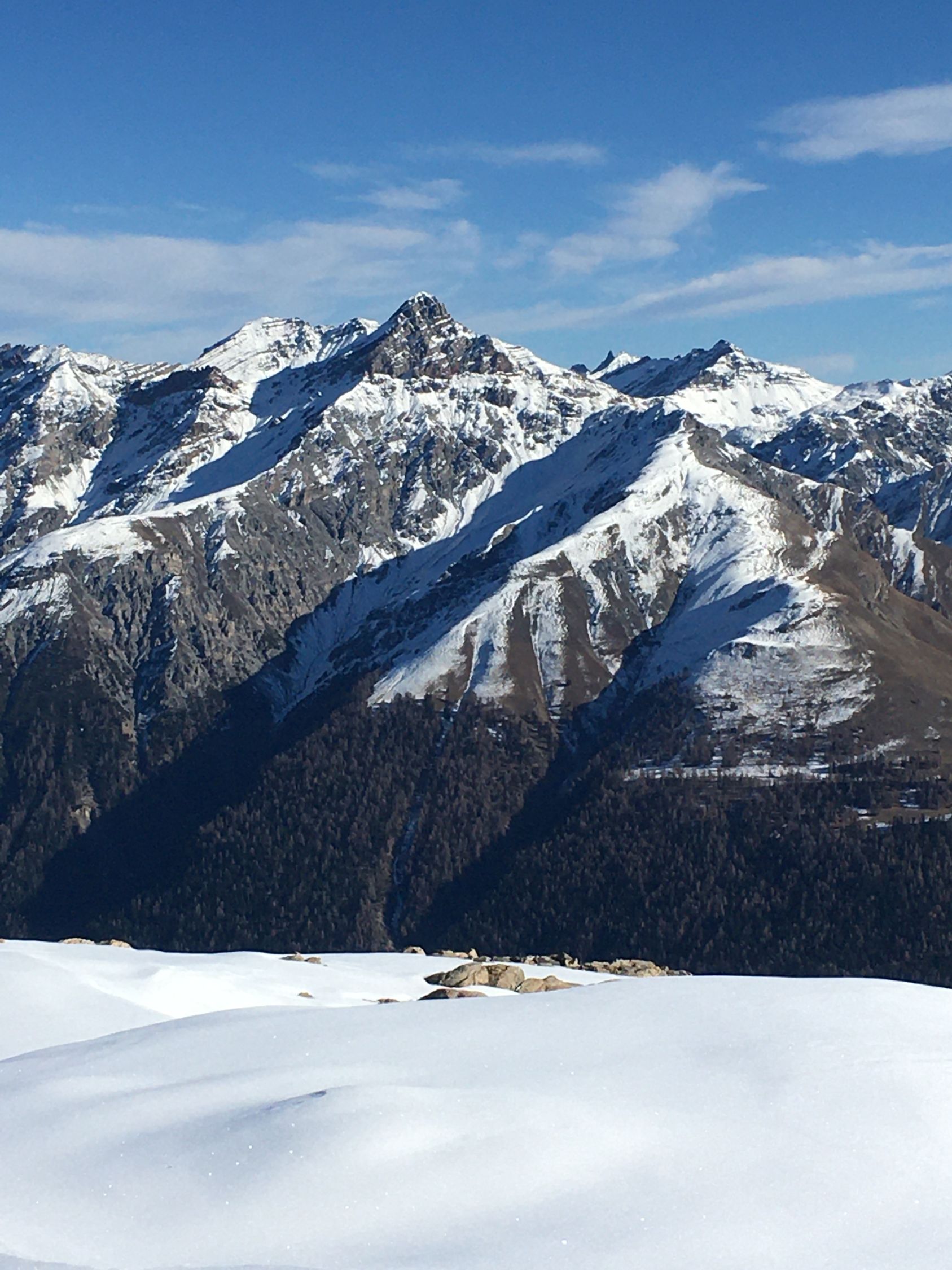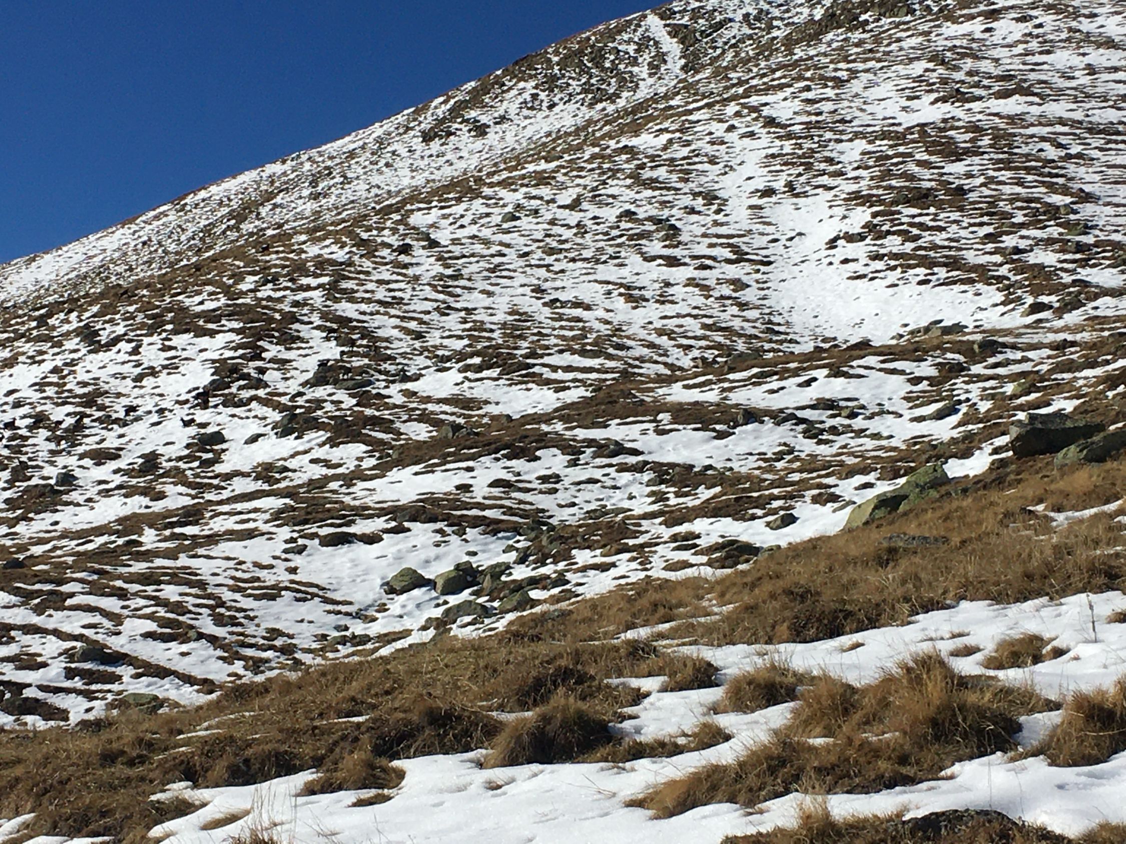 Start 8.45 Uhr Parkplatz Baubaracken Rocca Hotz zwischen Zuoz und S-chanf, minus 2 Grad, windstill. Ab 9 Uhr Sonne, Pause bei Alp Griatschouls, ein Raum im Alpgebäude ist das ganze Jahr geöffnet. Jetzt auf Alpsträsschen bis Ostrücken und dann weglos Richtung Gipfel. Ab Höhe 2550 m etwas Schnee und ab Höhe 2600 m ca, 20 cm Schnee, aber problemlos bis Gipfel. Auf dem schönen Aussichtsgipfel sehr kalt und windig. Abstieg wie Aufstieg.