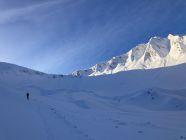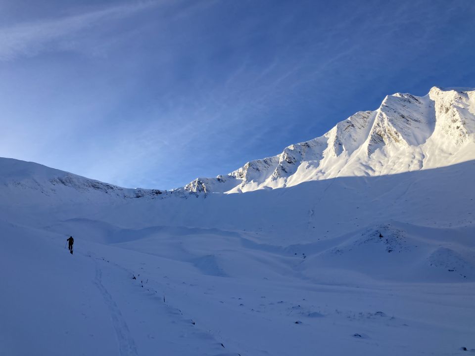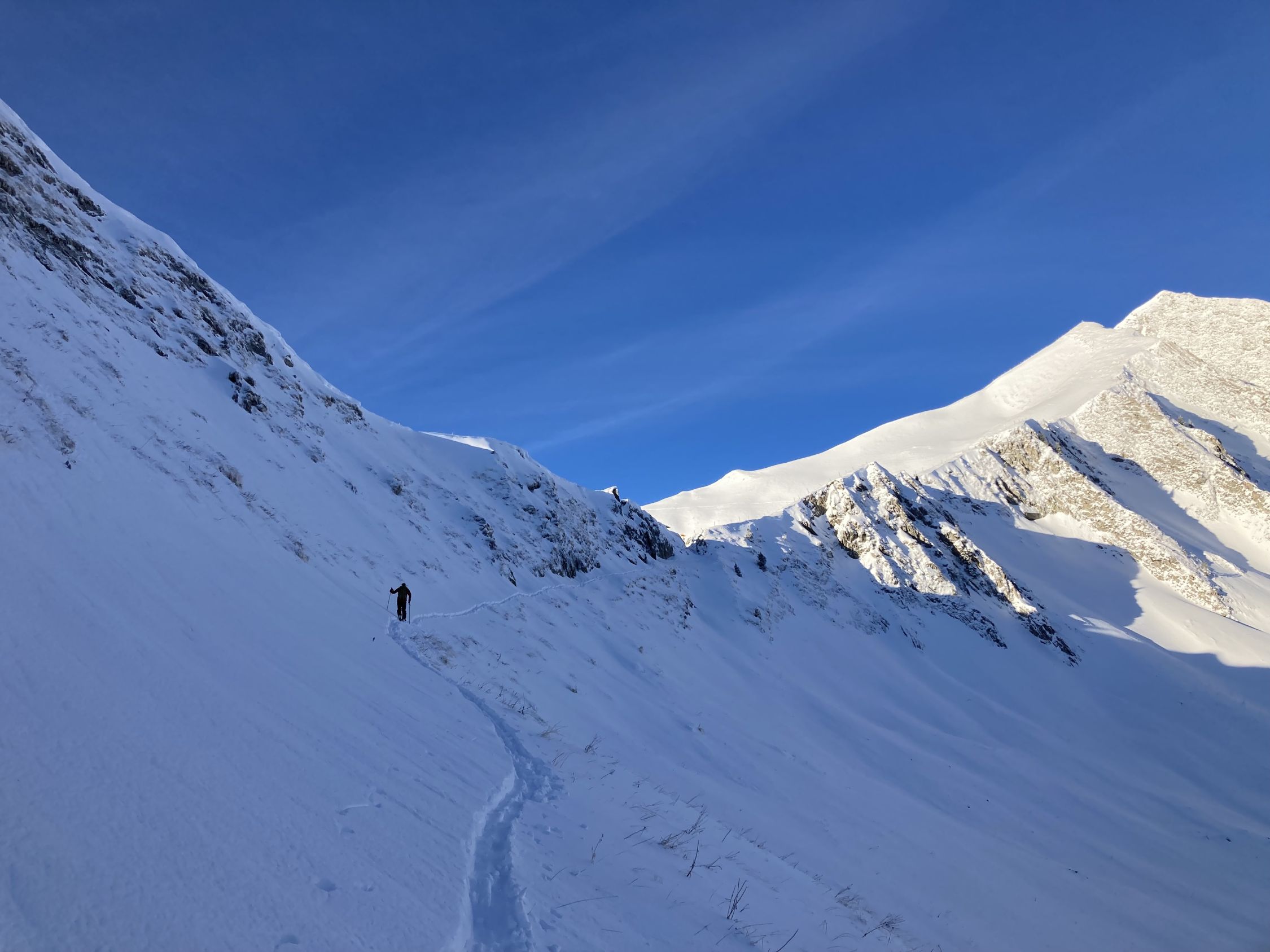 Beim Start am Parkplatz war nicht klar, ob Ski als Aufstiegsgerät die optimale Wahl darstellten. Die an der Station gemessenen 16cm schienen uns optimistisch. Der Aufstieg entlang der Fahrstrasse bis ins Chummli war aber super zu gehen (und wie sich herausstellen sollte, auch ohne Feindkontakt in der Abfahrt zu meistern). Danach wurde der Schnee häufiger und so war das gehen bis auf den Morgetepass angenehm (Dank an dieser Stelle dem unbekannten Spurer).
