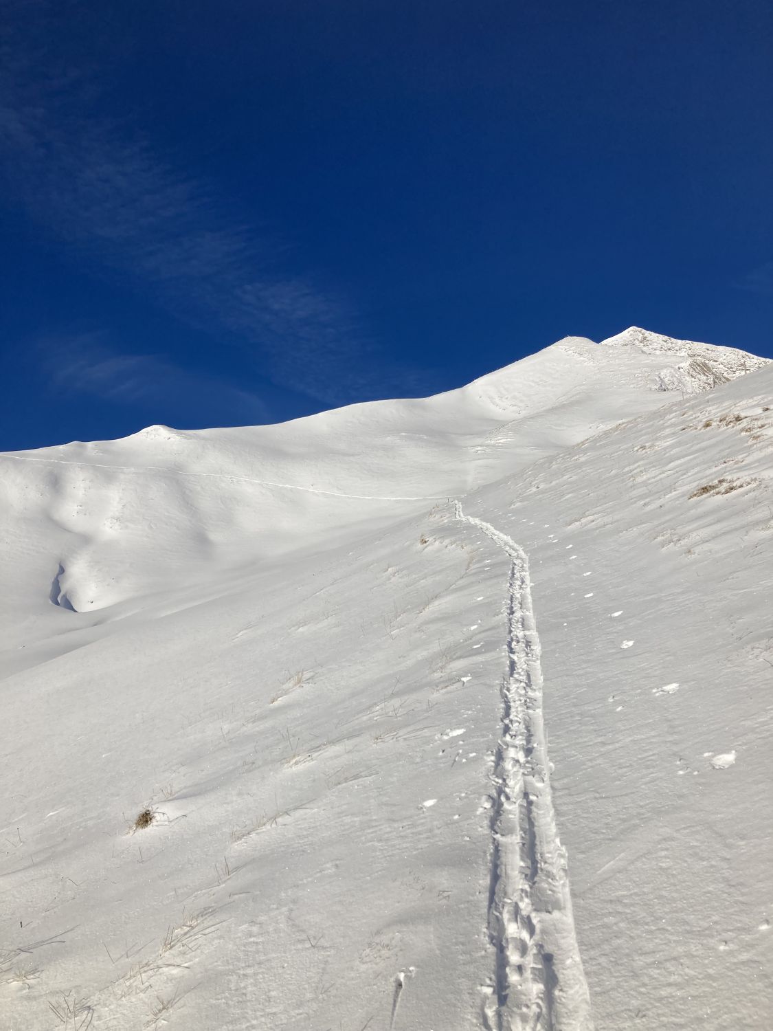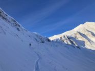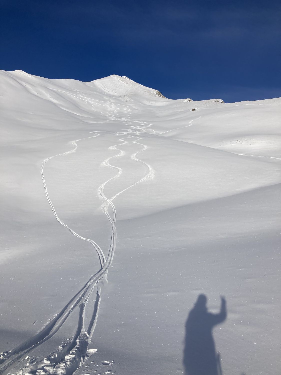 Was auf dem Pass zu sehen war, übertraf dann unsere Erwartungen bei weitem. Selbes galt auch für den Südhang der Bürglen, der sich (wider Erwarten) ohne Solaranlage aber mit c 30cm Pulver präsentierte. Süd- und Südosthang bis Obristi Morgete waren dann auch die Highlights in der Abfahrt, bevor es defensiv retour zum Parkplatz ging. Wir können uns aber an schlechtere Abfahrten an der Bürglen erinnern.